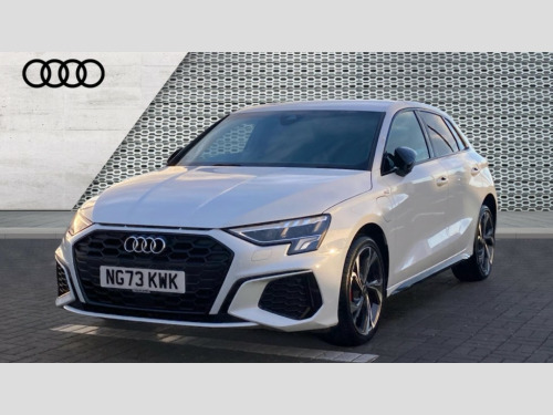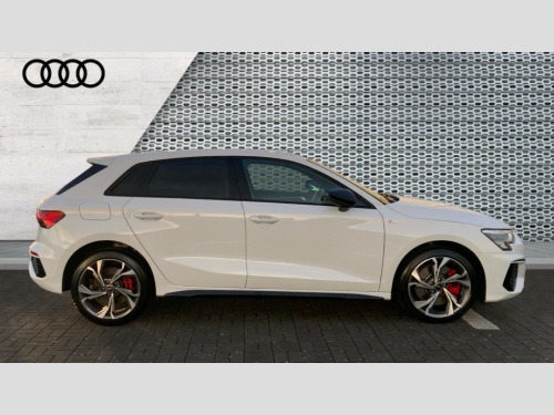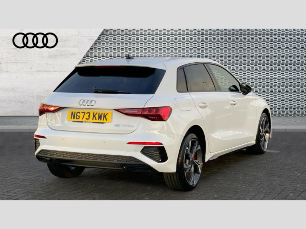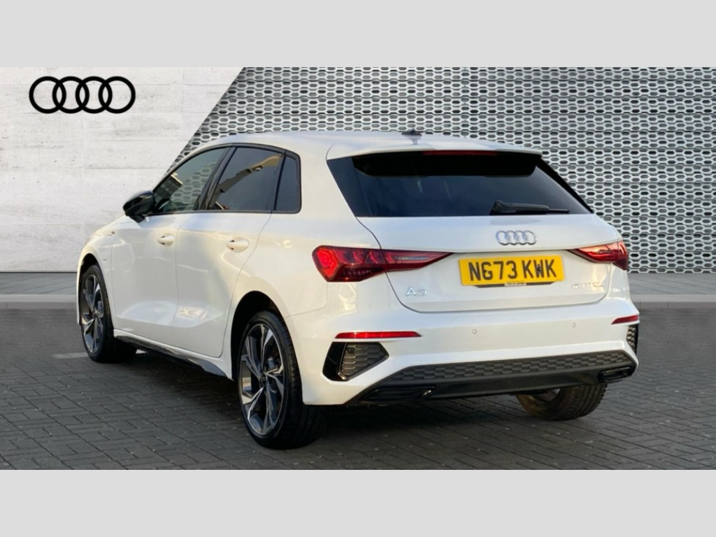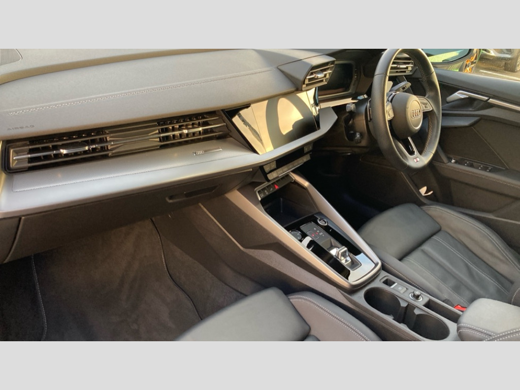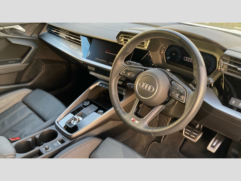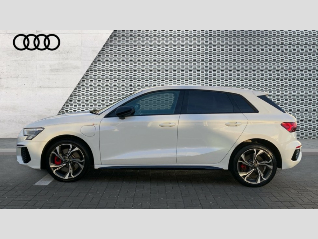 Audi A3 45 TFSI e S Line Competition 5dr S Tronic Audi drive select (Auto, Comfort, Dynamic, Efficiency and Individual), Audi smartphone interface, Audi Virtual Cockpit - 10.25" digital and colour instrument cluster, Automatic start/stop system with recuperation, Bluetooth interface, Camera based traffic sign recognition, Collision avoidance assistant, e-Call (emergency call), Electromechanical power speed sensitive steering, Lane departure warning system, MMI Navigation Plus with high resolution 10.1" colour touch screen display, Service indicator, Trip computer, Voice control system with natural language interaction, 2.9 kW On-board charger, 3 pin 10 amp domestic charging cable, Sports suspension, Type 2 mode 3 32 amp charging cable, Type 2 socket for AC charging, 2xUSB-C connection with data and charging functions, 6 passive loudspeakers, DAB Digital radio, 3rd brake light, Acoustic glass windscreen, Auto dimming frameless rear view mirror, Electrically adjustable/heated/folding/auto dimming door mirrors with integrated LED indications + kerb view function for passenger side, Front electric windows, Illuminated door sills with aluminium inserts at the front with S logo, LED daytime running lights, LED headlights with LED rear lights and dynamic rear indicators, Light and rain sensors, Privacy glass - dark tinted rear window, rear door and side windows, Rear electric windows, Rear side air outlets in grained matt black, Rear side wing doors, Rear wiper, S line bumpers, S roof spoiler, 12V socket and storage compartment in front centre console, 3 seat bench in 2nd row, 3 spoke leather multifunction steering wheel with paddle shift, 4 way electrically adjustable lumbar support for driver and front passenger, 60/40 split folding rear seat bench, Black cloth headlining, Dual zone electronic climate control, Front and rear centre armrest in artificial leather, Front and rear headrests, Front/rear floor mats, Height and reach adjustable steering wheel, Interior lighting - glove compartment light and right hand side, Luggage compartment floor covering, Manual boot compartment lid, Manually adjustable front seats, Seat side bolsters, Single front passenger seat, Stainless steel pedals and front footrest in black, Twin leather upholstery with front sports seats S embossed logo, Aluminium interior elements pack - A3 Sportback, Black styling pack - A3 Sportback, LED interior lighting pack - A3 Sportback, S line styling pack - A3 Sportback, 3x3 point rear seat belts, Driver and front passenger airbag with passenger airbag deactivation, Electronic Stabilisation Control (ESC) including ABS, ASR and EDL, First aid kit with warning triangle and 2 safety vests, Front side airbags with head airbags and interaction airbag, Pre-sense front with pedestrian and cyclist detection, Red brake calipers, Seatbelt monitoring, Tyre pressure loss indicator, Anti theft alarm, Anti-theft wheel bolts, Electronically operated child locks, Immobiliser, Remote control central locking, Dark spectrum aluminium inlays, accent surfaces in the dashboard and centre console in platinum grey silk effect paint finish, Tool kit, Tyre repair kit