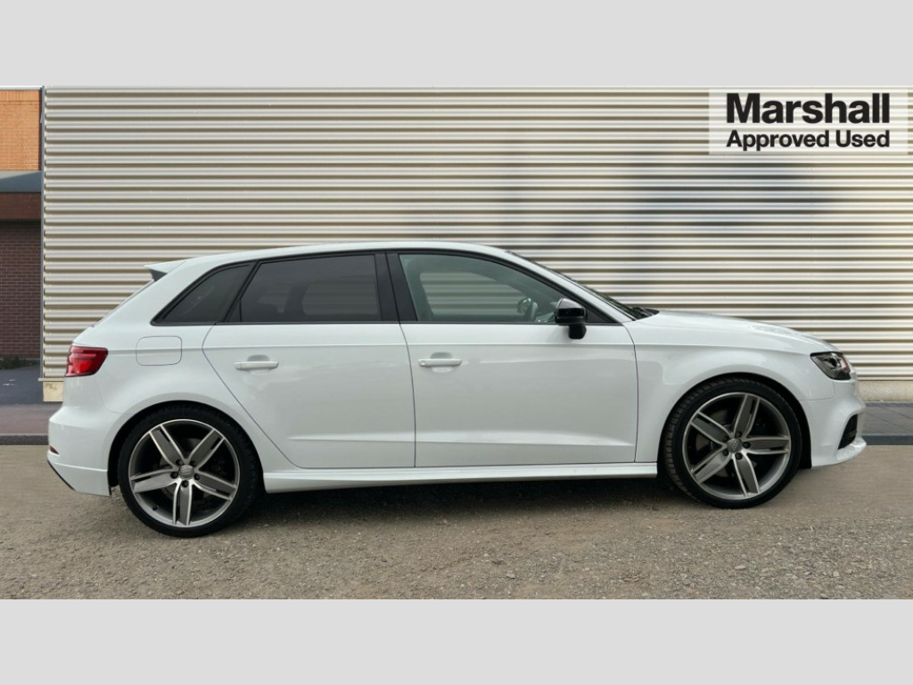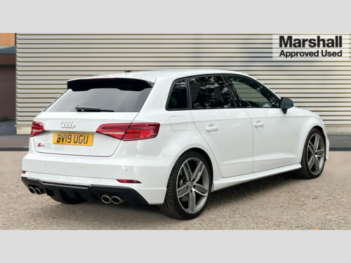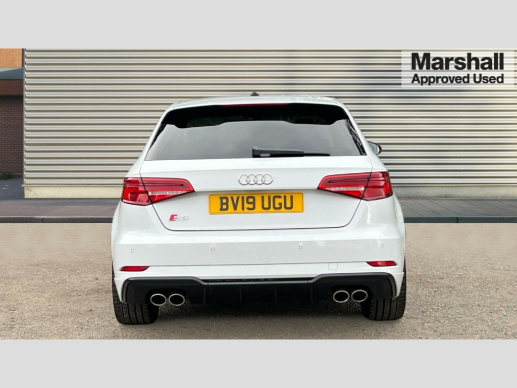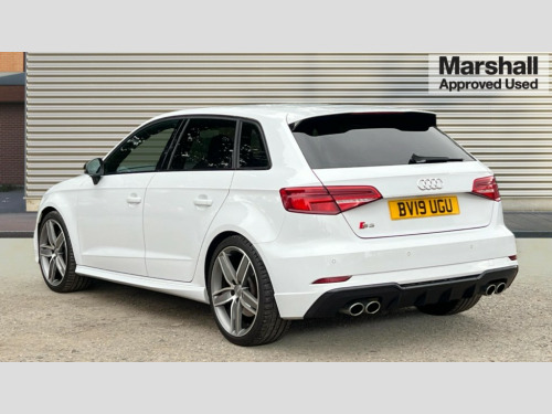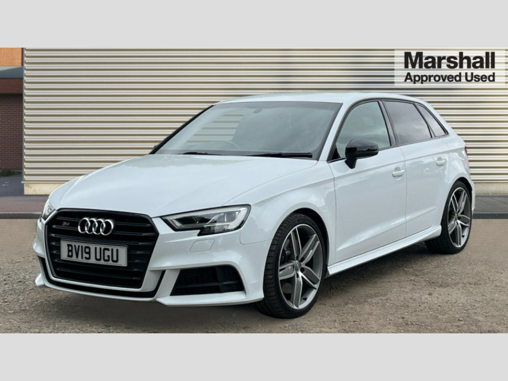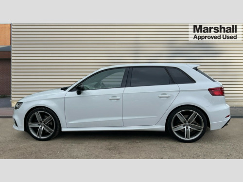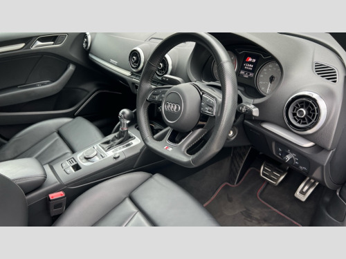 Audi A3 S3 TFSI 300 Quattro Black Edition 5dr S Tronic Audi connect, Audi drive select, Audi smartphone interface, Automatic start/stop system, Colour driver's information system display, Instrument dials with S3 logo, Mobile telephone preparation - bluetooth interface, Progressive power assisted steering, SD card based satellite navigation system, Service interval indicator, Speed limit display, Voice control system, Voice recognition for navigation system, S sports suspension, 2 USB interfaces and Aux-In jack, Audi music interface, Bang and Olufsen sound system, CD player, DAB Digital radio, MMI radio plus with 7" colour MMI screen and MMI controller, Audi Beam uses LEDs to project the Audi Sport logo, Auto dimming rear view mirror with light and rain sensors, Black door mirrors, Body colour roof spoiler with aerodynamic inserts in high gloss black, Electric front windows, Electric rear windows, Electrically adjustable and heated door mirrors with integrated LED side indicators, Headlight washers, Heated windscreen washer jets, LED daytime running lights, Privacy glass - dark tinted rear and rear side windows from B-pillar backwards, Rear wiper, Sport specific side air inlet grille and diffuser insert, Twin oval chrome trimmed exhaust tailpipes, 3 adjustable rear headrests, 4 lashing points to secure luggage, Adjustable front centre armrest, Black cloth headlining, Dual zone electronic climate control, Front and rear interior lights with delay, Front/rear floor mats, Glovebox light, Heated front seats, Height and reach adjustable steering wheel, Illuminated door sill trims with S logo, Isofix child seat preparation for front passenger/outer rear seats inc passenger airbag deactivation, Stainless steel pedals, Storage compartments in doors side trims, centre console and under front drivers seat, Black styling pack - A3/S3, LED interior light pack - A3/RS3, Non smoking pack - A3, Storage and luggage pack - A3/RS3, 3 point seatbelts on all seats, ABS/EBD, Active bonnet, Active front headrests, Airbags - front driver/passenger, front & rear side, curtain, drivers knee, ASR, EDL, Electromechanical parking brake, ESC - Electronic Stability Control + traction control, Front passenger airbag deactivation, Hill hold assist, Manual rear child locks, Multi-Collision braking, Seatbelt warning, Tyre pressure warning, Warning triangle and first aid kit, Anti theft alarm, Anti-theft wheel bolts, Remote control central locking, Thatcham category 1 alarm + immobiliser, Aluminium air vent surrounds, Aluminium trim elements, Matt brushed aluminium inlays, Tool kit, Tyre repair kit