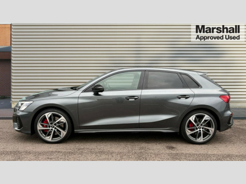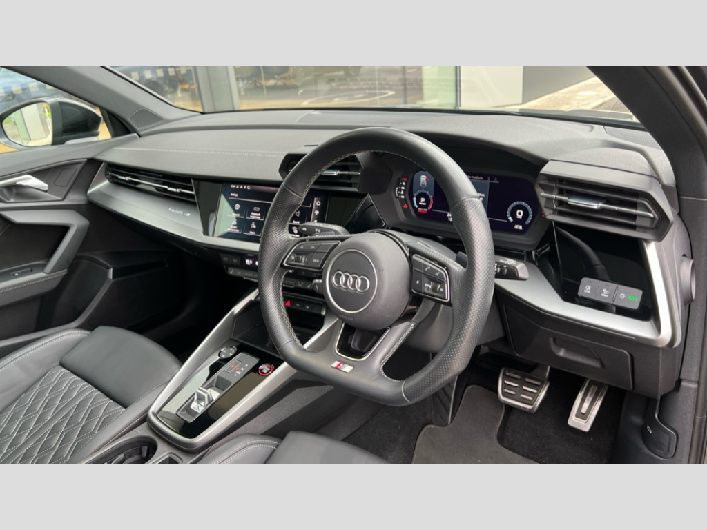 Audi A3 S3 TFSI Quattro 5dr S Tronic Audi connect emergency call and service, Audi drive select (Auto, Comfort, Dynamic, Efficiency and Individual), Audi smartphone interface, Audi Virtual Cockpit - 10.25" digital and colour instrument cluster, Automatic start/stop system with recuperation, Bluetooth interface, Collision avoidance assistant, Lane departure warning system, MMI Navigation Plus with high resolution 10.1" colour touch screen display, Progressive steering, Service indicator, Trip computer, Voice control system with natural language interaction, Quattro permanent all wheel drive, S sports suspension, 2xUSB-C connection with data and charging functions, 6 passive loudspeakers, DAB Digital radio, Acoustic glass windscreen, Aluminium window trim, Audi Beam uses LEDs to project the Audi S3 logo, Auto dimming frameless rear view mirror, Dual branch oval twin tailpipes in chrome plated finish, Exterior mirror with aluminium look housing, Front electric windows, Illuminated aluminium inserts front door sills with S logo, LED daytime running lights, Light and rain sensors, Privacy glass - dark tinted rear window, rear door and side windows, Rear electric windows, Rear side air outlets in grained matt black, Rear wiper, 12V socket and storage compartment in front centre console, 3 spoke flat bottomed multifunction plus sports contour leather wrapped steering wheel with shift paddles, 40/20/40 split folding rear seat bench with cupholder, Black cloth headlining, Dual zone electronic climate control, Front and rear centre armrest in leather, Front and rear headrests, Front/rear floor mats, Heated front seats, Height and reach adjustable steering wheel, Interior lighting - glove compartment light and right hand side, Luggage compartment floor covering, Seat side bolsters, Stainless steel pedals and front footrest, Aluminium interior elements pack - A3 Sportback, Design body styling - A3 Sportback, Storage pack - A3 Sportback, 3x3 point rear seat belts, Driver and front passenger airbag with passenger airbag deactivation, Electronic Stabilisation Control (ESC) including ABS, ASR and EDL, First aid kit with warning triangle and 2 safety vests, Front side airbags with head airbags and interaction airbag, Hill hold assist, Pre-sense front with pedestrian and cyclist detection, Seatbelt monitoring, Tyre pressure loss indicator, Anti theft alarm, Anti-theft wheel bolts, Electronically operated child lock, Immobiliser, Remote control central locking, Accent surfaces in the dashboard and centre console in platinum grey silk effect paint finish, Dark spectrum aluminium inlays