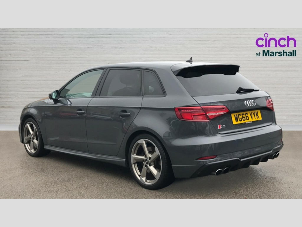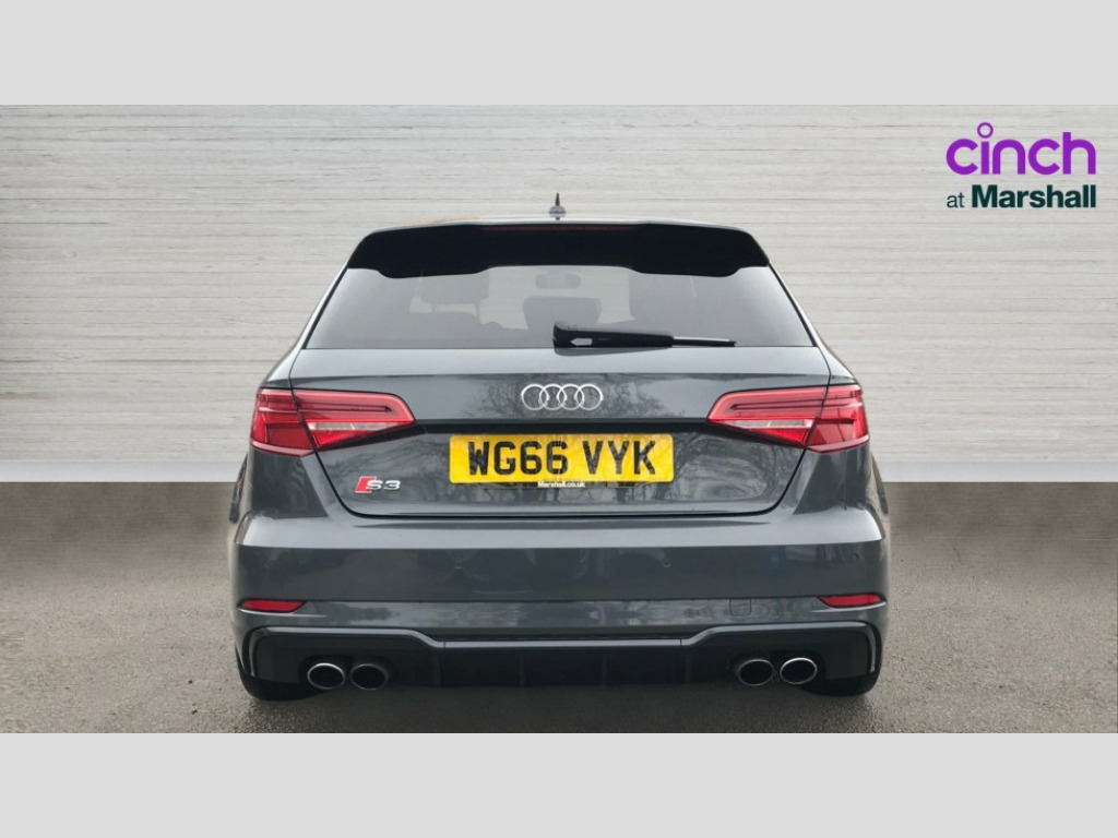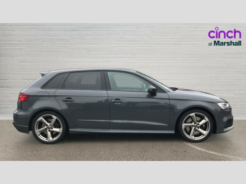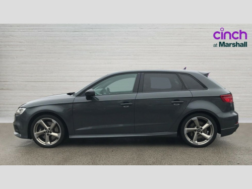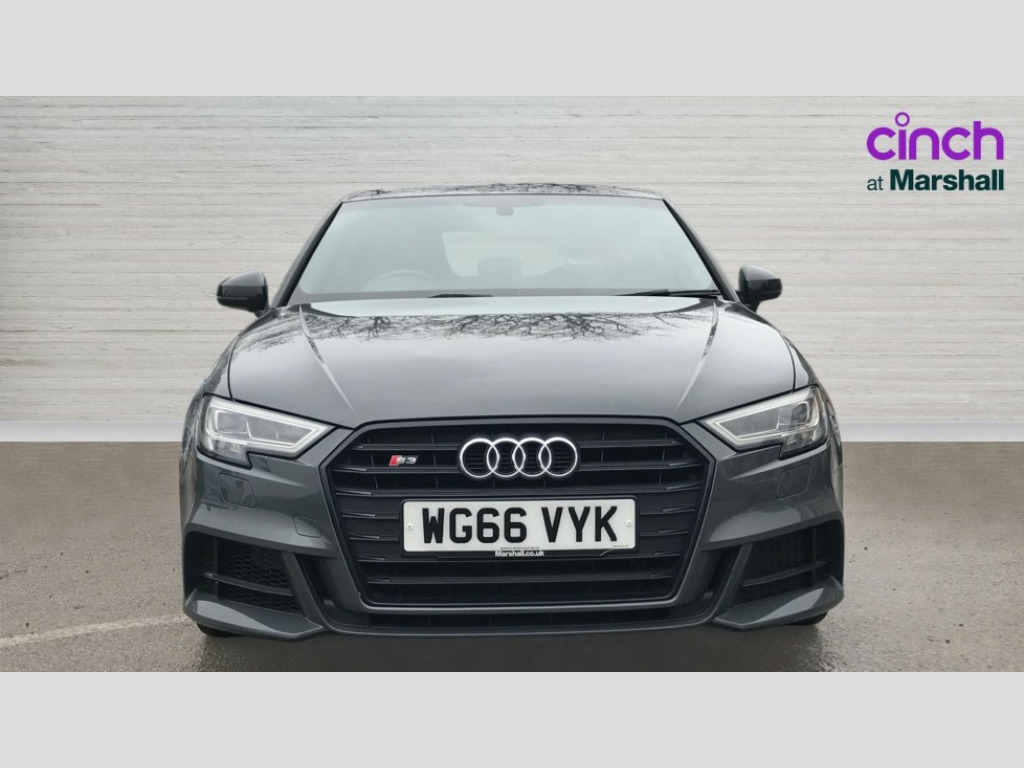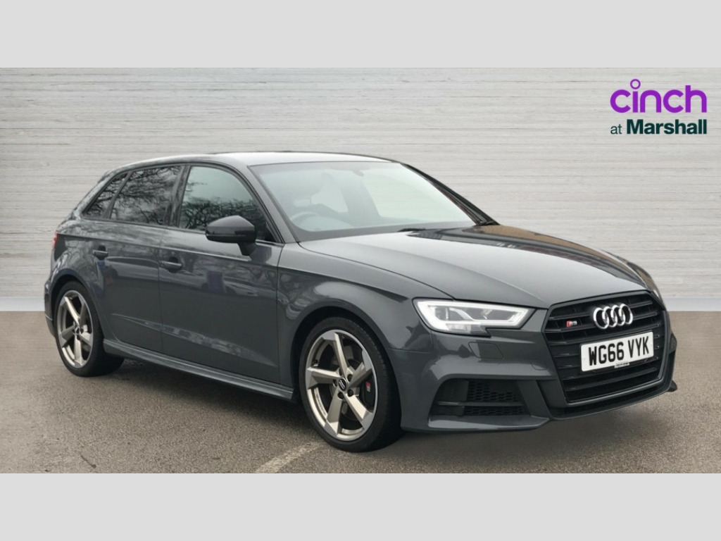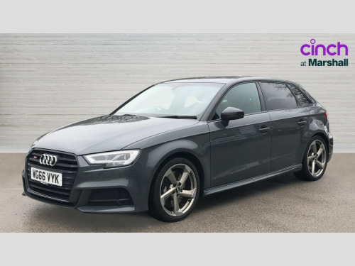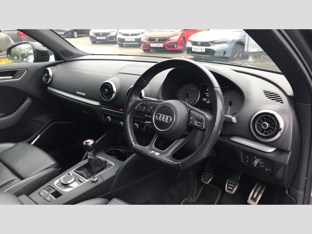 Audi A3 S3 TFSI Quattro Black Edition 5dr Audi connect, Audi drive select, Audi smartphone interface, Colour driver's information system display, Mobile telephone preparation - bluetooth interface, Progressive power assisted steering, Service interval indicator, Speed limit display, Voice control system, S sports suspension, 2 USB ports, Audi music interface, Auxiliary input socket, Bang + Olufsen advanced sound system, DAB Digital radio, Black door mirrors, Black window surrounds, Body colour bumpers with black insert, Body colour roof spoiler, Electric front windows, Electric operated/heated door mirrors, Electric rear windows, Headlight washers, Heated windscreen washer jets, LED daytime running lights, Matt black radiator grille, Platinum grey radiator grille with double chrome bars, Privacy glass, Rear wiper, S body styling, Twin oval chrome trimmed exhaust tailpipes, 3 adjustable rear headrests, 3 spoke flat bottomed multi-function leather steering wheel, 4 lashing points to secure luggage, Adjustable front armrest, Black cloth headlining, Dual zone electronic climate control, Front and rear interior lights with delay, Front passenger seat isofix location point, Front/rear floor mats, Heated front seats, Height/depth adjustable steering column, Illuminated glovebox, ISOFIX child seat preparation+airbag deactivation, Jack and tool kit, Stainless steel pedals, Storage compartment in centre console, Storage compartment under front seats, Storage compartments in doors, Black styling pack - A3/S3, LED interior light pack - A3/RS3, Light and rain sensor pack - A3 Hatchback/Sportback, Storage and luggage pack - A3/RS3, 3 point seatbelts on all seats, ABS/EBD, Active bonnet, Active front headrests, ASR, Curtain airbags, Driver and passenger side airbags, Driver/Front Passenger airbags, Drivers knee airbag, EDL, Electromechanical parking brake, ESC - Electronic Stability Control + traction control, Front passenger airbag deactivation, Manual rear child locks, Multi-Collision braking, Seatbelt warning, Tyre pressure monitor, Warning triangle and first aid kit, Anti theft alarm, Anti-theft wheel bolts, Remote control central locking, Thatcham category 1 alarm + immobiliser, Aluminium air vent surrounds, Aluminium trim elements, Space saver spare wheel
