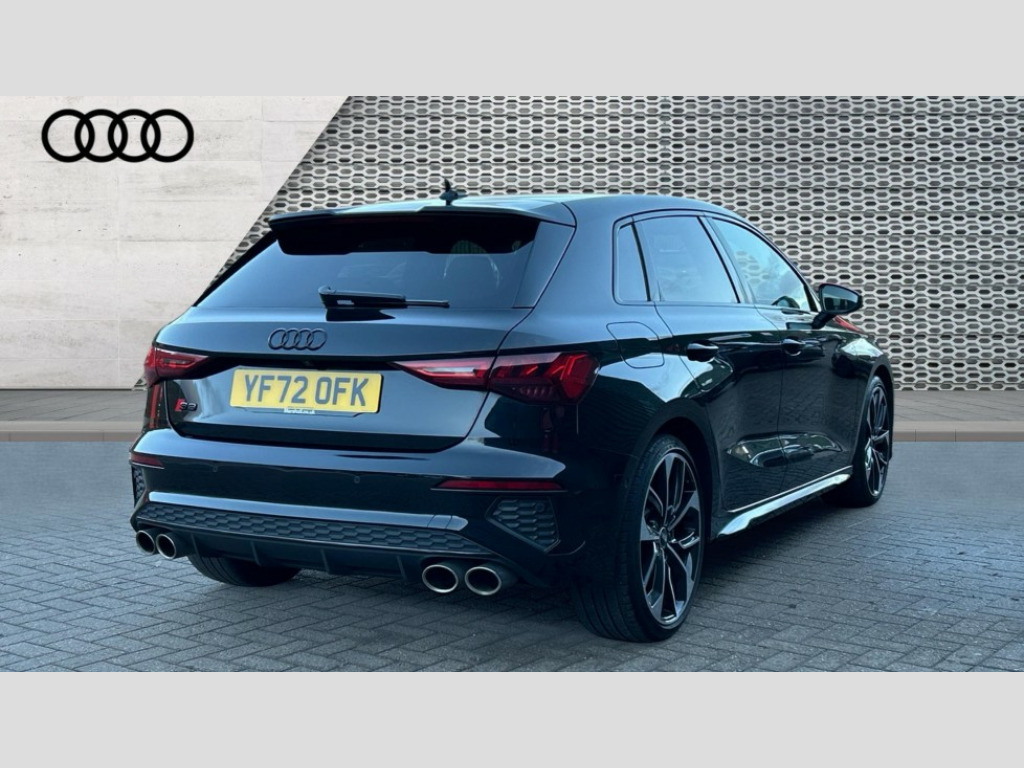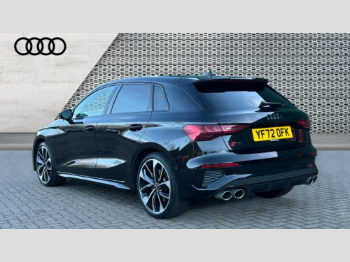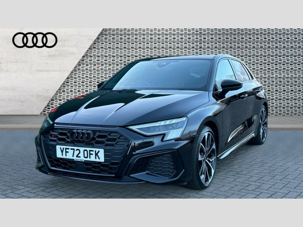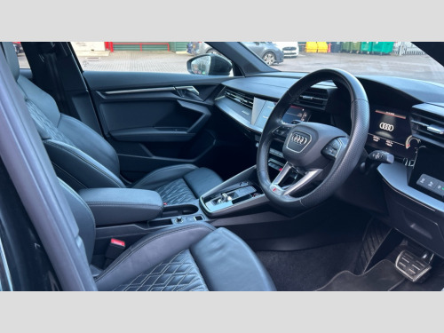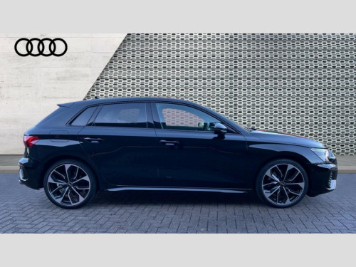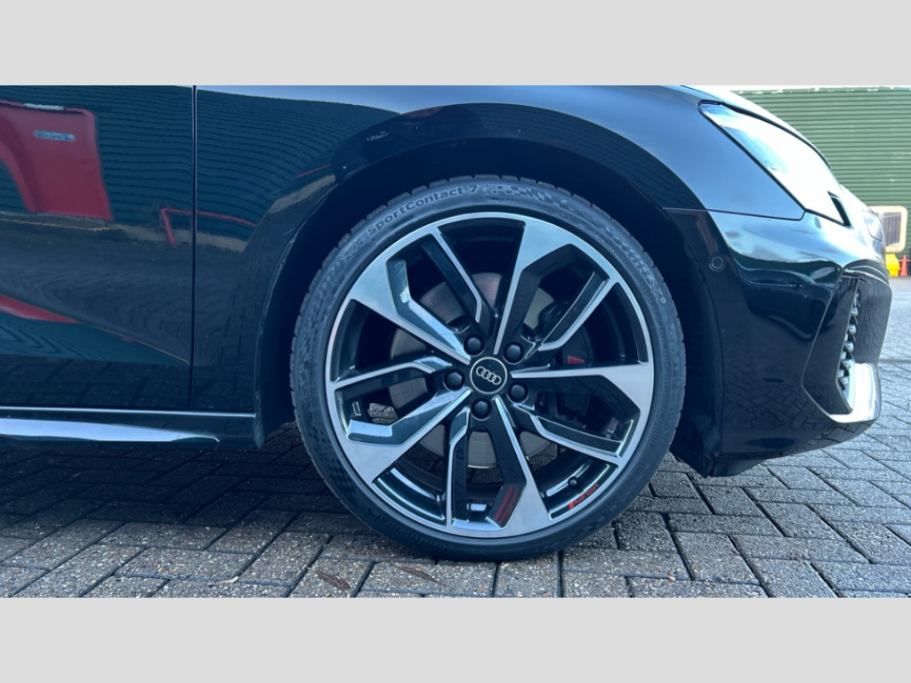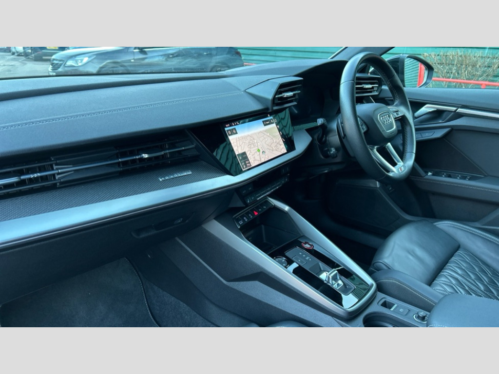 Audi A3 S3 TFSI Quattro Vorsprung 5dr S Tronic Audi drive select (Auto, Comfort, Dynamic, Efficiency and Individual), Audi smartphone interface, Audi virtual cockpit plus - 12.3" full HD resolution dynamic digital instrument cluster, Automatic start/stop system with recuperation, Bluetooth interface, Collision avoidance assistant, e-Call (emergency call), Head up Display, Lane change assistant with exit warning system and rear cross traffic alert, Lane departure warning system, MMI Navigation Plus with high resolution 10.1" colour touch screen display, Power operated tailgate - Luggage compartment lid opens electrically, Progressive steering, Service indicator, Trip computer, Voice control system with natural language interaction, Quattro permanent all wheel drive, S suspension with damper control, 2xUSB-C connection with data and charging functions, DAB Digital radio, 3rd brake light, Acoustic glass windscreen, Audi Beam uses LEDs to project Vorsprung logo, Audi matrix LED headlights, LED rear lights, dynamic front and rear indicators and headlight cleaning system, Auto dimming frameless rear view mirror, Electrically adj heated/folding + automatically dimming exterior mirrors with memory + automatic kerb side function for passenger side exterior mirror, Front electric windows, Headlight washers, Illuminated aluminium inserts front door sills with S logo, Integrated LED indicators in door mirrors, LED daytime running lights, Light and rain sensors, Panoramic glass sunroof, Privacy glass - dark tinted rear window, rear door and side windows, Rear electric windows, Rear side air outlets in grained matt black, Rear side wing doors, Rear wiper, 12V socket and storage compartment in front centre console, 3 seat bench in 2nd row, 3 spoke leather multifunction steering wheel with paddle shift, 4 way electrically adjustable lumbar support for driver and front passenger, 40/20/40 split folding rear seat bench with cupholder, Black cloth headlining, Dual zone electronic climate control, Electrically adjustable front seats with memory function for driver's side, Front and rear headrests, Front/rear floor mats, Height and reach adjustable steering wheel, Interior lighting - glove compartment light and right hand side, Luggage compartment floor covering, Seat side bolsters, Single front passenger seat, Stainless steel pedals and front footrest in black, Aluminium interior elements pack - A3 Sportback, Black styling pack - A3 Sportback Vorsprung, Comfort and sound pack - A3, Design body styling - A3 Sportback, Driver assistance package - A3 Sportback, Extended ambient lighting pack - A3 Sportback, Storage pack - A3 Sportback, 3x3 point rear seat belts, Audi pre sense front, Driver and front passenger airbag with passenger airbag deactivation, Electronic Stabilisation Control (ESC) including ABS, ASR and EDL, First aid kit with warning triangle and 2 safety vests, Front side airbags with head airbags and interaction airbag, Pre-sense front with pedestrian and cyclist detection, Seatbelt monitoring, Tyre pressure loss indicator, Advanced key, Anti theft alarm, Anti-theft wheel bolts, Electronically operated child lock, Immobiliser, Remote control central locking, Carbon inlays, accent surfaces in the dashboard and centre console in platinum grey silk effect paint finish