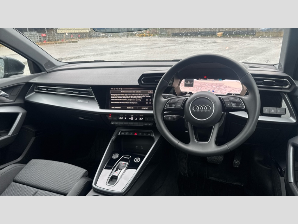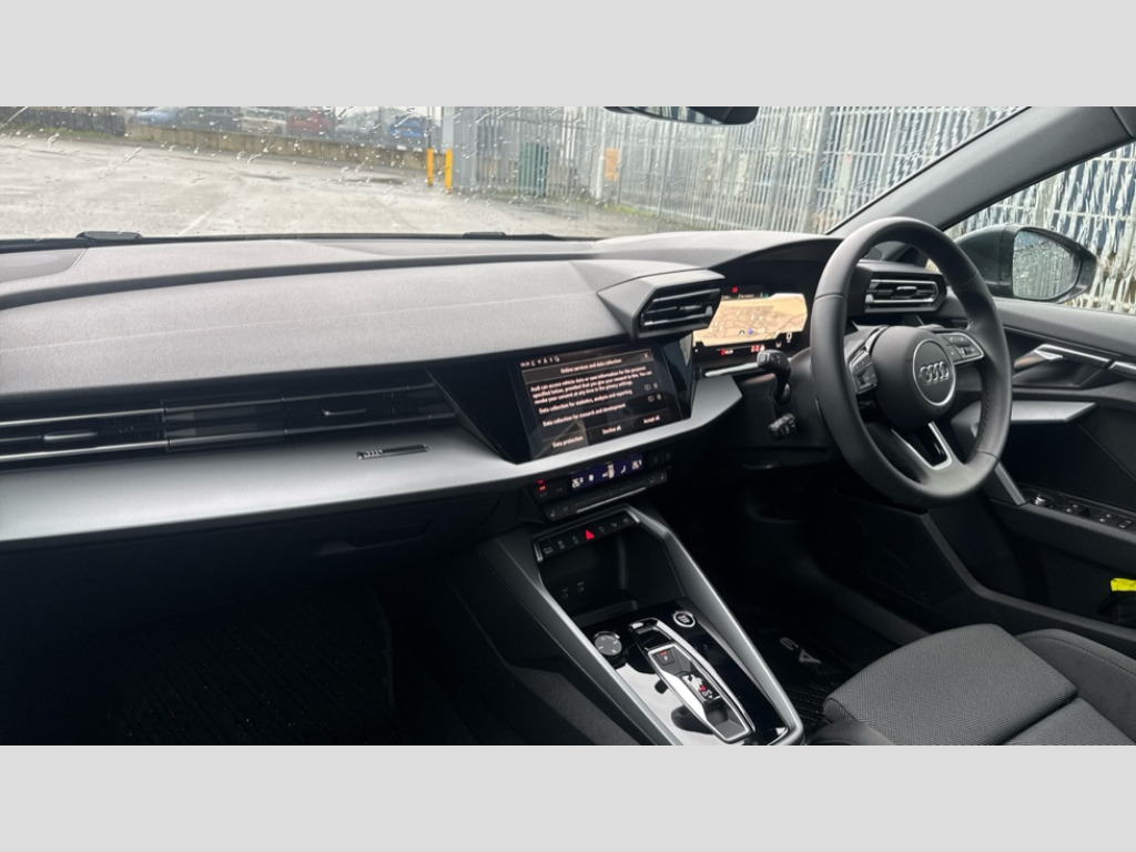 Audi A3 1.5 TFSI 116 Sport 4dr S Tronic Adaptive cruise control (ACC), Adjustable speed limiter, Audi drive select (Auto, Comfort, Dynamic, Efficiency and Individual), Audi virtual cockpit plus - 12.3" full HD resolution dynamic digital instrument cluster, Automatic start/stop system with recuperation, Bluetooth interface, Camera based traffic sign recognition, Collision avoidance assistant, Driver attention and fatigue detection, e-Call (emergency call), Electromechanical power speed sensitive steering, Emergency assist, Intersection assist, Lane departure warning system, MMI Navigation Plus with high resolution 10.1" colour touch screen display, Park Assist with parking system Plus, Reversing camera, Service indicator, Smartphone interface with app store includes wireless Apple carplay, Android auto and Amazon alexa integration, Trip computer, Voice control system with natural language interaction, Standard suspension, Audi Phonebox light with wireless charging, Audi sound system - 10 loudspeakers including centre loudspeaker and subwoofer, DAB Digital radio, USB ports with charging function in the rear, 3rd brake light, Acoustic glass windscreen, Aluminium window trim, Auto dimming frameless rear view mirror, Body colour exterior mirrors, Electrically adjustable/heated/folding/auto dimming door mirrors with integrated LED indications + kerb view function for passenger side, Exterior model badging, Front electric windows, Front radiator grill in high gloss dark chrome, Front side air inlets in grained matt black with silver frame, Heat insulating glass windscreen, LED daytime running lights, LED headlights and halogen rear lights, Light and rain sensors, Rear boot, Rear diffuser and grill in grained matt black with silver frame, Rear electric windows, Rear side wing doors, Rear window, rear door windows and rear side windows in clear glass, 12V socket and storage compartment in front centre console, 3 seat bench in 2nd row, 3 spoke leather multifunction steering wheel with gear shift paddles, 3-zone deluxe automatic air conditioning, 4 way electrically adjustable lumbar support for driver and front passenger, 60/40 split folding rear seat bench, Black front and rear floor mats, Front and rear headrests, Front centre armrest, Front door sill trims with aluminium inlay, Heated front seats, Height and reach adjustable steering wheel, i-Size child seat mounting on the front passenger side and outer rear seats, i-Size and top tether on the outer rear seats, Manual boot compartment lid, Manually adjustable front seats, Routine cloth upholstery with front sports seats, Seat side bolsters, Single front passenger seat, Steel grey cloth headlining, Aluminium interior elements pack - A3, LED interior lighting pack -A3, 3x3 point rear seat belts, Driver and front passenger airbag with passenger airbag deactivation, Electronic Stabilisation Control (ESC) including ABS, ASR and EDL, First aid kit with warning triangle and 2 safety vests, Front side airbags with head airbags and interaction airbag, Hill hold assist, Pre-sense front with pedestrian and cyclist detection, Seatbelt monitoring, Tyre pressure loss indicator, Anti theft alarm, Anti-theft wheel bolts, Electronically operated child locks, Immobiliser, Black dashboard, Inlays in volcano grey fine paint finish