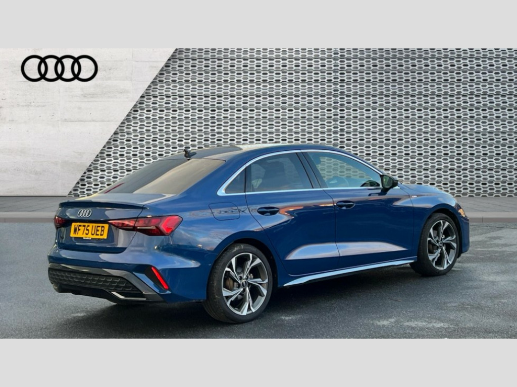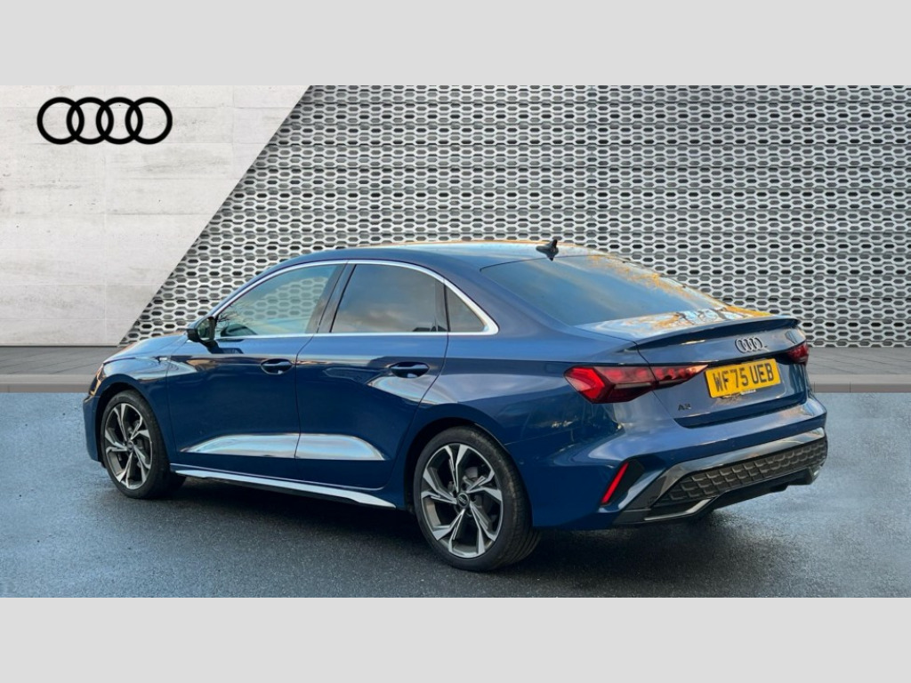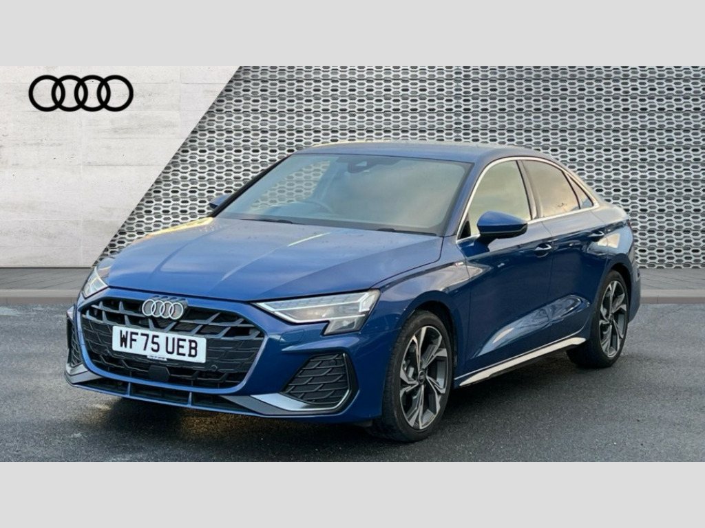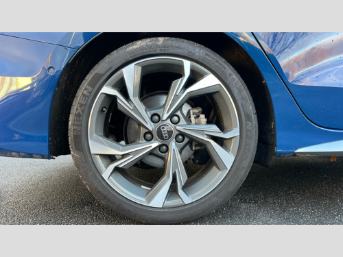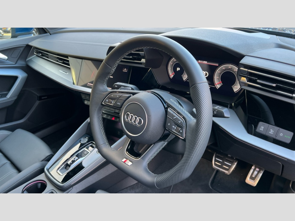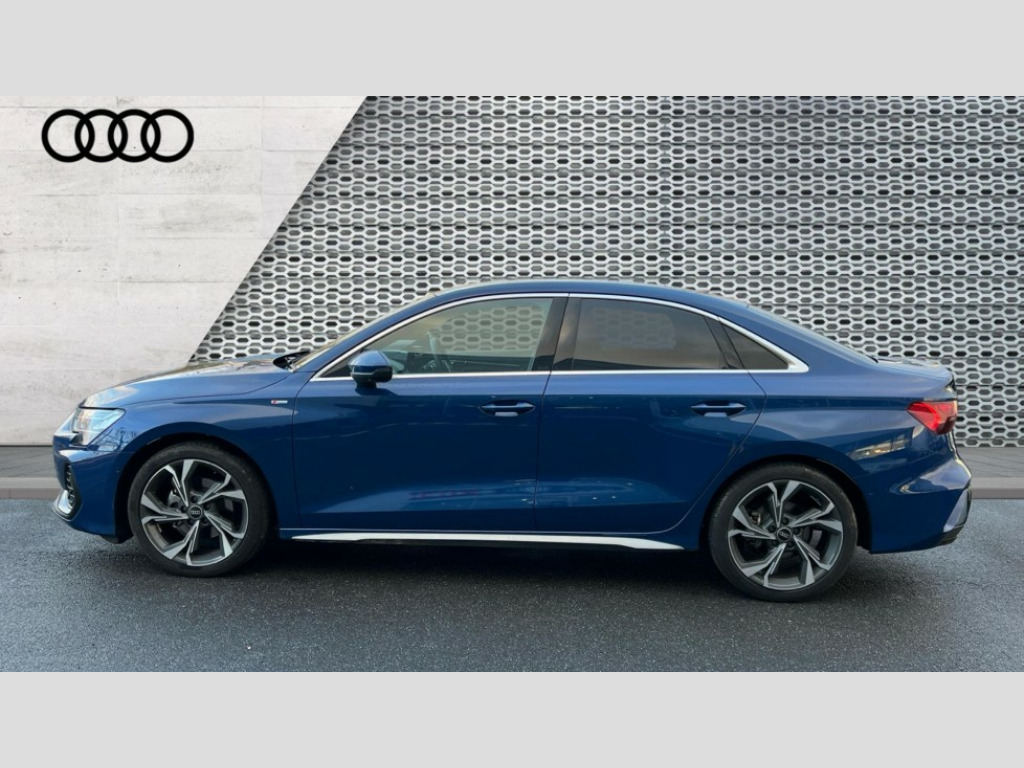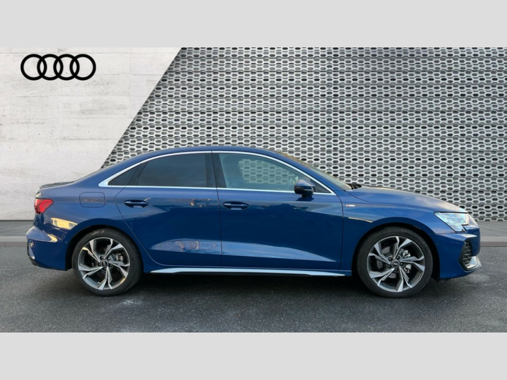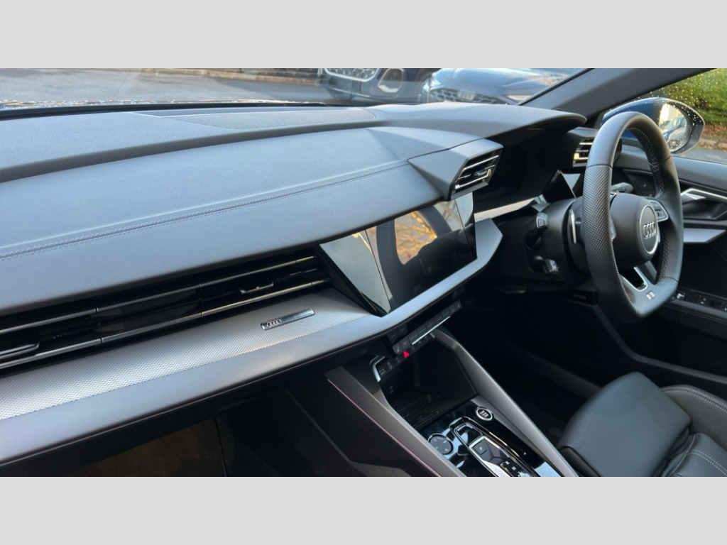 Audi A3 35 TFSI S Line 4dr S Tronic Adjustable speed limiter, Audi drive select, Audi smartphone interface with app store includes wireless Apple carplay, Android auto and Amazon alexa integration, Audi virtual cockpit plus - 12.3" full HD resolution dynamic digital instrument cluster, Automatic start/stop system with recuperation, Bluetooth interface, Camera based traffic sign recognition, Collision avoidance assistant, Cruise control, Distraction and Fatigue warning, e-Call (emergency call), Electromechanical power speed sensitive steering, Emergency assist, Lane departure warning system, MMI Navigation Plus with high resolution 10.1" colour touch screen display, Park Assist with parking system Plus, Service indicator, Trip computer, Voice control system with natural language interaction, Sports suspension, Audi Phonebox light with wireless charging, Audi sound system - 10 loudspeakers including centre loudspeaker and subwoofer, DAB Digital radio, USB ports with charging function in the rear, Acoustic glass windscreen, All weather light, Aluminium window trim, Auto dimming frameless rear view mirror, Automatic dynamic range control, Body colour exterior mirrors, Chrome exhaust tailpipes, Dipped beam, main beam, position light and turning light, Electrically adjustable/heated/folding/auto dimming door mirrors with integrated LED indications + kerb view function for passenger side, Exterior model badging, Front and rear side air inlets in grained matt black with dark liquid chrome frame, Front electric windows, Front radiator grill in high gloss dark chrome, Heat insulating glass windscreen, Illuminated door sills with aluminium inserts at the front with S logo, Intersection light, LED 3rd brake light, LED brake lights, LED daytime running x3, LED headlights with LED rear lights and dynamic rear indicators, LED rear number plate lights, LED reverse light, LED tail lights, Light and rain sensors, Manoeuvring light, Motorway light, Privacy glass - dark tinted rear window, rear door and side windows, Rear boot, Rear diffuser and grill in grained matt black with inlay in dark liquid chrome, Rear electric windows, Rear side wing doors, S line bumpers, Side S line emblems on front wings, Side sill trim in dark liquid chrome, Static cornering light, 12V socket and storage compartment in front centre console, 3 seat bench in 2nd row, 3 spoke flat bottomed leather multifunction sport steering wheel with gear shift paddles, 3-zone deluxe automatic air conditioning, 4 way electrically adjustable lumbar support for driver and front passenger, 40/20/40 split folding rear seat bench, Black cloth headlining, Black front and rear floor mats, Front and rear centre armrest in artificial leather with contrasting stitching on armrests and instrument panel, Front and rear headrests, Heated front seats, Height and reach adjustable steering wheel, Manual boot compartment lid, Manually adjustable front seats, Rear centre armrest with cupholder, S badging on the steering wheel, Seat side bolsters, Single front passenger seat, Stainless steel pedals and front footrest in black, Twin leather upholstery with front sports seats S embossed logo, Aluminium interior elements pack - A3, Multi-coloured LED interior lighting package with Multi-coloured contour lighting of instrument panel - A3, 3x3 point rear seat belts, Driver and front passenger airbag with passenger airbag deactivation, Electronic Stabilisation Control (ESC) including ABS, ASR and EDL, First aid kit with warning triangle and 2 safety vests, Front side airbags with head airbags and interaction airbag, Hill hold assist, Pre-sense front with pedestrian and cyclist detection, Seatbelt monitoring, Tyre pressure loss indicator, Anti theft alarm, Anti-theft wheel bolts, Electronically operated child locks, Immobiliser, Remote central locking with safelock, Black dashboard, Inlay in dark aluminium spectrum
