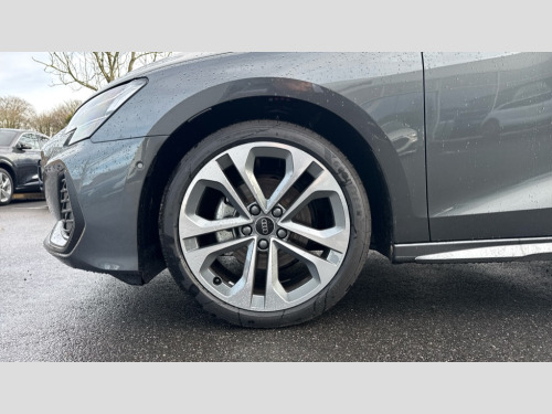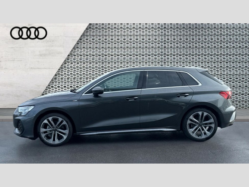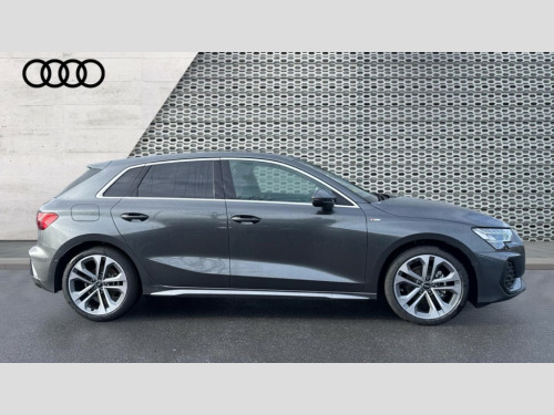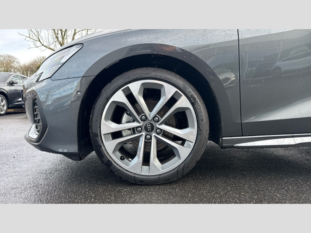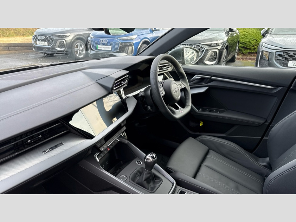 Audi A3 1.5 TFSI 150 S Line 5dr Adaptive cruise control (ACC), Adjustable speed limiter, Audi drive select (Auto, Comfort, Dynamic, Efficiency and Individual), Audi virtual cockpit plus - 12.3" full HD resolution dynamic digital instrument cluster, Automatic start/stop system with recuperation, Bluetooth interface, Camera based traffic sign recognition, Collision avoidance assistant, Driver attention and fatigue detection, e-Call (emergency call), Electromechanical power speed sensitive steering, Intersection assist, Lane departure warning system, MMI Navigation Plus with high resolution 10.1" colour touch screen display, Park Assist with parking system Plus, Reversing camera, Service indicator, Smartphone interface with app store includes wireless Apple carplay, Android auto and Amazon alexa integration, Trip computer, Voice control system with natural language interaction, Sports suspension, Audi Phonebox light with wireless charging, DAB Digital radio, USB ports with charging function in the rear, Aluminium window trim, Auto dimming frameless rear view mirror, Body colour exterior mirrors, Electrically adjustable/heated/folding/auto dimming door mirrors with integrated LED indications + kerb view function for passenger side, Exterior model badging, Front and rear side air inlets in grained matt black with dark liquid chrome frame, Front electric windows, Front radiator grill in high gloss dark chrome, Heat insulating glass windscreen, Illuminated door sills with aluminium inserts at the front with S logo, Invisible tailpipe, LED 3rd brake light, Light and rain sensors, Privacy glass - dark tinted rear window, rear door and side windows, Rear diffuser and grill in grained matt black with inlay in dark liquid chrome, Rear electric windows, Rear side wing doors, Rear wiper, S line bumpers, S roof spoiler, Side S line emblems on front wings, Side sill trim in dark liquid chrome, 12V socket and storage compartment in front centre console, 3 seat bench in 2nd row, 3 spoke flat bottomed multi-function leather sport steering wheel, 3-zone deluxe automatic air conditioning, 4 way electrically adjustable lumbar support for driver and front passenger, 40/20/40 split folding rear seat bench, Black cloth headlining, Black front and rear floor mats, Front and rear centre armrest in artificial leather with contrasting stitching on armrests and instrument panel, Front and rear headrests, Heated front seats, Height and reach adjustable steering wheel, i-Size child seat mounting on the front passenger side and outer rear seats, i-Size and top tether on the outer rear seats, Manual boot compartment lid, Manually adjustable front seats, Rear centre armrest with cupholder, S badging on the steering wheel, Seat side bolsters, Single front passenger seat, Stainless steel pedals and front footrest in black, Twin leather upholstery with front sports seats S embossed logo, Aluminium interior elements pack - A3, Multi-coloured LED interior lighting package with Multi-coloured contour lighting of instrument panel - A3, Technology pack with Matrix LED headlights - A3, 3x3 point rear seat belts, Driver and front passenger airbag with passenger airbag deactivation, Electronic Stabilisation Control (ESC) including ABS, ASR and EDL, First aid kit with warning triangle and 2 safety vests, Front side airbags with head airbags and interaction airbag, Hill hold assist, Pre-sense front with pedestrian and cyclist detection, Seatbelt monitoring, Tyre pressure loss indicator, Anti theft alarm, Anti-theft wheel bolts, Electronically operated child locks, Immobiliser, Black dashboard, Inlay in dark aluminium spectrum