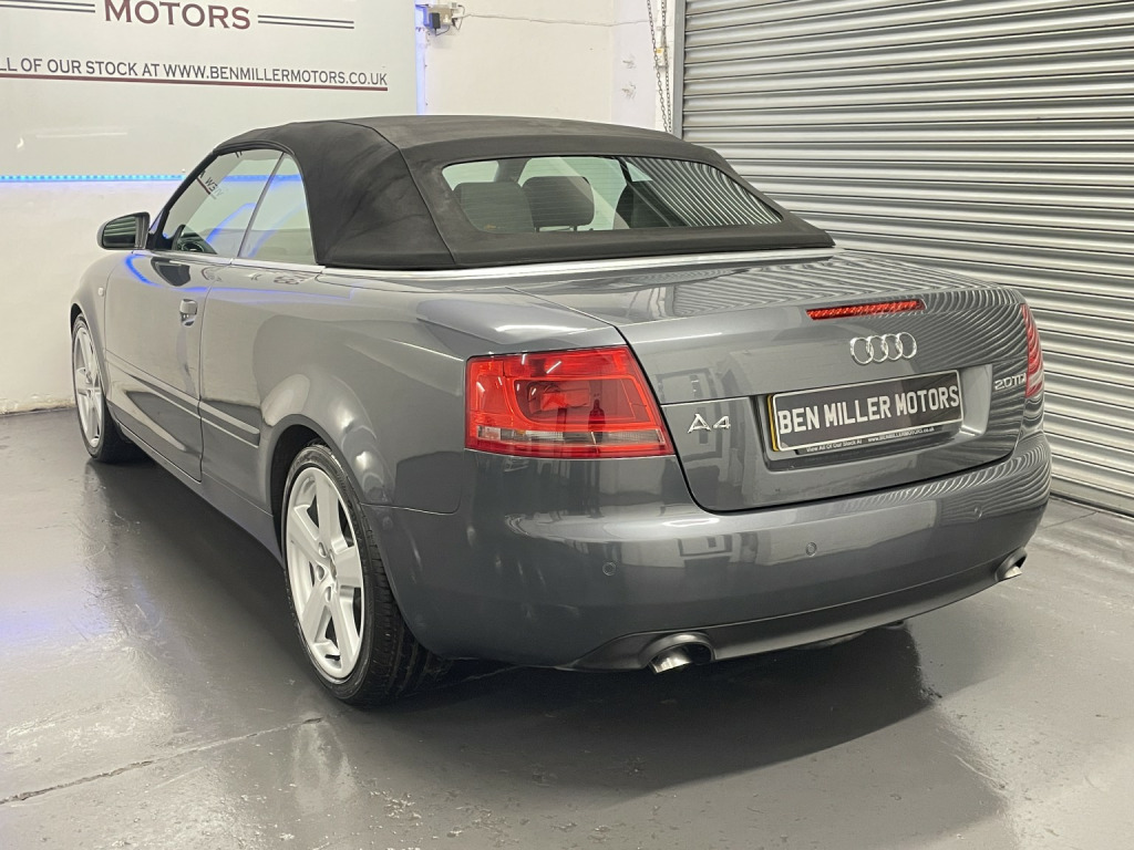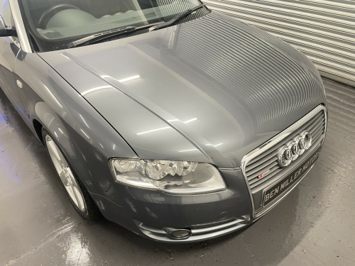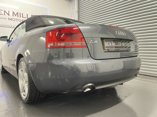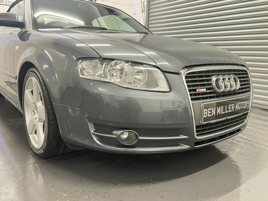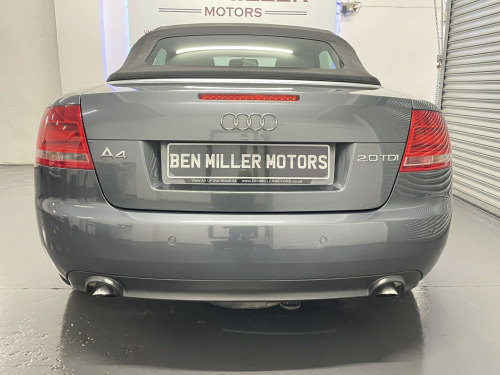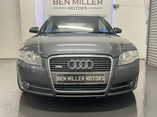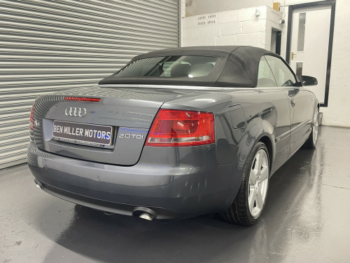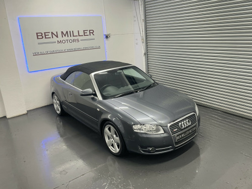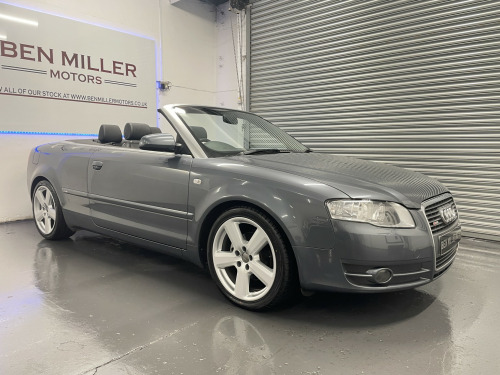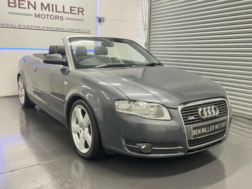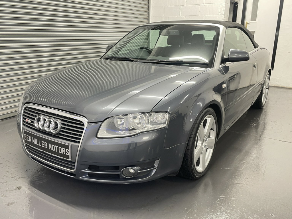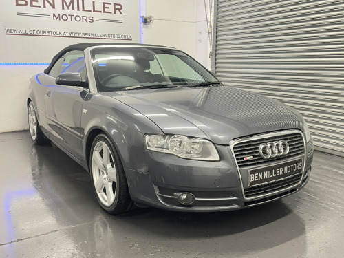 Just arrived in stock at Ben Miller Motors is this Audi A4 Cabriolet. , A 2008 S-Line model powered by the 2.0 TDI engine with 6 speed manual gearbox. , Just 65,000 miles on the clock and lady owned for the last 14 years. , An excellent example finished in Dolphin Grey Metallic with black soft top roof and 18 alloy wheels. , The specification includes full leather interior, electric lumbar support, fully automatic convertible roof, stereo / CD player with BOSE premium sound system, rear parking sensors, air conditioning, front centre armrest, multifunction steering wheel, ISOFIX child seat anchor points. , Offered for sale with original owners manuals, spare key and service history. There are 7 stamps in the book including a full service which we will have carried out prior to sale. We have also had all of the alloy wheels professionally refurbished. , All of our cars come with a 12 month MOT and 3 months warranty. , Our facilities include part exchanges, finance and a relaxed indoor showroom for hassle-free viewings. , If you would like to arrange a viewing or would like a friendly chat about a particular vehicle please do not hesitate to call.