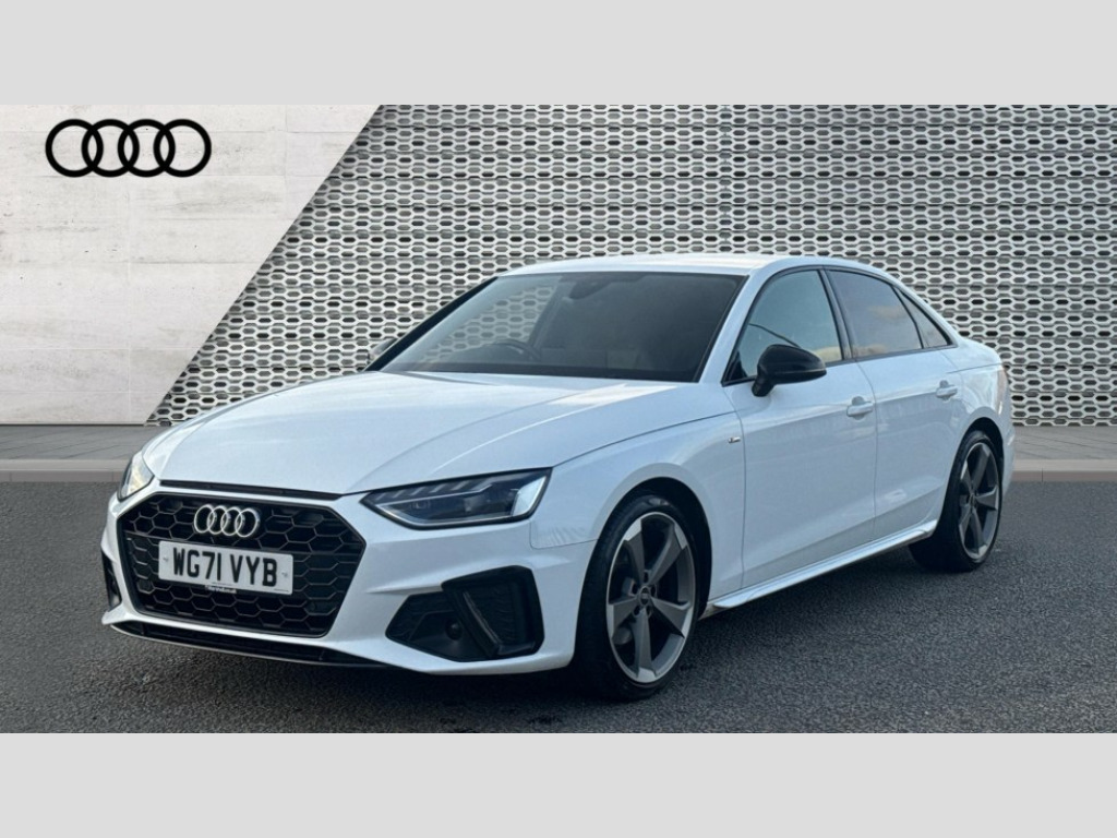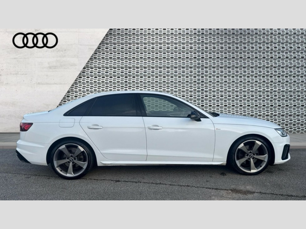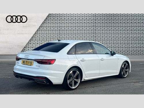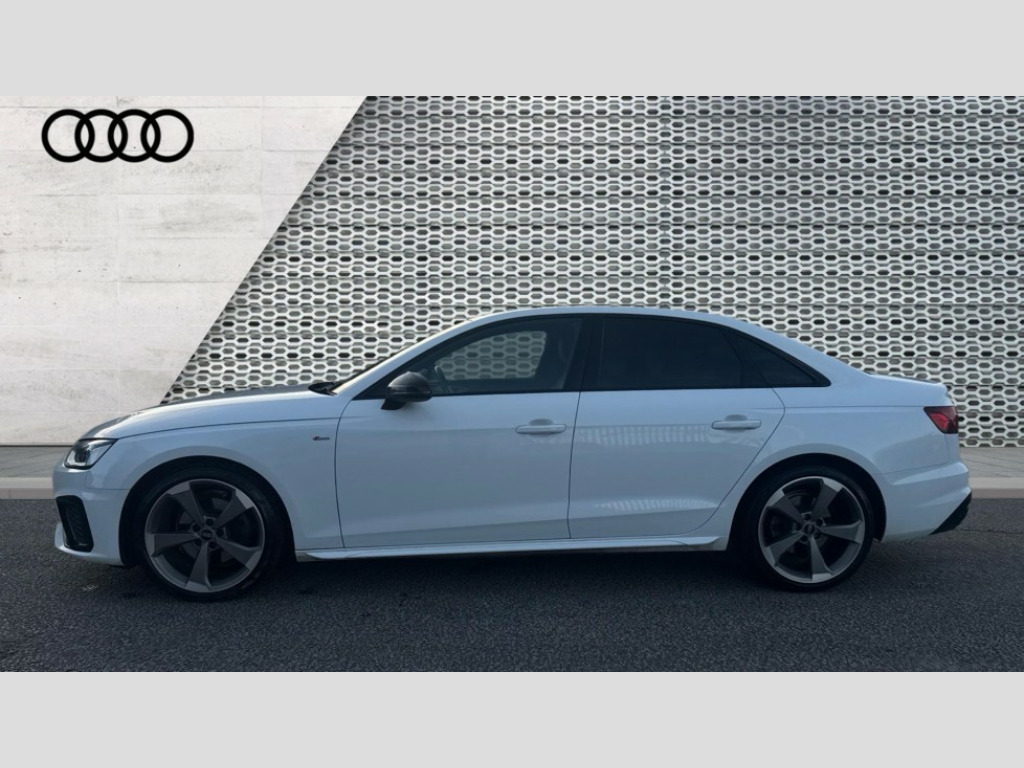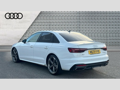 Audi A4 35 TDI Black Edition 4dr S Tronic Audi connect safety and service (e-call), Audi connect with Amazon Alexa Integration, Audi drive select, Audi parking system plus with front and rear sensors, Audi smartphone interface, Audi virtual cockpit, Automatic start-stop system with coasting functionality and efficiency programme, Bluetooth interface, Electric boot lid release, Electromechanical power steering, Email, calendar and text messages displayed via MMI, MMI Navigation plus with MMI touch includes 10.1" high resolution colour MMI display, 3D map, Rear view camera, Voice control system, Sports suspension lowered by 23mm, 2 USB charging ports, 8 passive loudspeakers, DAB digital radio reception, Auto dimming rear view mirror, Black Audi rings and black badging (model name in black badging, no engine badging), Black audi rings decal above rear sills, Body colour door handles, Body colour front spoiler lip, Body colour side sill trim, Electrically folding auto dimming/adjustable/heated door mirrors with LED side indicators and kerb view function for passenger side, Front and rear bumpers with side skirts, Front wing badges, Grained matt black side air inlets with matt aluminium silver inlay, High beam assistant, High gloss black B pillar trims and triangular rear door trim, LED headlights with LED rear lights + dynamic rear indicators + headlight adjustment and high beam, turning light + LED daytime running lights, LED third brake light, Matt aluminium silver tailpipe trim, Privacy glass, Rain and light sensors, Rear diffuser in matt titanium black with trim strip in matt aluminium silver, Rear side wing doors, Variable intermittent front wash/wipe, Windscreen with acoustic glazing, 4 way electric lumbar support for driver and front passenger, 40/20/40 split folding 3 rear seat bench in 3 parts with rear centre armrest, Black cloth headlining, Black perforated leather gearknob, Contrast stitching on seats, steering wheel and gear lever gaiter, Deluxe 3 zone electronic climate control, Door sill trims with aluminium inlay, Front and rear head restraints, Front centre armrest, Heated front seats, Illuminated door sill trims with S logo, ISOFIX child seat mounting and top tether, Manual seat adjustment, Single front passenger seat, Stainless steel pedals and foot rest, Black styling pack - A4 Saloon, LED Interior light pack - A4/S4, 3 rear seatbelts, 6 airbags - Driver, front passenger, curtain and side windows, Electronic Stabilisation Control (ESC) including ABS, ASR and EDL, Hill hold assist, Multi collision brake assist, Pop-up bonnet for pedestrian protection, Pre sense city, Seatbelt monitoring, Warning triangle and first aid kit, Anti theft alarm, Anti theft wheel bolts, Central locking, Keyless Go, Piano black finish inlay, Tool kit, Tyre repair kit