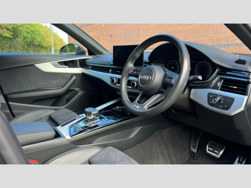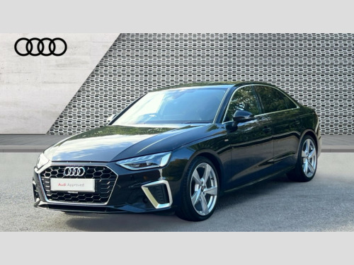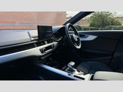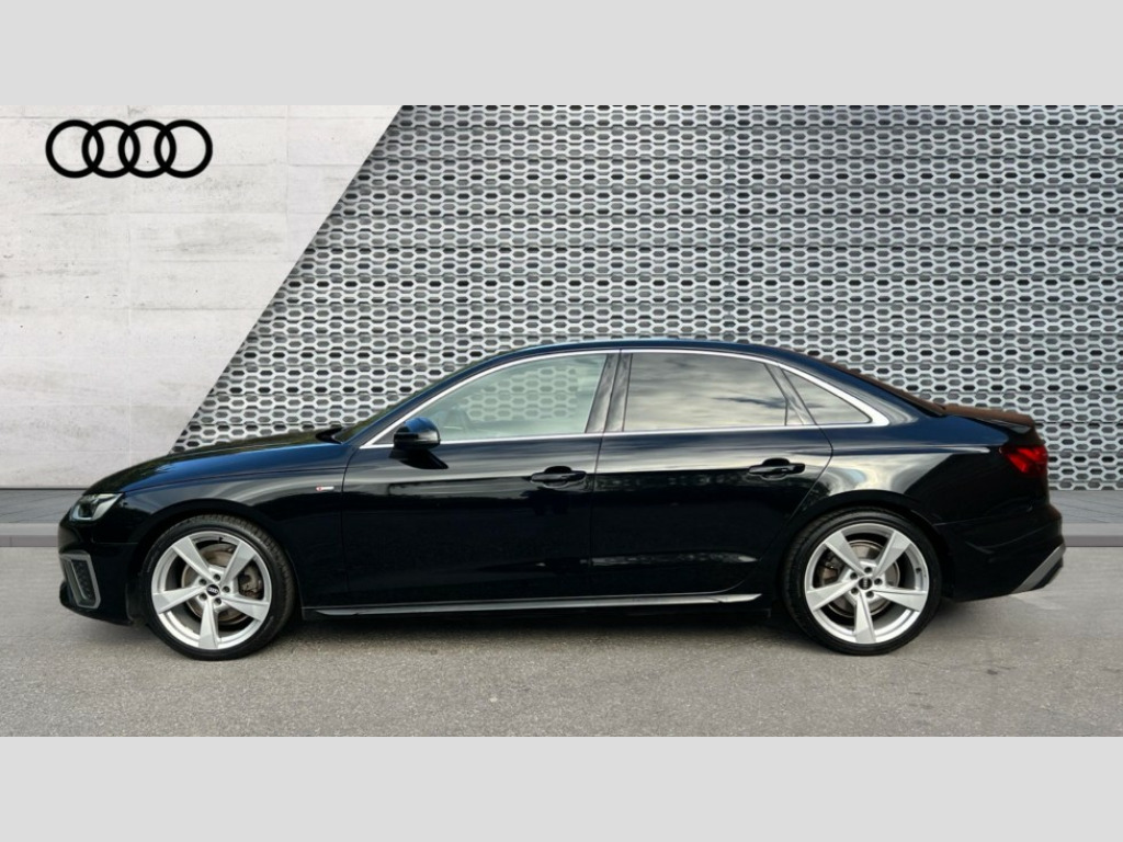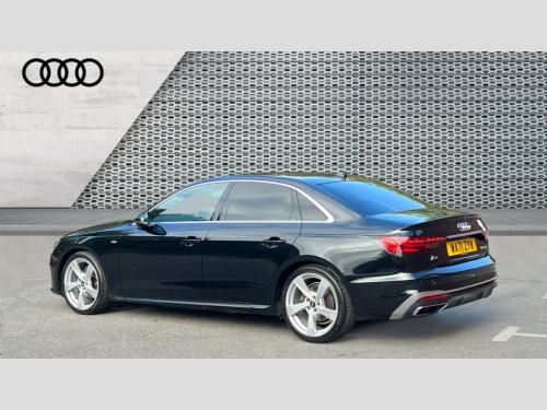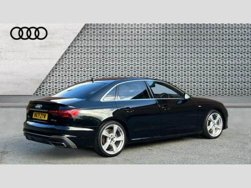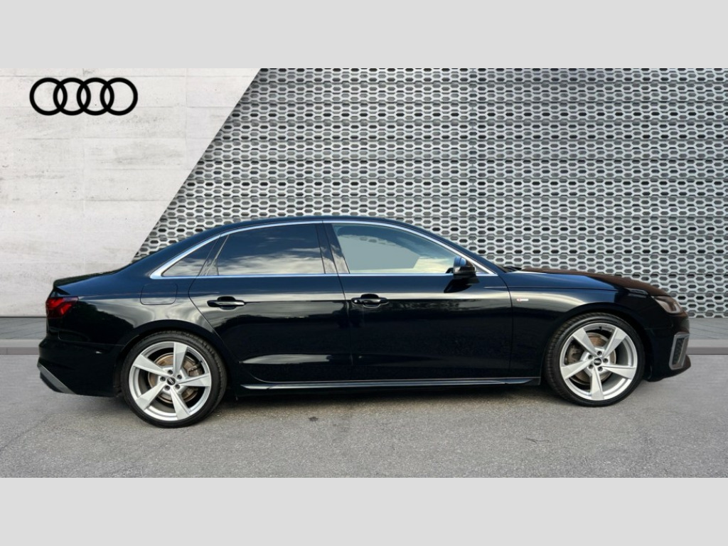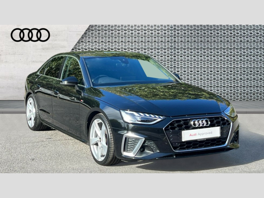 Audi A4 35 TDI S Line 4dr S Tronic Audi connect safety and service (e-call), Audi connect with Amazon Alexa Integration, Audi drive select, Audi parking system plus with front and rear sensors, Audi smartphone interface, Audi virtual cockpit, Automatic start-stop system with coasting functionality and efficiency programme, Bluetooth interface, Electric boot lid release, Electromechanical power steering, Email, calendar and text messages displayed via MMI, MMI Navigation plus with MMI touch includes 10.1" high resolution colour MMI display, 3D map, Rear view camera, Voice control system, Sports suspension lowered by 23mm, 2 USB charging ports, 8 passive loudspeakers, DAB digital radio reception, Auto dimming rear view mirror, Body colour door handles, Body colour front spoiler lip, Body colour side sill trim, Body coloured door mirrors, Electrically folding auto dimming/adjustable/heated door mirrors with LED side indicators and kerb view function for passenger side, Grained matt black side air inlets with matt aluminium silver inlay, High beam assistant, Honeycomb structure radiator grille in grained matt black, LED headlights with LED rear lights + dynamic rear indicators + headlight adjustment and high beam, turning light + LED daytime running lights, Matt aluminium silver tailpipe trim, Privacy glass, Rain and light sensors, S Line badges on the front wings, S line front and rear bumpers with side skirts, S Line rear diffuser in matt titanium black with trim strip in matt aluminium silver, Windscreen with acoustic glazing, 4 way electric lumbar support for driver and front passenger, 40/20/40 split folding 3 rear seat bench in 3 parts with rear centre armrest, Black cloth headlining, Black perforated leather gearknob, Contrast stitching on seats, steering wheel and gear lever gaiter, Deluxe 3 zone electronic climate control, Door sill trims with aluminium inlay, Front and rear head restraints, Front centre armrest, Heated front seats, Illuminated door sill trims with S logo, ISOFIX child seat mounting and top tether, Manual seat adjustment, Stainless steel pedals and foot rest, High gloss package - A4, LED Interior light pack - A4/S4, 3 rear seatbelts, 6 airbags - Driver, front passenger, curtain and side windows, Electronic Stabilisation Control (ESC) including ABS, ASR and EDL, Hill hold assist, Multi collision brake assist, Pop-up bonnet for pedestrian protection, Pre sense city, Seatbelt monitoring, Warning triangle and first aid kit, Anti theft alarm, Anti theft wheel bolts, Keyless Go, Matt brushed aluminium inlays, Tool kit, Tyre repair kit