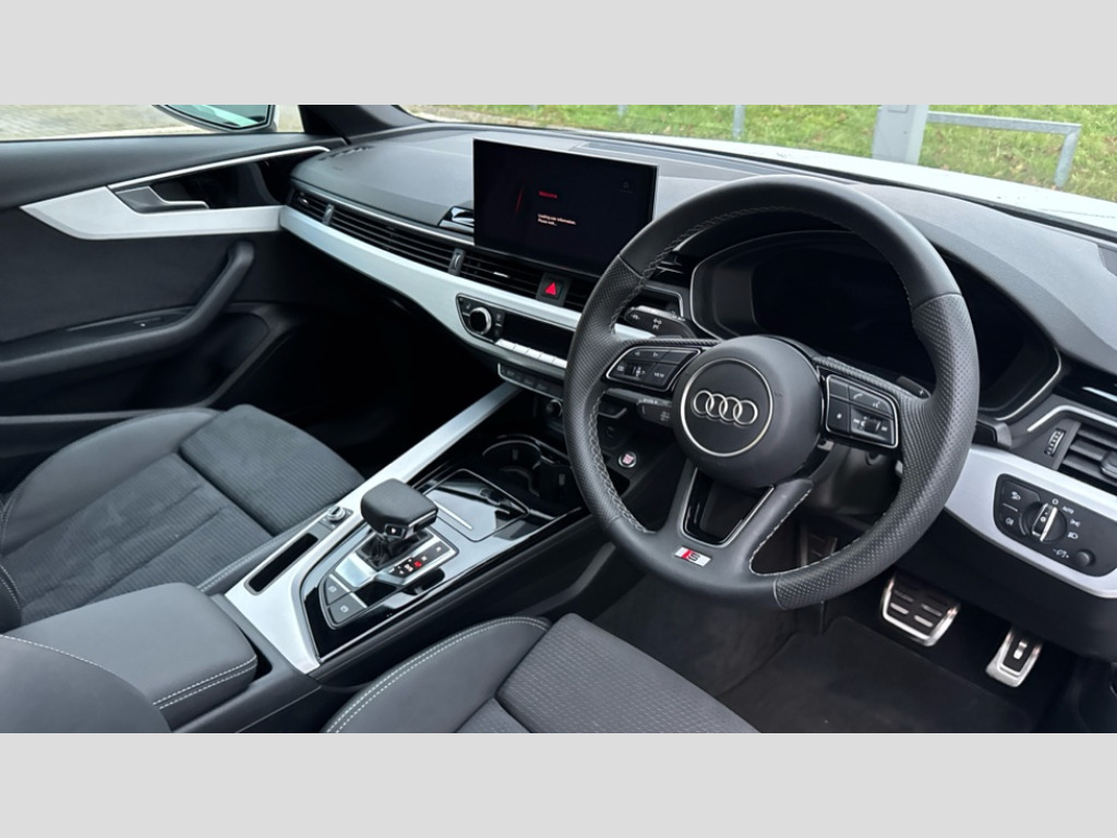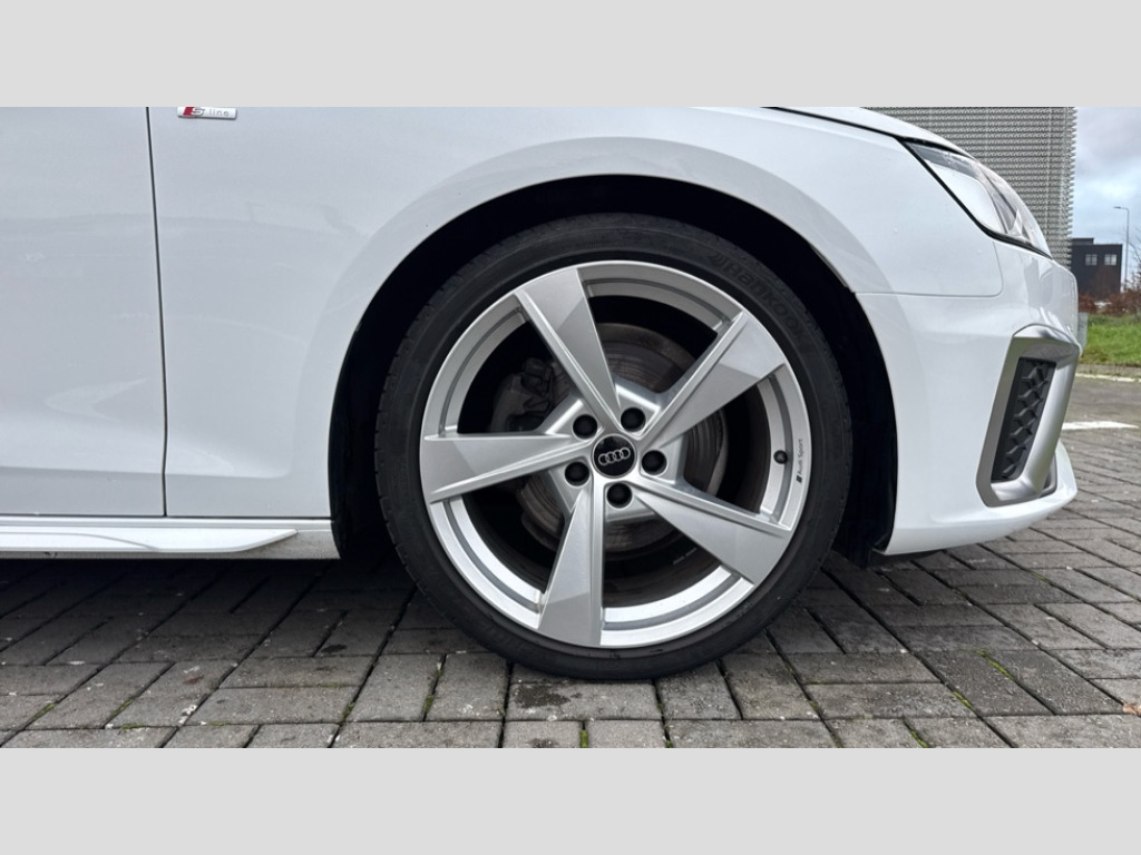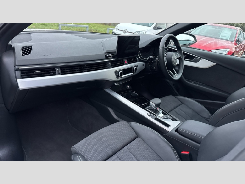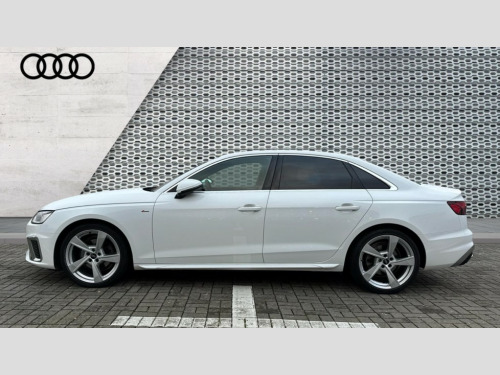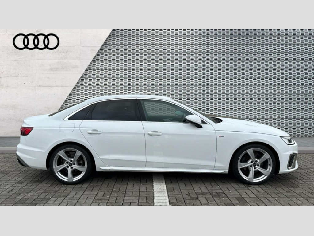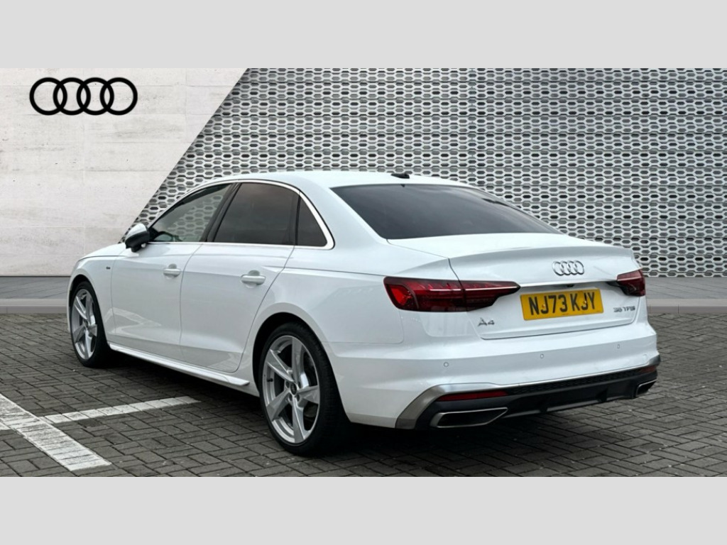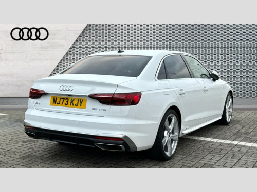 Audi A4 35 TFSI S Line 4dr S Tronic Audi connect safety and service (e-call), Audi drive select, Audi smartphone interface, Audi virtual cockpit, Automatic start-stop system with coasting functionality and efficiency programme, Bluetooth interface, Camera based traffic sign recognition, Electric boot lid release, Electromechanical power steering, Email, calendar and text messages displayed via MMI, Front and rear parking sensors, Lane departure warning, MMI Navigation plus with MMI touch includes 10.1" high resolution colour MMI display, 3D map, Rear view camera, Voice control system, 54 litre fuel tank, Sports suspension lowered by 23mm, 2 USB charging ports, 8 passive loudspeakers, DAB digital radio reception, Auto dimming rear view mirror, Body colour door handles, Body colour front spoiler lip, Body colour side sill trim, Body coloured door mirrors, Electric adjustable/heated/folding door mirrors with auto dimming, Grained matt black side air inlets with matt aluminium silver inlay, High beam assistant, Honeycomb structure radiator grille in grained matt black, LED headlights with LED rear lights + dynamic rear indicators + headlight adjustment and high beam, turning light + LED daytime running lights, LED third brake light, Matt aluminium silver tailpipe trim, Privacy glass, Rain and light sensors, Rear boot, Rear side wing doors, S Line badges on the front wings, S line front and rear bumpers with side skirts, S Line rear diffuser in matt anthracite black with trim strip in matt aluminium silver, Variable intermittent front wash/wipe, Windscreen with acoustic glazing, 3 spoke high multi-function sports leather steering wheel grips in perforated leather with S badging including paddle shift, 4 way electric lumbar support for driver and front passenger, 40/20/40 split folding 3 rear seat bench in 3 parts with rear centre armrest, Black carpets, Black cloth headlining, Black perforated leather gearknob, Contrast stitching on seats, steering wheel and gear lever gaiter, Deluxe 3 zone electronic climate control, Front and rear head restraints, Front centre armrest, Heated front seats, Illuminated door sill trims with S logo, ISOFIX child seat mounting and top tether, Manual seat adjustment, Single front passenger seat, Stainless steel pedals and foot rest, High gloss package - A4, LED Interior light pack - A4/S4, 3 rear seatbelts, 6 airbags - Driver, front passenger, curtain and side windows, Attention and drowsiness assist, Electronic Stabilisation Control (ESC) including ABS, ASR and EDL, Hill hold assist, Multi collision brake assist, Pop-up bonnet for pedestrian protection, Pre sense city, Rear door child safety locks, Seatbelt monitoring, Warning triangle and first aid kit, Anti theft alarm, Anti theft wheel bolts, Central locking, Keyless Go, Matt brushed aluminium inlays, Tool kit, Tyre repair kit