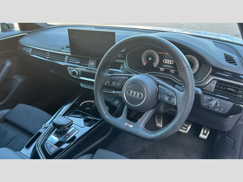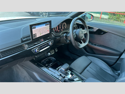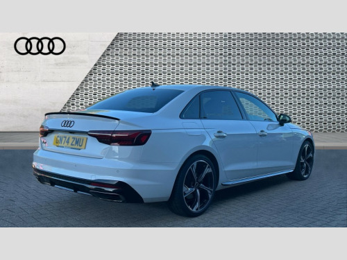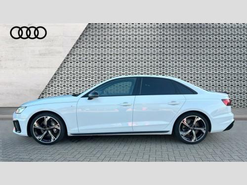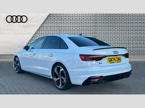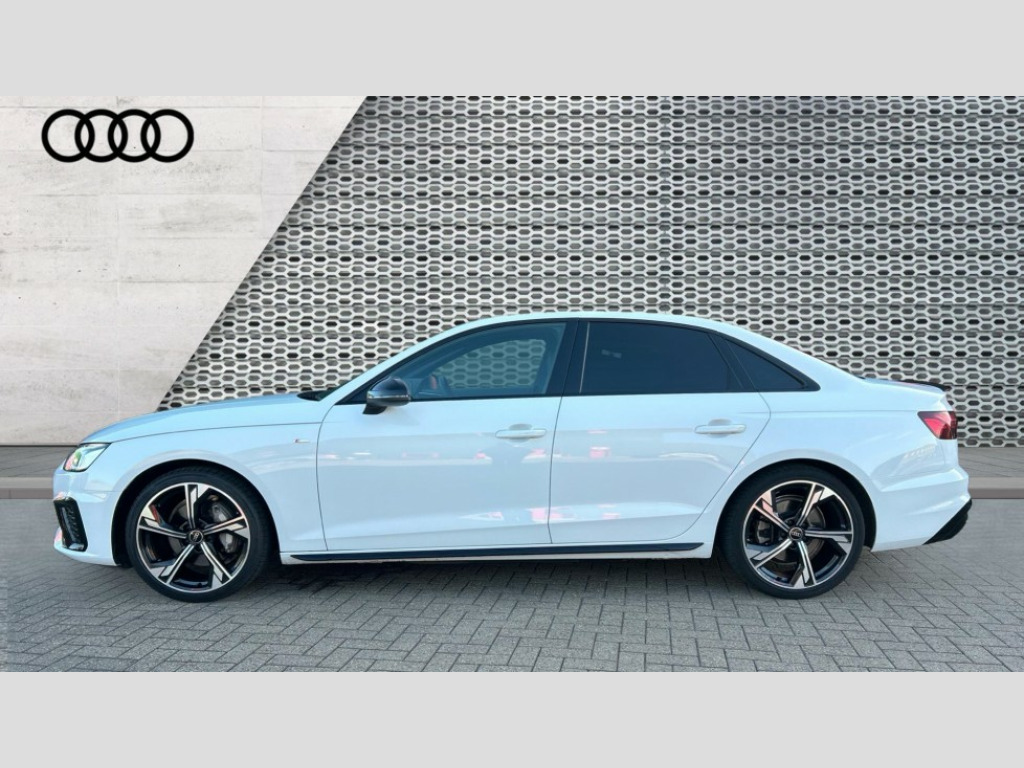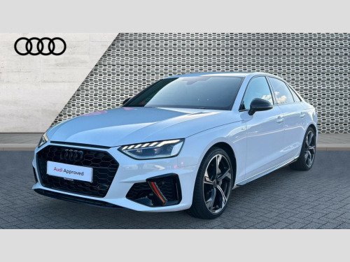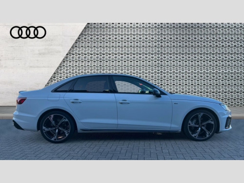 Audi A4 40 TFSI 204 Black Edition 4dr S Tronic Audi connect safety and service (e-call), Audi drive select, Audi smartphone interface, Audi virtual cockpit, Automatic start-stop system with coasting functionality and efficiency programme, Bluetooth interface, Camera based traffic sign recognition, Electric boot lid release, Electromechanical power steering, Email, calendar and text messages displayed via MMI, Front and rear parking sensors, Lane departure warning, MMI Navigation plus with MMI touch includes 10.1" high resolution colour MMI display, 3D map, Rear view camera, Voice control system, 54 litre fuel tank, Sports suspension lowered by 23mm, 2 USB charging ports, 8 passive loudspeakers, DAB digital radio reception, Audi beam uses LEDs to project the audi logo onto the ground as you exit your A4, Auto dimming rear view mirror, Black Audi rings and black badging (with removed engine badging), Body colour door handles, Body colour front spoiler lip, Body colour side sill trim, Electric adjustable/heated/folding door mirrors with auto dimming, Exhaust tailpipes in dark chrome, Grained matt black side air inlets with matt aluminium silver inlay, High beam assistant, High gloss black B pillar trims and triangular rear door trim, LED headlights with LED rear lights + dynamic rear indicators + headlight adjustment and high beam, turning light + LED daytime running lights, LED third brake light, Privacy glass, Rain and light sensors, Rear boot, Rear diffuser in matt black with trim strip in matt aluminium silver, Rear side wing doors, Sport front and rear bumpers with side skirts, Variable intermittent front wash/wipe, Windscreen with acoustic glazing, 4 way electric lumbar support for driver and front passenger, 40/20/40 split folding 3 rear seat bench in 3 parts with rear centre armrest, Black carpets, Black cloth headlining, Black perforated leather gearknob, Contrast stitching on seats, steering wheel and gear lever gaiter, Deluxe 3 zone electronic climate control, Front and rear head restraints, Front centre armrest, Heated front seats, Illuminated door sill trims with S logo, ISOFIX child seat mounting and top tether, Manual seat adjustment, Single front passenger seat, Stainless steel pedals and foot rest, Black styling pack - A4 Saloon, LED Interior light pack - A4/S4, 3 rear seatbelts, 6 airbags - Driver, front passenger, curtain and side windows, Attention and drowsiness assist, Electronic Stabilisation Control (ESC) including ABS, ASR and EDL, Hill hold assist, Multi collision brake assist, Pop-up bonnet for pedestrian protection, Pre sense city, Rear door child safety locks, Seatbelt monitoring, Warning triangle and first aid kit, Anti theft alarm, Anti theft wheel bolts, Central locking, Keyless Go, Piano black finish inlay, Tool kit, Tyre repair kit