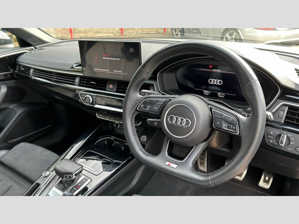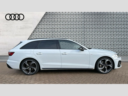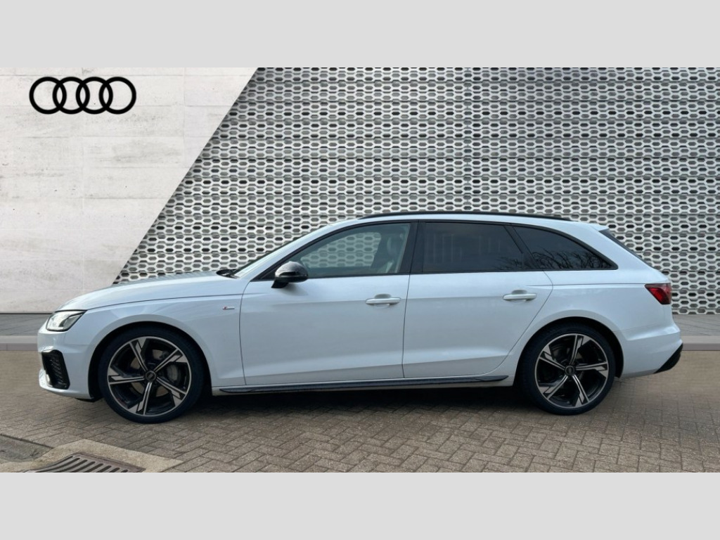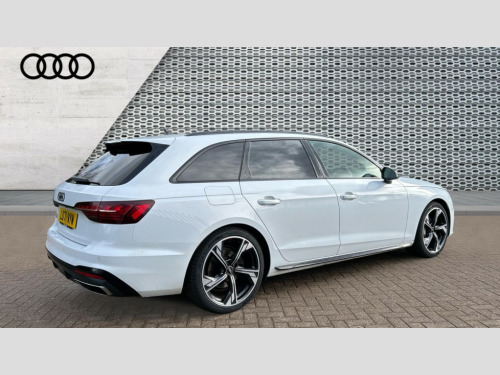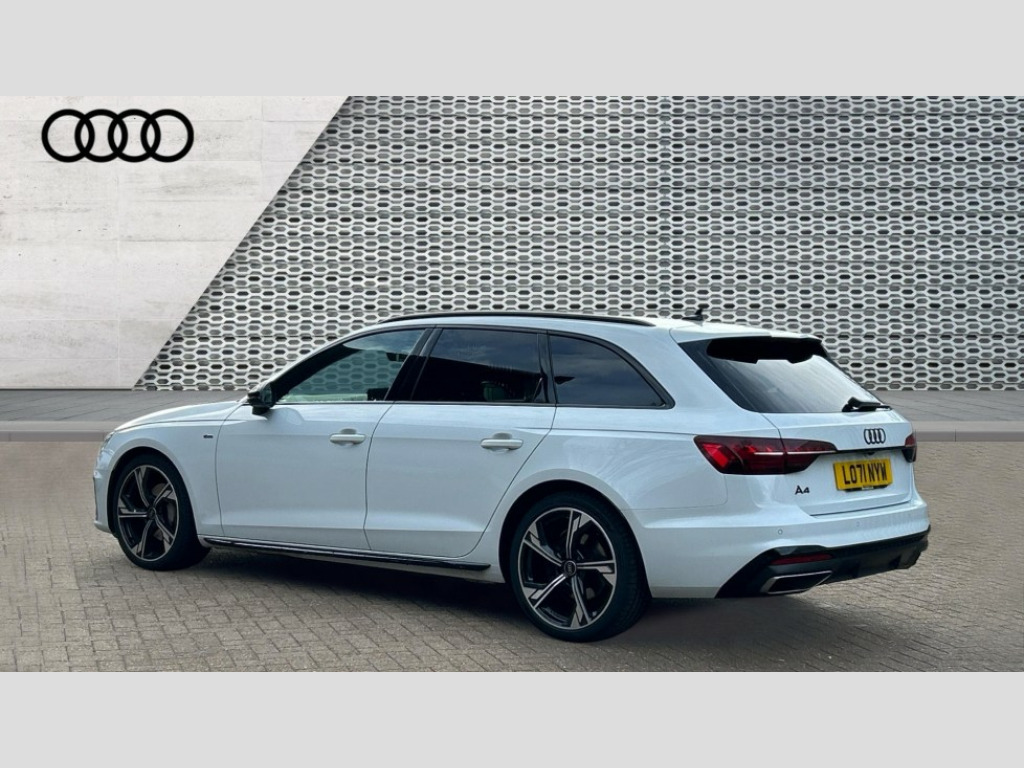 Audi A4 40 TFSI 204 Black Edition 5dr S Tronic Audi connect safety and service (e-call), Audi connect with Amazon Alexa Integration, Audi drive select, Audi parking system plus with front and rear sensors, Audi smartphone interface, Audi virtual cockpit, Automatic start-stop system with coasting functionality and efficiency programme, Bluetooth interface, Electromechanical power steering, Email, calendar and text messages displayed via MMI, MMI Navigation plus with MMI touch includes 10.1" high resolution colour MMI display, 3D map, Power operated tailgate, Rear view camera, Voice control system, 54 litre fuel tank, Sports suspension lowered by 23mm, 2 USB charging ports, 8 passive loudspeakers, DAB digital radio reception, Auto dimming rear view mirror, Black Audi rings and black badging (model name in black badging, no engine badging), Black audi rings decal above rear sills, Body colour door handles, Body colour front spoiler lip, Body colour side sill trim, Electrically folding auto dimming/adjustable/heated door mirrors with LED side indicators and kerb view function for passenger side, Front and rear bumpers with side skirts, Front wing badges, Grained matt black side air inlets with matt aluminium silver inlay, High beam assistant, High gloss black B pillar trims and triangular rear door trim, LED headlights with LED rear lights + dynamic rear indicators + headlight adjustment and high beam, turning light + LED daytime running lights, LED third brake light, Matt aluminium silver tailpipe trim, Privacy glass, Rain and light sensors, Rear diffuser in matt titanium black with trim strip in matt aluminium silver, Rear side wing doors, RS4 rear spoiler in body colour, S Line roof edge spoiler, Variable intermittent front wash/wipe, Windscreen with acoustic glazing, 4 way electric lumbar support for driver and front passenger, 40/20/40 split folding 3 rear seat bench in 3 parts with rear centre armrest, Black cloth headlining, Black perforated leather gearknob, Contrast stitching on seats, steering wheel and gear lever gaiter, Deluxe 3 zone electronic climate control, Door sill trims with aluminium inlay, Electric load area cover, Front and rear head restraints, Front centre armrest, Heated front seats, Illuminated door sill trims with S logo, ISOFIX child seat mounting and top tether, Manual seat adjustment, Single front passenger seat, Stainless steel pedals and foot rest, Black styling pack - A4 Avant, LED Interior light pack - A4/S4, 3 rear seatbelts, 6 airbags - Driver, front passenger, curtain and side windows, Electronic Stabilisation Control (ESC) including ABS, ASR and EDL, Hill hold assist, Multi collision brake assist, Pop-up bonnet for pedestrian protection, Pre sense city, Seatbelt monitoring, Warning triangle and first aid kit, Anti theft alarm, Anti theft wheel bolts, Central locking, Keyless Go, Piano black finish inlay, Tool kit, Tyre repair kit
