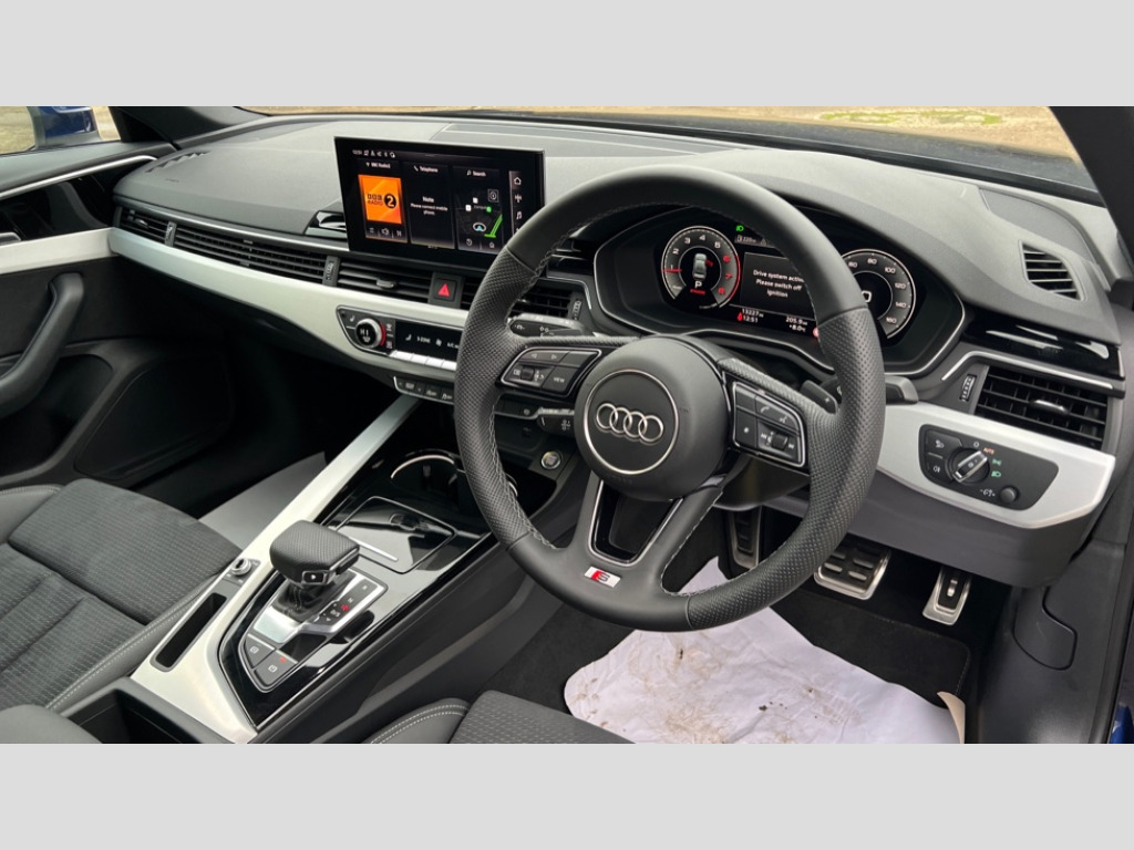 Audi A4 40 TFSI 204 S Line 4dr S Tronic Audi connect safety and service (e-call), Audi drive select, Audi smartphone interface, Audi virtual cockpit, Automatic start-stop system with coasting functionality and efficiency programme, Bluetooth interface, Camera based traffic sign recognition, Electric boot lid release, Electromechanical power steering, Email, calendar and text messages displayed via MMI, Front and rear parking sensors, Lane departure warning, MMI Navigation plus with MMI touch includes 10.1" high resolution colour MMI display, 3D map, Rear view camera, Voice control system, 54 litre fuel tank, Sports suspension lowered by 23mm, 2 USB charging ports, 8 passive loudspeakers, DAB digital radio reception, Auto dimming rear view mirror, Body colour door handles, Body colour front spoiler lip, Body colour side sill trim, Body coloured door mirrors, Electric adjustable/heated/folding door mirrors with auto dimming, Grained matt black side air inlets with matt aluminium silver inlay, High beam assistant, Honeycomb structure radiator grille in grained matt black, LED headlights with LED rear lights + dynamic rear indicators + headlight adjustment and high beam, turning light + LED daytime running lights, LED third brake light, Matt aluminium silver tailpipe trim, Privacy glass, Rain and light sensors, Rear boot, Rear side wing doors, S Line badges on the front wings, S line front and rear bumpers with side skirts, S Line rear diffuser in matt anthracite black with trim strip in matt aluminium silver, Variable intermittent front wash/wipe, Windscreen with acoustic glazing, 3 spoke high multi-function sports leather steering wheel grips in perforated leather with S badging including paddle shift, 4 way electric lumbar support for driver and front passenger, 40/20/40 split folding 3 rear seat bench in 3 parts with rear centre armrest, Black carpets, Black cloth headlining, Black perforated leather gearknob, Contrast stitching on seats, steering wheel and gear lever gaiter, Deluxe 3 zone electronic climate control, Front and rear head restraints, Front centre armrest, Heated front seats, Illuminated door sill trims with S logo, ISOFIX child seat mounting and top tether, Manual seat adjustment, Single front passenger seat, Stainless steel pedals and foot rest, High gloss package - A4, LED Interior light pack - A4/S4, 3 rear seatbelts, 6 airbags - Driver, front passenger, curtain and side windows, Attention and drowsiness assist, Electronic Stabilisation Control (ESC) including ABS, ASR and EDL, Hill hold assist, Multi collision brake assist, Pop-up bonnet for pedestrian protection, Pre sense city, Rear door child safety locks, Seatbelt monitoring, Warning triangle and first aid kit, Anti theft alarm, Anti theft wheel bolts, Central locking, Keyless Go, Matt brushed aluminium inlays, Tool kit, Tyre repair kit