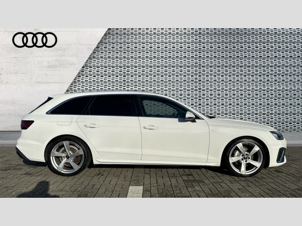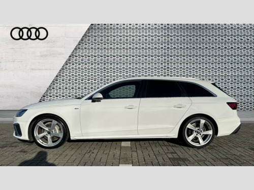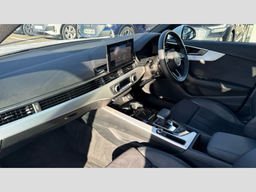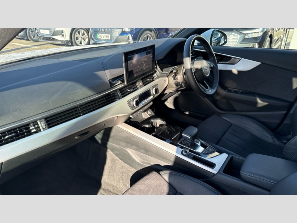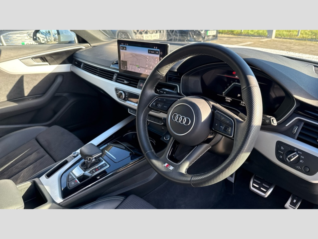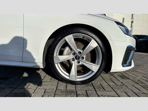 Audi A4 40 TFSI 204 S Line 5dr S Tronic Audi connect safety and service (e-call), Audi connect with Amazon Alexa Integration, Audi drive select, Audi smartphone interface, Audi virtual cockpit, Automatic start-stop system with coasting functionality and efficiency programme, Bluetooth interface, Electromechanical power steering, Email, calendar and text messages displayed via MMI, MMI Navigation plus with MMI touch includes 10.1" high resolution colour MMI display, 3D map, Power operated tailgate, Voice control system, 54 litre fuel tank, Sports suspension lowered by 23mm, 2 USB charging ports, 8 passive loudspeakers, DAB digital radio reception, Aluminium roof rails, Auto dimming rear view mirror, Body colour door handles, Body colour front spoiler lip, Body colour side sill trim, Body coloured door mirrors, Electrically folding auto dimming/adjustable/heated door mirrors with LED side indicators and kerb view function for passenger side, Grained matt black side air inlets with matt aluminium silver inlay, High beam assistant, Honeycomb structure radiator grille in grained matt black, LED headlights with LED rear lights + dynamic rear indicators + headlight adjustment and high beam, turning light + LED daytime running lights, LED third brake light, Matt aluminium silver tailpipe trim, Privacy glass, Rain and light sensors, Rear side wing doors, Rear wiper, S Line badges on the front wings, S line front and rear bumpers with side skirts, S Line rear diffuser in matt titanium black with trim strip in matt aluminium silver, S Line roof edge spoiler, Variable intermittent front wash/wipe, Windscreen with acoustic glazing, 4 way electric lumbar support for driver and front passenger, 40/20/40 split folding 3 rear seat bench in 3 parts with rear centre armrest, Black cloth headlining, Black perforated leather gearknob, Contrast stitching on seats, steering wheel and gear lever gaiter, Deluxe 3 zone electronic climate control, Door sill trims with aluminium inlay, Electric load area cover, Front and rear head restraints, Front centre armrest, Heated front seats, Illuminated door sill trims with S logo, ISOFIX child seat mounting and top tether, Manual seat adjustment, Single front passenger seat, Stainless steel pedals and foot rest, High gloss package - A4, LED Interior light pack - A4/S4, 3 rear seatbelts, 6 airbags - Driver, front passenger, curtain and side windows, Electronic Stabilisation Control (ESC) including ABS, ASR and EDL, Hill hold assist, Multi collision brake assist, Pop-up bonnet for pedestrian protection, Pre sense city, Rear door child safety locks, Seatbelt monitoring, Warning triangle and first aid kit, Anti theft alarm, Anti theft wheel bolts, Central locking, Keyless Go, Matt brushed aluminium inlays, Tool kit, Tyre repair kit