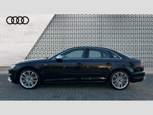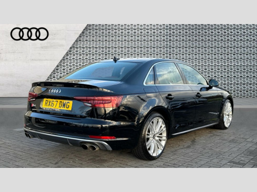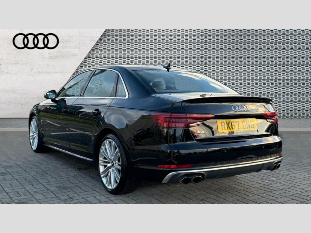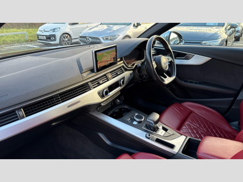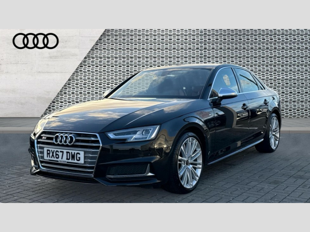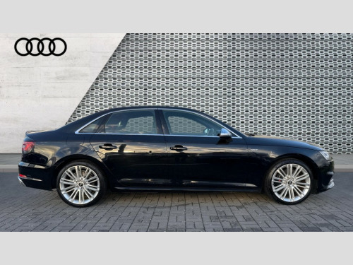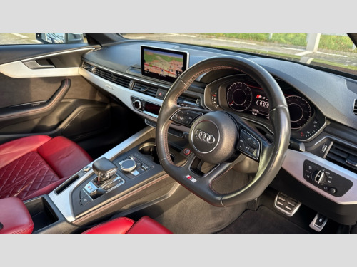 Audi A4 S4 Quattro 4dr Tip Tronic Audi drive select, Audi Pre sense collision avoidance, Audi smartphone interface, Auto boot lid opening, Electro-mechanical PAS, MMI navigation plus with HDD and jukebox storage + 2 SD card readers + single CD/DVD player, Mobile telephone preparation - bluetooth interface, Service interval indicator, Stop/start button, Voice control system, 2 USB ports, Aux input, DAB digital radio module, Acoustic windscreen, Air inlets in titan black with chrome inlays, Aluminium window trim, Auto dimming rear view mirror, Automatic headlights + automatic windscreen wipers, Body colour bumpers, Body colour door handles, Chrome rolled exhaust, Electric adjustable heated door mirrors, Electric front windows, Electric rear windows, Headlight range control, High gloss black triangular aperture at rear door, Honeycomb radiator grille - black, LED daytime running lights, LED indicators in door mirrors, Rain and light sensors, Rear diffuser in Twilight grey matt, Rear spoiler, Twin oval exhaust tailpipes with chrome finish, 3 spoke flat bottom high multi-function leather steering wheel, 3 zone climate control, Black cloth headlining, Fine Nappa leather upholstery, Front centre armrest with 12v socket, Front headrests, Front/rear floor mats, Gearshift paddles, Illuminated door sill finishers, Isofix child seat preparation for front passenger/outer rear seats inc passenger airbag deactivation, Jack and tool kit, Luggage compartment carpet, Massage function for front and rear seats, Perforated leather gearknob, Reach + rake adjustable steering column, Rear headrests, S Super sports front seats, Split folding rear seats, Stainless steel foot rest, Stainless steel pedals, Sunvisors with vanity mirrors, Top tether anchor plate for isofix child seat, Extended Interior Upholstery Pack - A4/S4, Non Smokers pack, 3 point seatbelts on all rear seats, ABS/EBD, Active bonnet, Adaptive driver and front passenger airbags, EDL + ASR, Electromechanical parking brake, Enhanced braking system, ESP, First aid kit, Front head airbags, Front seatbelt pretensioners + load limiters, Front side airbags, Hill hold control, Multi-Collision braking, Seatbelt warning, Traction control, Tyre pressure monitoring system, Warning triangle, Anti theft alarm, Keyless Start, Locking wheel bolts, Remote central locking, Thatcham category 1 alarm + immobiliser, Space saver spare wheel