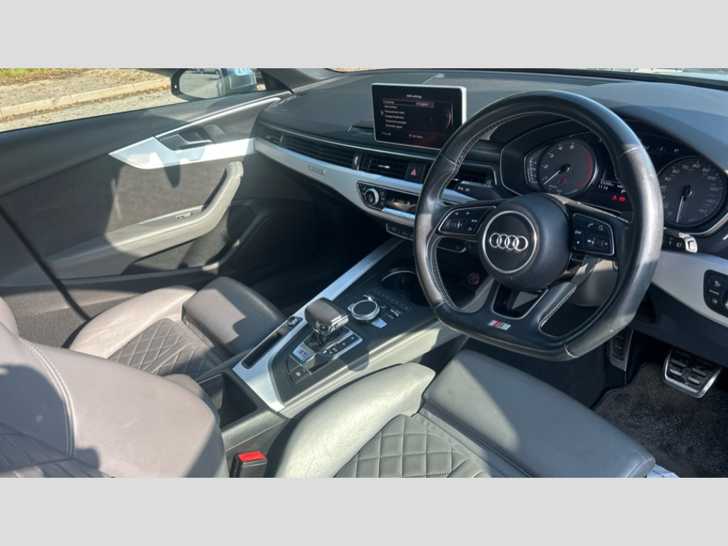 Audi A4 S4 Quattro 5dr Tip Tronic Audi connect, Audi drive select, Audi Pre sense collision avoidance, Audi smartphone interface, Electro-mechanical PAS, MMI navigation plus with HDD and jukebox storage + 2 SD card readers + single CD/DVD player, Mobile telephone preparation - bluetooth interface, Power boot opening and closing, Service interval indicator, Stop/start button, Voice control system, 2 USB ports, Aux input, DAB digital radio module, Acoustic windscreen, Air inlets in titan black with chrome inlays, Aluminium window trim, Auto dimming rear view mirror, Automatic headlights + automatic windscreen wipers, Body colour bumpers, Chrome door handles, Chrome rolled exhaust, Electric adjustable heated door mirrors, Electric front windows, Electric rear windows, Headlight range control, Headlight washer jets, High beam assistant, High gloss black triangular aperture at rear door, Honeycomb radiator grille - black, LED daytime running lights, LED indicators in door mirrors, Rain and light sensors, Rear diffuser in Twilight grey matt, Rear spoiler, Rear wiper, Twin oval exhaust tailpipes with chrome finish, 3 zone climate control, 4 way electric lumbar support for driver and front passenger, Black cloth headlining, Electric adjustable front seats, Fine Nappa leather upholstery, Front centre armrest with 12v socket, Front headrests, Front/rear floor mats, Gearshift paddles, Heated front seats, Illuminated door sill finishers, Isofix child seat preparation for front passenger/outer rear seats inc passenger airbag deactivation, Jack and tool kit, Luggage compartment carpet, Lumbar support with massage function, Massage function for front and rear seats, Perforated leather gearknob, Reach + rake adjustable steering column, Rear headrests, Retractable load area cover, S Super sports front seats, Split folding rear seats, Sunvisors with vanity mirrors, Top tether anchor plate for isofix child seat, Extended Interior Upholstery Pack - A4/S4, Non Smokers pack, 3 point seatbelts on all rear seats, ABS/EBD, Active bonnet, Adaptive driver and front passenger airbags, Electromechanical parking brake, ESP, First aid kit, Front head airbags, Front seatbelt pretensioners + load limiters, Front side airbags, Multi-Collision braking, Seatbelt warning, Traction control, Tyre pressure monitoring system, Warning triangle, Anti theft alarm, Keyless Start, Locking wheel bolts, Remote central locking, Thatcham category 1 alarm + immobiliser, Space saver spare wheel
