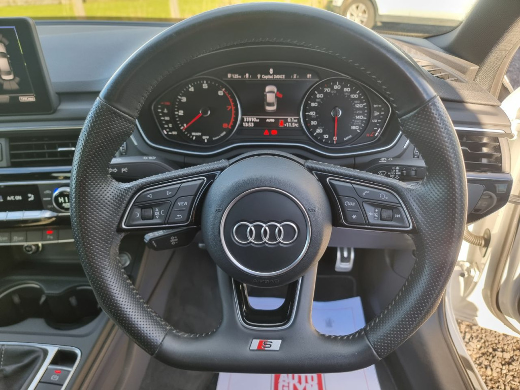 12 months warranty, 12 months MOT, Last serviced on 01/11/2019 at 18,656 miles, Full service history, Clean bodywork, Interior - Clean Condition, Tyre condition Good, 5 seats, Ibis White, 1 owner, 31000 Miles, £155 a year road tax, 19in Alloy Wheels - 5-Arm Rotor Matt Titanium Look - Diamond Cut, Anti-Theft Alarm, Audi Smartphone Interface, Audi Sound System, Auto-Dimming Rear-View Mirror, Black Styling Package, Bluetooth Interface, CD Drive, Chrome-Plated Trims for Exhaust System, Cloth Headlining in Black, Cruise Control with Speed Limiter, DAB Digital Radio, Deluxe 3-Zone Electronic Climate Control, Driver Information System - 7in Colour Display, ESC - Electronic Stabilisation Control inc ABS - ASR and EDL, Electric Boot Lid Release, Flat Bottomed 3-Spoke Leather High Multi-Function Steering Wheel, Heated Front Seats, High Gloss Package, Illuminated Door Sill Trims with S Logo, Inlays - Piano Finish - Black, Keyless Go, LED Headlights with LED Rear Lights and Dynamic Rear Indicators, LED Interior Light Package, Light and Rain Sensor, MMI Navigation - SD Card Based, Parking System Plus, Pre-Sense City, Privacy Glass and Front Acoustic Glazing, Rear Diffuser in Twilight Grey Matt, Remote Central Locking, Sport Suspension, Towbar Preparation, Two USB Charging Ports, Tyre Pressure Warning Light, Voice Control, Windscreen with Acoustic Glazing, ISOFIX Child Seat Mounting and Top Tether, Established 35 years, Open 6 days a week, PX welcome, Competitive Finance available, Free AA Cover, £20,495