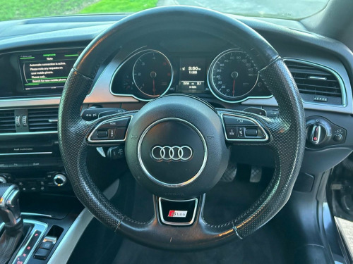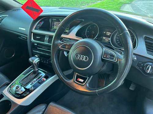 With only 25,000 miles on the clock, this 2013 Audi A5 2.0L Diesel TDI Black Edition offers an exceptional opportunity to own a vehicle with very low mileage for its age. This four-wheel drive A5 comes in the Black Edition trim and boasts S Line side skirts and S Line design rear diffuser, complemented by S Line badges on the wings and a distinctive S line exterior styling package. The Bi-Xenon headlights with LED daytime running lights, including Xenon headlights, enhance both visibility and style. You can drive away with confidence, thanks to the clear vehicle history check. This particular model stands out with its large boot space, making it more practical than similar vehicles. Furthermore, the low insurance group means it could be more affordable to insure than other cars in its class. The Audi A5 combines sporty aesthetics with everyday usability.