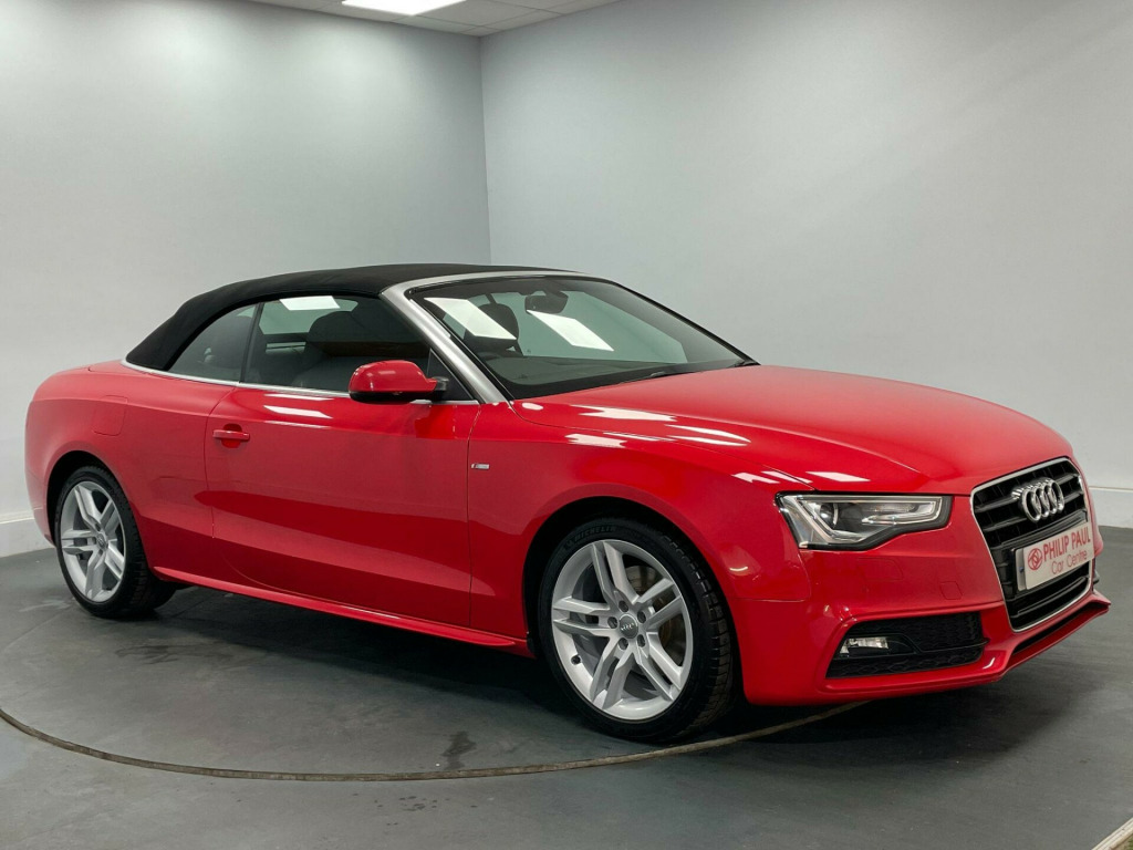 Here we have a simply stunning example of the Audi A5 TDi S Line Cabriolet , with the 2.0 diesel engine. This model has been finished in a gorgeous red, with a beautifully presented full leather interior. The A5 has a great service history and the condition is superb throughout. We have put the vehicle through our comprehensive 125 multipoint check, completed by one of our fully trained technicians. This high spec example has been hand picked by our dedicated buyer, who has over 35 years experience in buying the highest quality vehicles. The features on the S Line model include, Climate control, Cruise control, Satnav, Front and rear parking sensors, Front and rear heated seats, Steering wheel mounted controls, Automatic headlights, Bluetooth connectivity, Media input, Stop/Start, Electric windows, Electric mirrors and 18'' Alloy wheels. At Philip Paul car centre, we have many options available, including finance, part exchange, nationwide delivery, guaranteed asset protection and Williams paint protection. All of our vehicles come with a 3 month warranty, with options to extend cover for up to 2 years.. 10 Speakers, 12V Power Socket, 18in 10Spoke design Alloy Wheels, 18in 5Spoke S Line Alloy Wheels, 18in Alloy Wheels - 5-Spoke S Line Design, 3Spoke S Line Multifunction Leather Steering Wheel, 4Spoke Leather Multifunction Steering Wheel, ABS - Anti-Lock Braking System, AUX-IN Socket, Acoustic Hood - Fully Automatic, Acoustic Parking System - Rear, Airbags - Driver, Airbags - Front Passenger, Alarm - Thatcham Category 1, Automatic Wipers with Rain Sensor, Auxiliary input socket, Bi-Xenon Headlights, Climate Control - Electronic 3-Zone, Concert Radio & CD player with MP3 SD card reader & Aux input socket, Concert Radio & single CD player with MP3 facility, Concert Radio - MP3-CD Player, Delete capacity designation at Rear, Deletion of model & engine designation at Rear, Door Mirrors - Electrically Adjustable and Heated, Drivers Information System - DIS, ESP - Electronic Stability Programme, Electric Windows - Front and Rear, Electrically Adjustable 4-Way Lumbar Support, Electromechanical Power Steering, Front Centre Armrest, Front Fog Lights, Fully Automatic Hood, Headlights - Automatic Adjustment, Headlights Washers, ISOFIX child seat preparation Front and Rear with passenger airbag deactivation switch, Inlays - Matt Brushed Aluminium, Intelligent Key, Matt brushed Aluminium inlay, PAS, Piano Black finish inlay, Rear Side Airbags, Rear acoustic Parking System, Remote Audio Control, S line Sports suspension, Space Saver Spare Wheel, Split-Folding Rear Seats, Sport Suspension, Sports suspension, Steering Column - Rake and Reach Adjustment, Steering Wheel - 3-Spoke Leather - Multi-function - Sports, Wind Deflector.