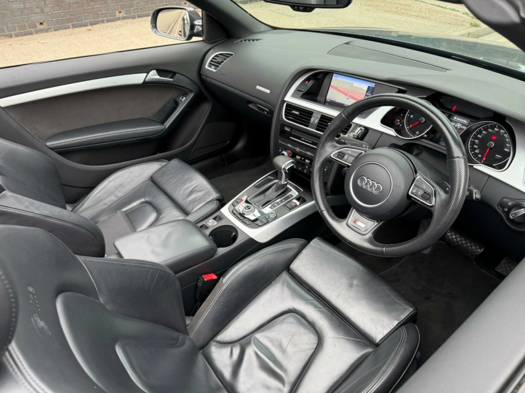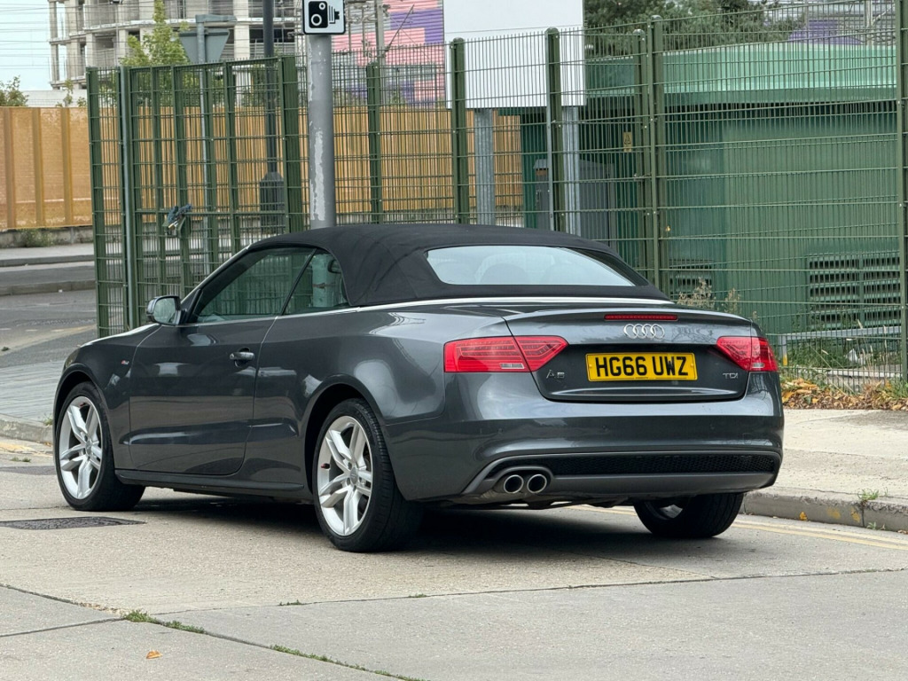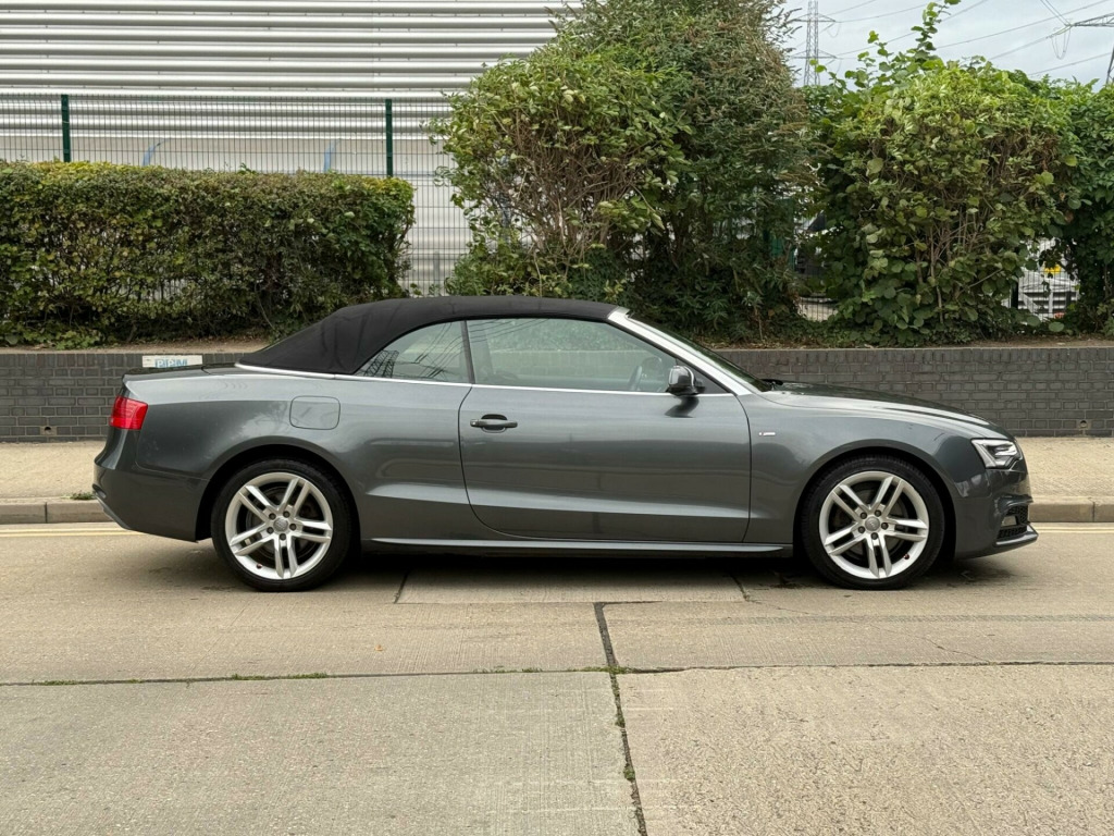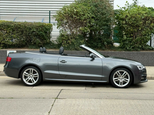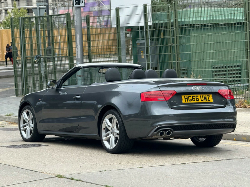 This 2017 Audi A5 Cabriolet TDI S line offers exceptional value with its remarkably low mileage of just 56,000 miles for its age. As a Euro 6 compliant model, it features a capable 2.0 litre diesel engine, paired with an S line trim that includes the desirable Audi Exclusive Line package. Inside, you'll find the comfort of Sports Seats upholstered in a striking two-tone Fine Nappa leather in Cognac Brown and Black. Practicality is also a strong point, with a generous boot space for your luggage and ISOFIX child seat mountings for rear seats, ensuring peace of mind for families.The driving experience is further enhanced by the S line 3-spoke leather steering wheel, complete with gear shift paddles for manual control of the automatic transmission. This Audi A5 Cabriolet achieves 0-60mph in a brisk 8.0 seconds, demonstrating its responsive performance. The inclusion of remote central locking adds to the convenience. These features collectively highlight how this particular A5 Cabriolet stands out, offering a blend of sophisticated style, engaging performance, and practical usability.FINANCE AVAILABLE, you can apply finance on our website at www.carsealtd.co.uk, If your finance is approved, you can drive the car same day. Recently Mot and Serviced, ULEZ Qualified, Full Service Done, 1 year AA breakdown cover also available for complete peace of mind. Call for more info * Viewing by appointments available* Open 6-days a week Monday to Saturday, Warranty Supplied * P/X Welcome * 100% HPI Clear * VOSA * HPI * Experian Checked and Verified * 5 Days Drive Away Insurance Available * T&C's Apply. 100% Customer Satisfaction. Please call us for more information and to book an appointment to view the car. 1 year AA breakdown cover also available for complete peace of mind. Finance arranged. Please note All our cars attract £99 admin fee. OUR SHOWROOM ADDRESS: 10 Choats Road, Dagenham. RM9 6BF. Please VISIT OUR WEBSITE FOR MORE CARS AT www.carsealtd.co.uk line suspension, s line sports suspension, mobile telephone preparation - high with audi connect, 18in alloy wheels - 10-spoke design, euro 6, fine nappa leather - s line sports seats - black, steering wheel - 3-spoke leather-multifunction-flat bottomed-shift paddles, 12v power socket - centre console, 18in alloy wheels - 5-double-spoke design, abs - anti-lock braking system, aux-in socket, airbags - driver, airbags - front passenger, airbags - front side, alarm - thatcham category 1, anti theft locking wheel bolts, audi parking system plus - front, audi parking system plus - rear, audi sound system speaker package, auto-dimming rear-view mirror, automatic wipers with rain sensor, black hood, car jack, climate control - electronic 3-zone, colour drivers information system - dis, concert radio - mp3-cd player, cruise control, cup holders - centre console, dab digital radio, display screen colour 7in high resolution, door mirrors - electrically adjustable and heated, door sill trims - s line, esp - electronic stability programme, electric windows - front and rear, electromechanical parking brake, electromechanical power steering, exhaust tailpipe - chrome rolled finish, exterior aluminium package, first aid kit, front centre armrest, front fog lights, front and rear floor mats, fully automatic acoustic hood with led passenger reading lights, gear knob - perforated leather, headlights - bi-xenon plus, headlights - light sensor, headlights - range adjustment, headlights washers, heated front seats, isofix child seat mounting for front passenger, isofix child seat mounting for rear seats, immobiliser, inlays - matt brushed aluminium, interior chrome package, led daytime running lights, led rear lights, leather armrests, mmi navigation plus, mobile telephone preparation - bluetooth interface, pollen filter, radiator grille - single frame, rear diffuser - s line design, remote central locking, rest recommendation system, s line badges on wings, s line bumpers, s line side skirts, seats - front sports with electric lumbar support, space saver spare wheel, speakers x10, split-folding rear seats, sport suspension, steering column - rake and reach adjustment, steering wheel - gear shift paddles, steering wheel - multi-function, steering wheel - s line 3-spoke leather, styling package - s line exterior, subwoofer, tool kit, tyre pressure monitoring system, warning triangle, wind deflector