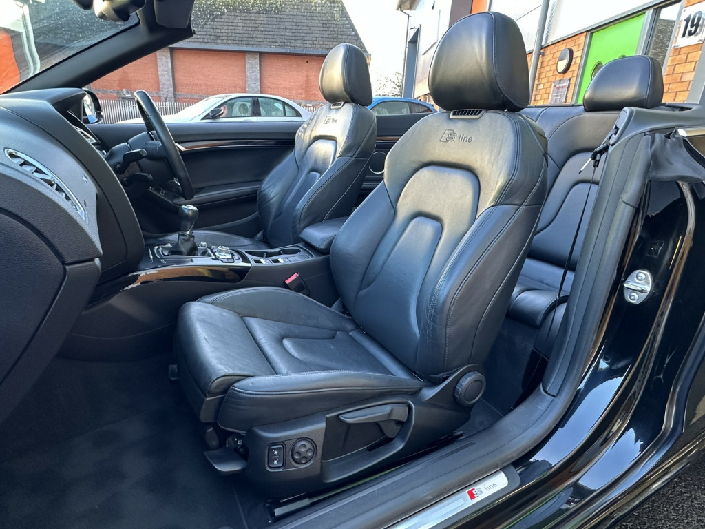 SORRY NOW SOLD! , , AN OUTSTANDING EXAMPLE OF AN AUDI A5 BLACK EDITION PLUS CONVERTIBLE. THIS CAR HAS A GREAT FACTORY SPECIFICATION WITH ALL THE DESIRABLE EXTRAS. IT BENEFITS FROM A FULL COMPREHENSIVE SERVICE HISTORY INCLUDING TIMING BELT REPLACEMENT. ITS IN STUNNING CONDITION AND HAS JUST BEEN FRESHLY SERVICED READY FOR SALE!, , Upgrades/Spec Includes: Mythos Black Metallic Paintwork, S Line Black Nappa Leather Interior, Xenon Plus Headlights, Bang & Olufsen Audio System, Reverse Camera, Heated Front Seats, Piano Black Interior Trim, Front & Rear Parking Sensors, Neck Heater, MMI Navigation Plus, Lumbar Support, High Gloss Styling Package, Automatic Dimming Interior & Exterior Mirrors, Multi Functional Steering Wheel, Cruise Control, DAB Tuner, Bluetooth Audio, Telephone Connectivity, Electric Folding + Heated Door Mirrors, Automatic Air Conditioning, Dual Climate Control, Parking Aid Plus, DVD Player, Tyre Pressure Monitoring System, Sports Package, Auto Lights, Auto Wipers. 2 x Keys, 19 Sports Cast Wheels. , SPEAK TO US ABOUT OUR FLEXIBLE LOW RATE FINANCE OPTIONS, OR TRY OUR FREE FINANCE ELIGIBILITY CHECKER ON OUR WEBSITE!, , ANY PART EXCHANGE ACCEPTED!