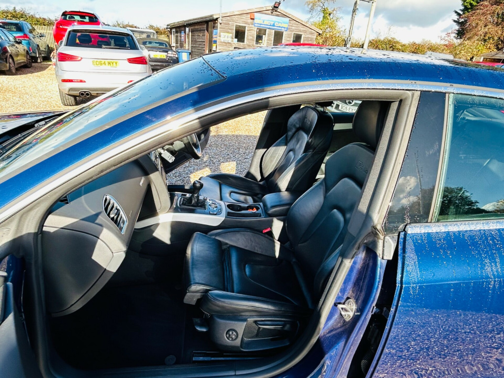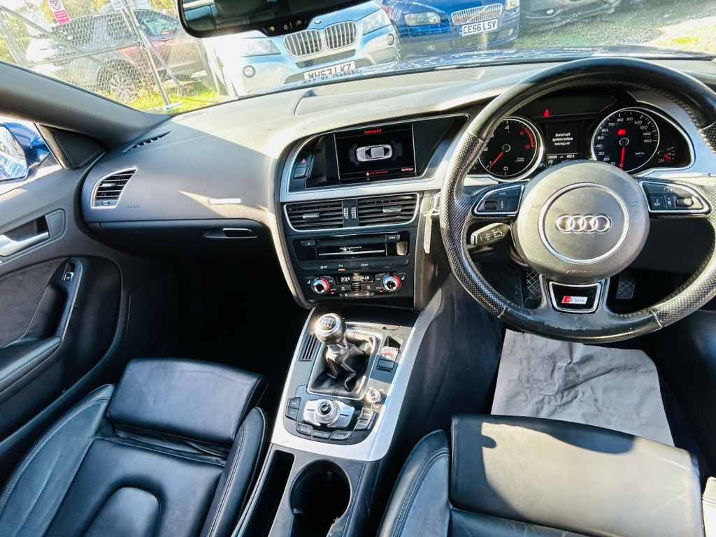 Audi A5 2.0 TDI SLINE Euro 6 5Dr- Has covered 120k with great history - Mot September 2026- Black heated Leather - Part Exchange Welcome - Extended Warranties Available v power socket - centre console, aux-in socket, audi sound system, concert radio, dab digital radio, display screen colour 7in high resolution, mmi navigation plus, mobile telephone preparation - bluetooth interface, speakers x10, 18in alloy wheels - 5-double-spoke design, anti theft locking wheel bolts, door mirrors - electrically adjustable and heated, electric windows - front and rear, exterior aluminium package, radiator grille - high gloss black, space saver spare wheel, styling package - s line exterior, abs - anti-lock braking system, airbags - driver, airbags - front passenger, airbags - front side, airbags - head level side for front and rear, alarm - thatcham category 1, esp - electronic stability programme, electromechanical parking brake, first aid kit, front passenger airbag deactivation switch, isofix child seat mounting for front passenger, isofix child seat preparation for rear seats with top tether, immobiliser, intelligent key, warning triangle, audi parking system plus - front, audi parking system plus - rear, colour drivers information system - dis, cruise control, edl - electronic differential lock, electromechanical power steering, rest recommendation system, sport suspension, tyre pressure monitoring system, auto opening boot lid, auto-dimming rear-view mirror, automatic wipers with rain sensor, car jack, climate control - electronic 3-zone, cloth headlining in black, cup holders - centre console, door sill trims - s line, front centre armrest, front and rear floor mats, gear knob - perforated leather, headlights - range adjustment, heated front seats, inlays - matt brushed aluminium, interior chrome package, leather armrests, manual front seat adjustment, pollen filter, seats - front electric lumbar support, seats - front sports with electric lumbar support, split folding rear seat, steering column - rake and reach adjustment, steering wheel - multi-function, steering wheel - s line 3-spoke leather, tool kit, front fog lights, headlight washers, headlights - bi-xenon plus, headlights - light sensor, led daytime running lights, led rear lights