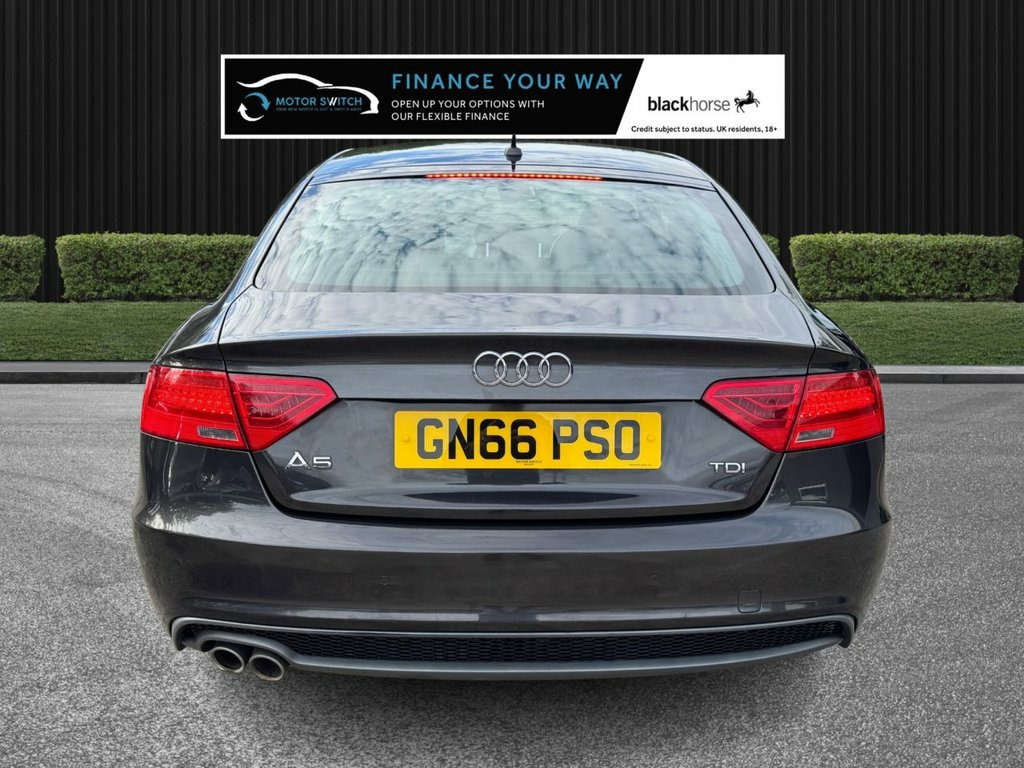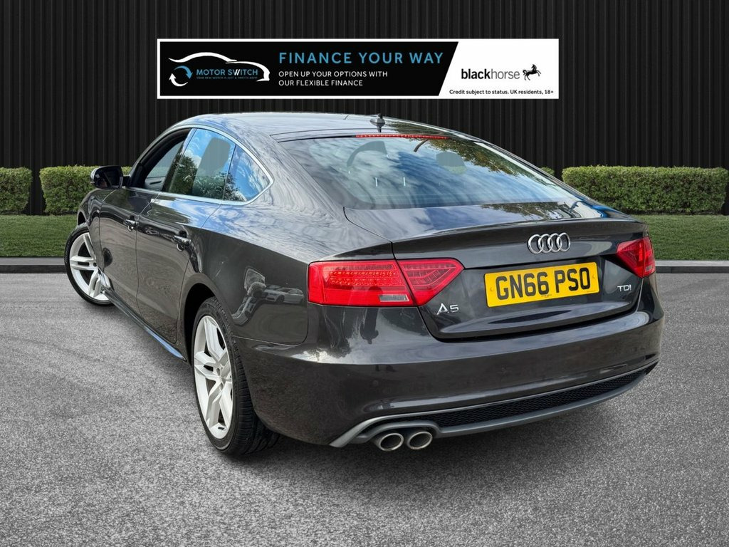 Title: Audi A5 TDI S Line Sportback 2.0 Diesel – Automatic, Full Warranty, Fresh Servicing Headline: Your new motor is just a switch away – Audi A5 TDI S Line Sportback 5dr Body: Model: Audi A5 TDI S Line Sportback Engine: 2.0-litre Diesel Transmission: Multitronic Automatic Emissions: Euro 6 Ownership: Only 2 former keepers Warranty: 12 months nationwide MOT: 12 months Service: Freshly serviced before delivery - With 4 X Service History Stamps last serviced at 74445 miles. Finance: Available from 10.9% APR Delivery: Available Part Exchange: Welcome Valeting: Fully valeted using Auto Smart products Vehicle history: HPI clear, mileage checked Key Features: 18-inch alloy wheels – 5-double-spoke design ABS + EDL + ESP for confident handling Audi Parking System Plus (front and rear) with sensors Auto opening boot lid; Auto-dimming rear-view mirror Automatic wipers with rain sensor; Climate control (3-zone) DIS (Colour Driver Information System) with 7-inch high-res display DAB Digital Radio; Concert radio MMI Navigation Plus; Bluetooth Phone preps and mobile connectivity Leather sport seats with electric lumbar, S-Line 3-spoke steering wheel Perforated leather gear knob; Heated front seats ISOFIX child seat mounts (front & rear) Sport suspension for a more dynamic drive Tyre Pressure Monitoring System; Electric windows (front & rear) Front and rear electric parking brake; Power steering with rake/reach Paddle shift on stee 12V Power Socket - Centre Console, 18in Alloy Wheels - 5-Double-Spoke Desig, ABS - Anti-Lock Braking System, AUX-IN Socket, Airbags - Driver, Airbags - Front Passenger, Airbags - Front Side, Airbags - Head Level Side For Front and , Alarm - Thatcham Category 1, Anti Theft Locking Wheel Bolts, Audi Parking System Plus - Front, Audi Parking System Plus - Rear, Audi Sound System, Auto Opening Boot Lid, Auto-Dimming Rear-View Mirror, Automatic Wipers with Rain Sensor, Car Jack, Climate Control - Electronic 3-Zone, Cloth Headlining in Black, Colour Drivers Information System - DIS, Concert Radio, Cruise Control, Cup Holders - Centre Console, DAB Digital Radio, Display Screen Colour 7in High Resol
