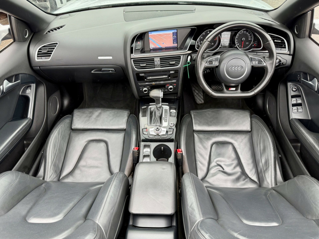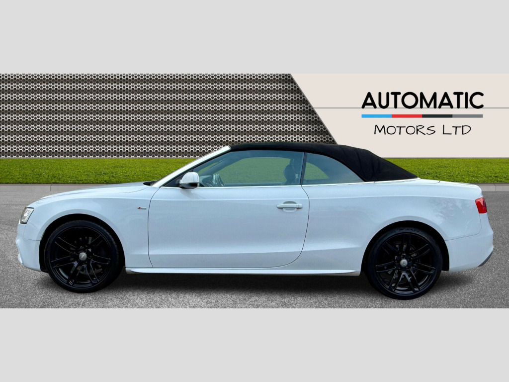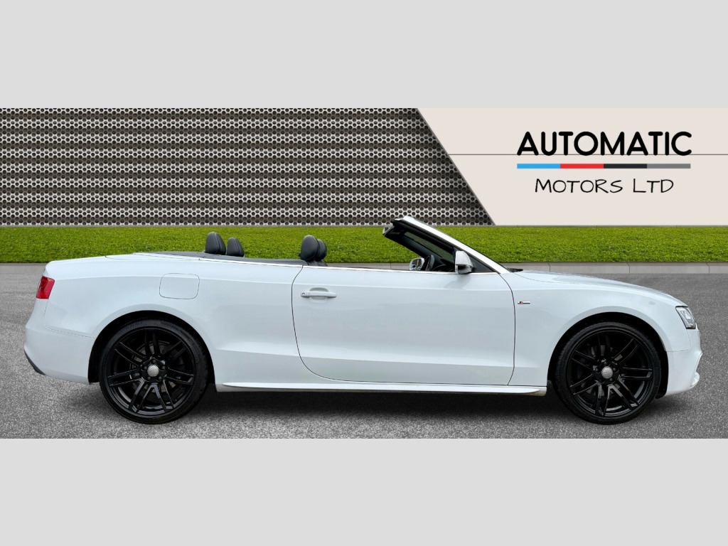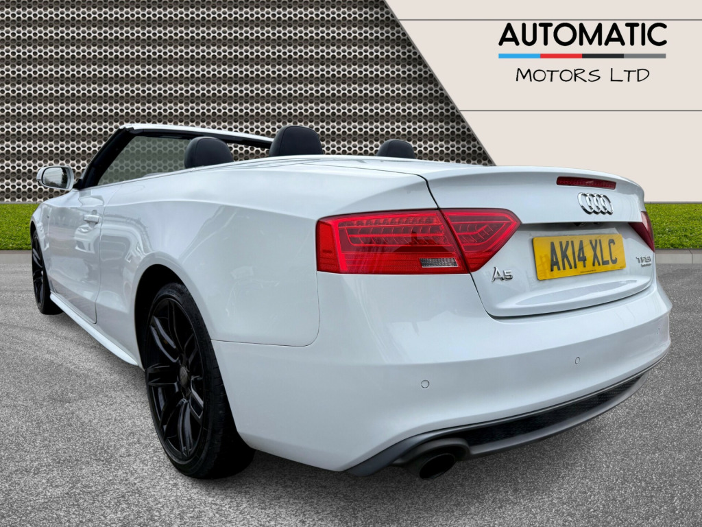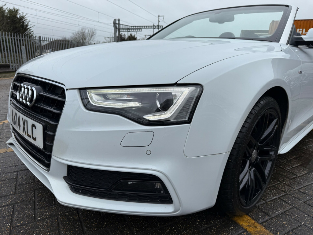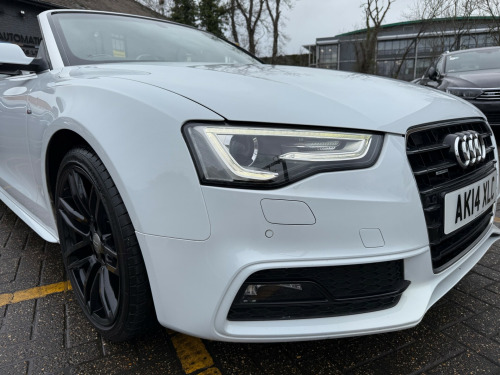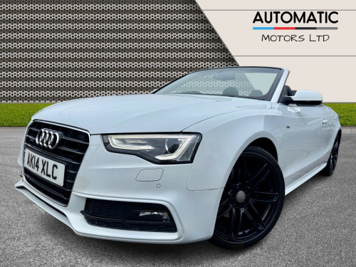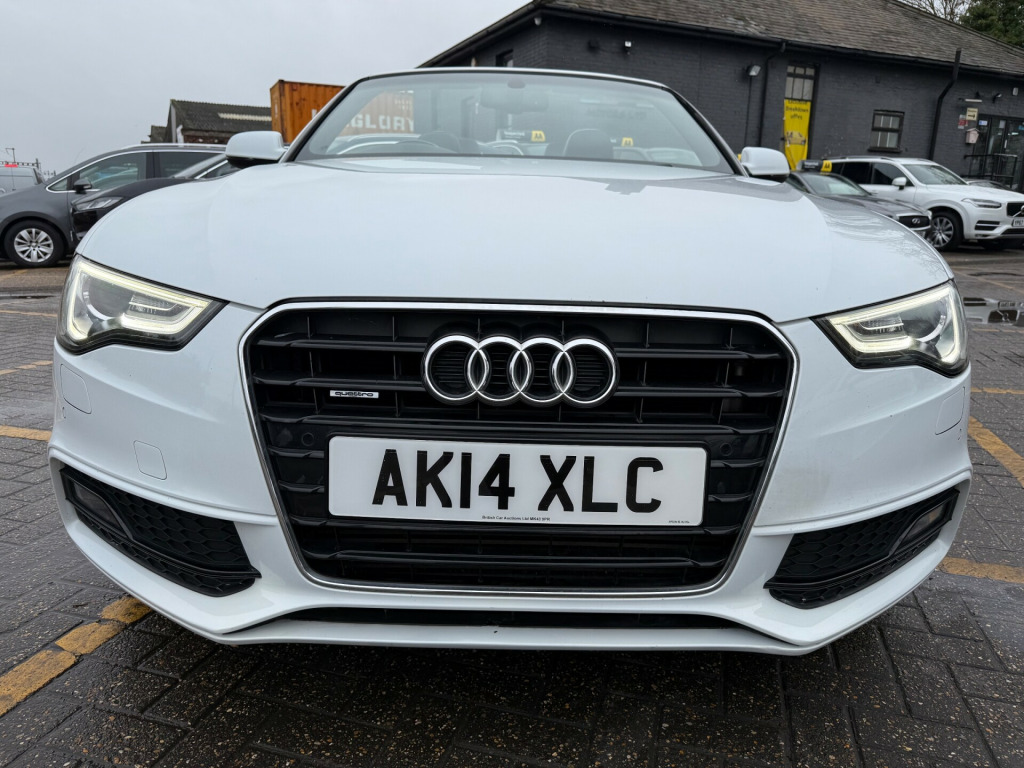 2 KEYS, ULEZ FREE, FRESH SERVICE, MOT 06/05/2025, NAVIGATION, BLUETOOTH, PARKING SENSORS, LEATHER SEATS, 2 FORMER KEEPERSThis sleek 2014 Audi A5 Cabriolet boasts just 71100 miles on the clock and is the perfect choice for a stylish, open-top drive. Powered by a 2.0 TFSI S line Special Edition Convertible 2dr Petrol S Tronic quattro Euro 6 (s/s) engine, this car is not only powerful with 225 ps, but also fuel-efficient. With its MOT expiring on 06/05/2026 and ULEZ compliance, it offers peace of mind for city driving. This 2-door convertible has 4 seats, making it ideal for both solo trips and small group outings. Its features include 12V Power Socket, AMI - Audi Music Interface, AUX-IN Socket, Bang and Olufsen Sound System, and Concert Radio, ensuring a comfortable and enjoyable ride every time. Don't miss out on the chance to own this exquisite Audi A5 Cabriolet. v power socket - centre console, ami - audi music interface, aux-in socket, bang and olufsen sound system, concert radio, dab digital radio, display screen colour 7in high resolution, display screen colour tft 7in high resolution, mmi navigation plus, mobile telephone preparation - bluetooth interface, speakers x10, 19in alloy wheels - 7-double-spoke design, anti theft locking wheel bolts, black hood, door mirrors - electrically adjustable and heated, electric windows - front and rear, exterior aluminium package, fully automatic acoustic hood with led passenger reading lights, radiator grille - high gloss black, space saver spare wheel, styling package - s line exterior, wind deflector, abs - anti-lock braking system, airbags - driver, airbags - front passenger, airbags - front side, alarm - thatcham category 1, esp - electronic stability programme, electromechanical parking brake, first aid kit, isofix child seat mounting for front passenger, isofix child seat preparation for rear seats with top tether, intelligent key, warning triangle, audi parking system advanced, audi parking system plus - front, audi parking system plus - rear, colour drivers information system - dis, cruise control, electromechanical power steering, rest recommendation system, sport suspension, tyre pressure monitoring system, auto opening boot lid, auto-dimming rear-view mirror, automatic wipers with rain sensor, car jack, climate control - electronic 3-zone, cup holders - centre console, door sill trims - s line, front centre armrest, front and rear floor mats, gear knob - perforated leather, head level heating, headlights - range adjustment, heated front seats, heated outer rear seats, inlays - matt brushed aluminium, leather armrests, pollen filter, seats - front sports with electric lumbar support, split folding rear seat, steering column - rake and reach adjustment, steering wheel - 3-spoke leather, steering wheel - multi-function, tool kit, front fog lights, headlights - bi-xenon plus, headlights - light sensor, headlights washers, led daytime running lights, led rear lights