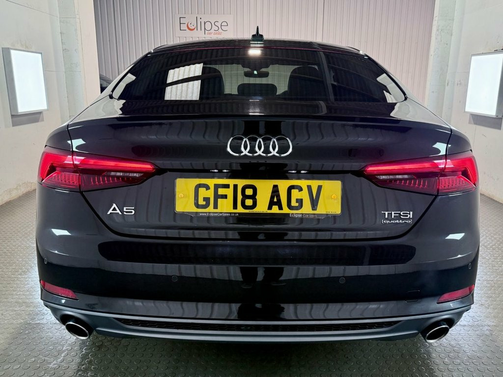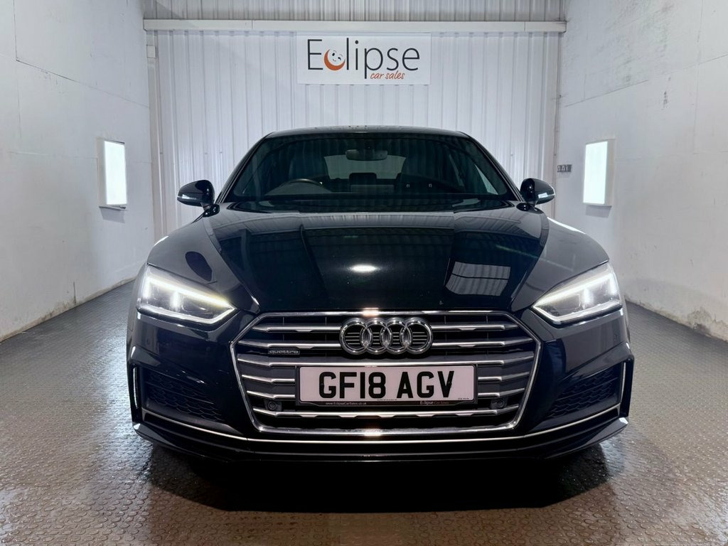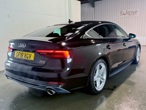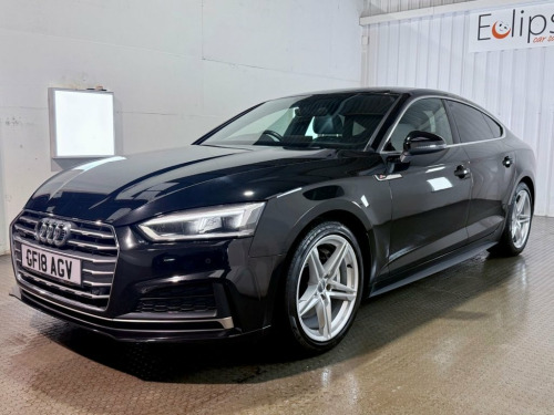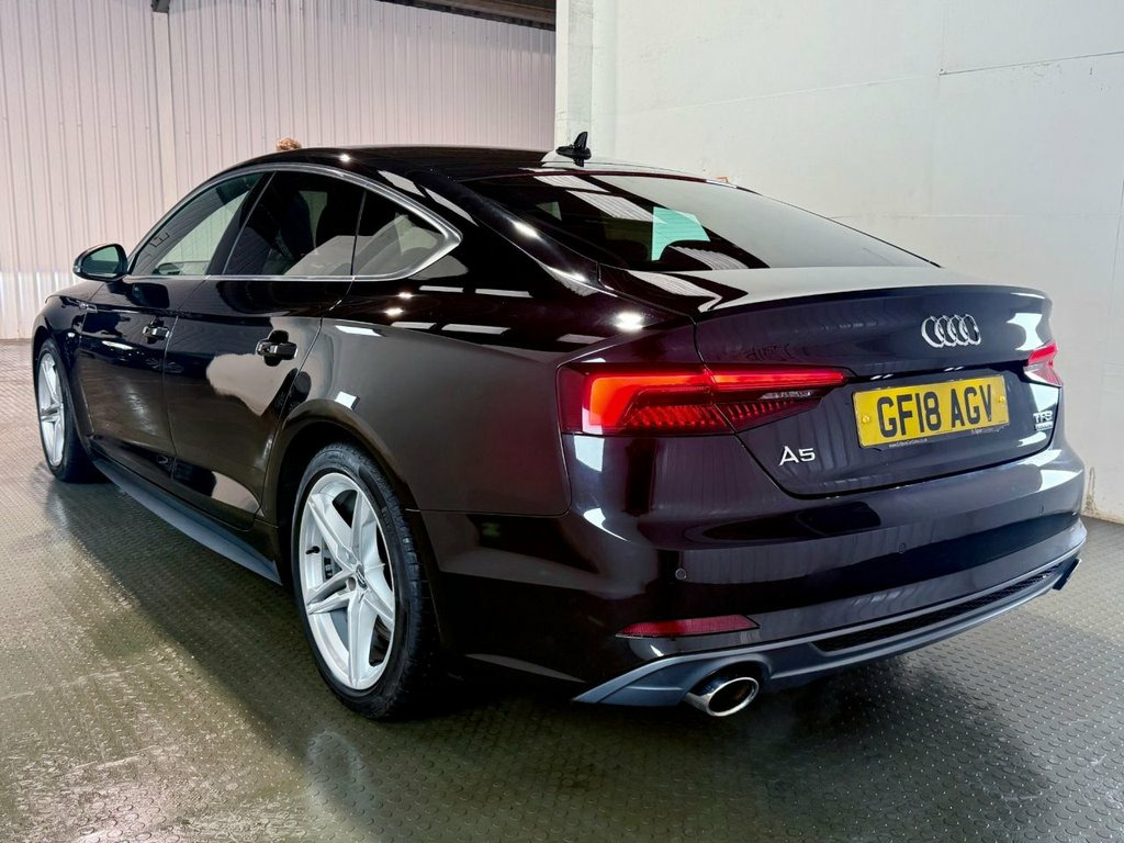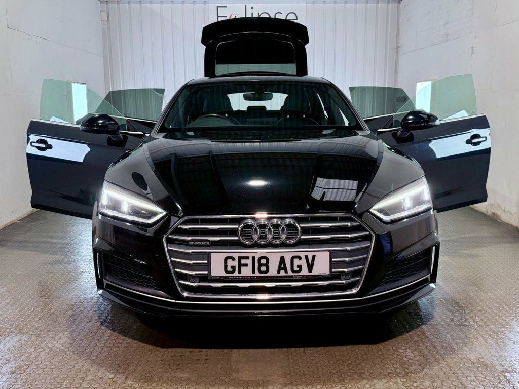 Audi A5 2.0 TFSI S Line Sportback first registered in April 2018 (18 Reg). Finished in Brilliant Black with a Black Leather Interior and 18 inch Alloy Wheels. Spec includes Technology Package including Virtual Cockpit | Cruise Control with Speed Limiter | Electric Heated Front Seats | Electric Heated Folding Wingmirrors | Dual Zone Climate Control | DAB Radio | Front and Rear Parking Sensors | Bluetooth Connectivity | Satellite Navigation | Configurable Drive Modes | Multifunction Steering Wheel | Powered Tailgate. Serviced at 15987 Miles | 27282 Miles | 33259 Miles | 36559 Miles | 42469 Miles and will be serviced by us upon sale. 18in Alloy Wheels - 5-Twin-Spoke Star De, 2 x USB Charging Ports and 1 x AUX-IN, 4-Way Electric Lumbar Support, 6-Airbag System, ABS - Anti-Lock Braking System, Air Inlets - Horizontal Inlay in Matt Al, Anti Theft Locking Wheel Bolts, Anti-Theft Alarm, Audi Connect Infotainment Services - 3 M, Audi Connect Safety and Service, Audi Drive Select, Audi Smartphone Interface, Audi Sound System, Auto-Dimming Rear-View Mirror, Bluetooth Interface, Body Coloured Door Mirrors, Brilliant Black, CD Drive, Cloth Headlining in Black, Colour Drivers Information System with 7, Contrast Stitching on Seats - Steering W, Cruise Control with Speed Limiter, DAB Digital Radio Reception, Deluxe 3-Zone Electronic