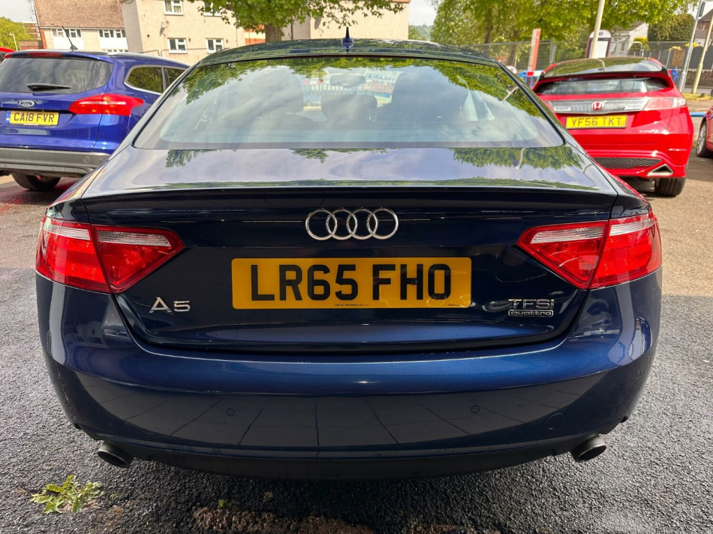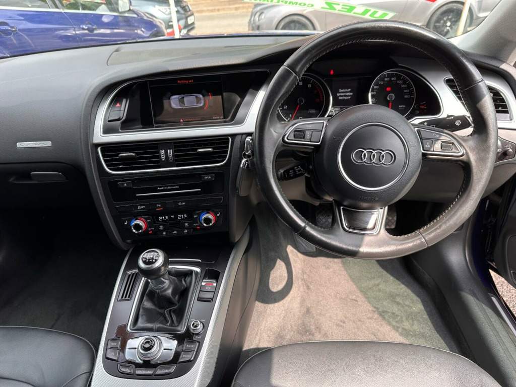 2015 AUDI A5 2.0 TFSI SE Technik Quattro. , Only 30,931 Miles in Blue metallic,, , 5 door, Petrol, Manual. , ULEZ Compliant. , Service History: 4 Services (7k, 14k, 22k, 28k ), , The 2015 Audi A5 2.0 TFSI SE Technik Quattro is a stylish and well-equipped premium hatchback that blends performance, practicality, and luxury. Heres a breakdown of its key features and highlights:, , ???? Specifications, Engine: 2.0L TFSI Petrol, , Drivetrain: Quattro (All-Wheel Drive), , Transmission: 6-speed Manual, , Doors: 5, , Mileage: Only 30,931 miles, , Fuel: Petrol, , ULEZ Compliant: Yes, , Color: Blue Metallic, , ???? Service History, Full Service Record with 4 services:, , At 7k, 14k, 22k, and 28k miles, , ???? Infotainment & Tech, Audi MMI Navigation Plus with a 7 high-resolution color display, , Audi Music Interface (AMI), , Concert Radio and DAB Digital Radio, , Bluetooth phone preparation, , Audi Sound System, , Colour Driver Information System (DIS), , ???? Parking & Driving Aids, Audi Parking System Plus (Front and Rear Sensors), , Cruise Control, , Rest Recommendation System (fatigue alert), , Tyre Pressure Monitoring System, , ????️ Interior Features, 3-Zone Electronic Climate Control, , Heated Front Seats, , Manual Front Seat Adjustment, , Auto-Dimming Rear-View Mirror, , Split Folding Rear Seats, , Remote Boot Release, , Multi-function Steering Wheel, , Rake and Reach Adjustable Steering Column, , ???? Exterior & Lighting, 18 10-Spoke Exclusive Design Alloy Wheels, , Electrically Adjustable and Heated Door Mirrors, , Halogen Headlights with Light Sensor and Range Adjustment, , Daytime Running Lights, , Front Fog Lights, , Auto-Opening Boot Lid, , ????️ Safety & Security, ABS, Traction Control, ESP (Electronic Stability Programme), , Electromechanical Parking Brake, , Airbags including passenger airbag deactivation, , ISOFIX child seat mounts (front and rear with top tether), , Alarm (Thatcham Category 1), , Immobiliser, , Intelligent Key, , Anti-theft locking wheel bolts, , ???? Summary, This A5 is a refined, low-mileage, all-wheel-drive vehicle with excellent tech, comfort, and safety features. Its SE Technik trim and Quattro drivetrain make it ideal for drivers wanting luxury and control, especially in mixed driving conditions. , Finance available with low rates and low deposit (in some cases with zero deposit), tailor made to suit your budget. , *Fixed interest rate and payment throughout the life of the agreement, , *Flexible deposit, , *Flexible repayment terms, , *Click on the FINANCE button for monthly payment calculator and application form. , Deposit secures. All cars come with 3 months Parts and Labour warranty and a Full MOT included in the Screen price. LOW rate - LOW deposit Finance available (Subject to status). Online Finance proposal forms are available on this website. All major debit cards accepted. Any inspection welcome. Part exchange welcome. Delivery arranged. Indoor viewing available. More cars available at our Showroom.