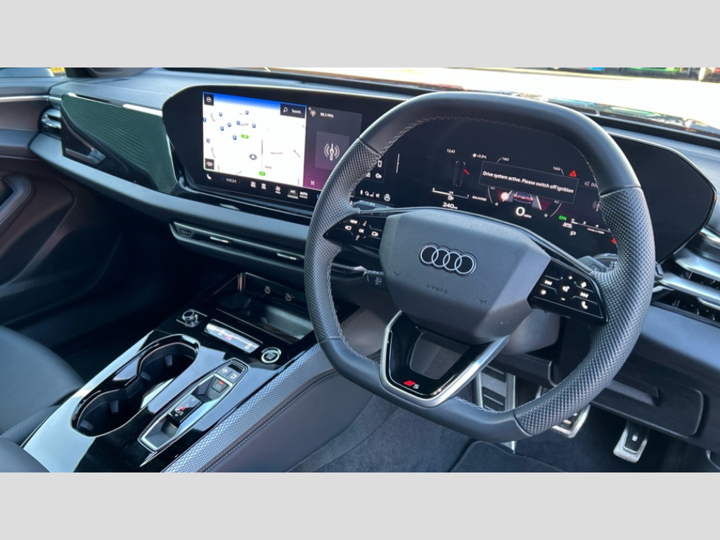 Audi A5 2.0 TFSI 204 S line 5dr S Tronic Adaptive cruise control, Advanced driver attention and fatigue montior, Audi application store, Audi assistant, Audi connect emergency call and service, Audi drive select, Audi virtual cockpit plus with 11.9" OLED colour display, Automatic start/stop system with coasting functionality, Camera based traffic sign recognition, Intersection assist, Lane departure warning, MMI navigation plus with high resolution 14.5" OLED touchscreen colour display, Park assist plus, Parking system plus with 360 display, Progressive steering with servotronic, Rear view camera, Smartphone interface, Swerve assist and turn assist, Traffic sign based speed limiter, Sports suspension lowered by 20mm, 2 USB-C ports in both the front and rear, Audi sound system impressive sound with 8 loudspeakers including centre speaker and subwoofer, 6-channel amplifier with a total output of 180 watts, DAB digital radio reception, Smartphone compartment with wireless charging, Aluminium roof rails, Aluminium window trims, Auto dimming rear view mirror, Body colour door mirrors, Door mirrors - electrically adjustable, heated, folding and auto dimming on both sides, Front and rear electric windows, Front door sill trims with aluminium inlays, illuminated with 'S' logo, High beam assist, LED headlights Plus incl. digital daytime running lights, turning light, all-weather light, motorway light, manouevring light and intersection light, LED rear lights pro incl. dynamic rear indicators and illuminated light strip with animated coming and leaving home function, LED third brake light, Privacy glass, Rear and side windows with heat insulating glass, Rear side wing doors, Rear wash/wipe, S Line badges on the front wings, S line bumpers, radiator grille and diffuser in phantom black and diffuser insert in matt anthracite, White rhombus logo projection light in exterior mirrors, Windscreen with acoustic glazing, 3 rear headrests, 3 seat rear bench, 3 spoke leather steering wheel with multi-function buttons with touch control, flattened on top and bottom, with S badging and contrast stitching, 3-zone automatic climate control, 40:20:40 split folding rear seat bench with centre armrest and cup holders, Comfort front centre armrest, Front and rear floor mats, Front seats with manual adjustment for position and 4-way electric lumbar support, Front sport seats with integrated headrest and S embossed logo, Headlining in black cloth, Heated front seats, i-Size child seat mounting on the front passenger side and outer rear seats, i-Size and top tether on the outer rear seats, Luggage compartment lid, electrically opening and closing, Manual steering column height and depth adjustment, Single front passenger seat, Stainless steel pedals and footrest, Steering wheel grips in perforated leather and shift paddles, Ambient lighting package plus - A5, 3x3 point rear seat belts, Driver airbag, Electric child safety locks, First aid kit with warning triangle and vests, Front emergency brake assist, Front passenger airbag, Front passenger airbag deactivation, Front side airbags with head airbag system and front interaction airbag, Hill hold assist, Seat belt monitoring with rear seat occupant reminder, Tyre pressure loss indicator, Anti theft alarm, Anti-theft wheel bolts, Keyless Go, Accent surfaces and control buttons in gloss black, Black dashboard with contrast stitching, Inlays in matt brushed aluminium with linear embossing, anthracite, Softwrap in leatherette with contrast stitching, Upper and lower interior elements in leatherette, Tyre repair kit