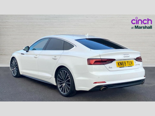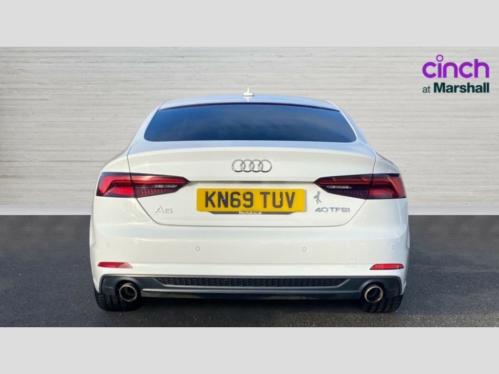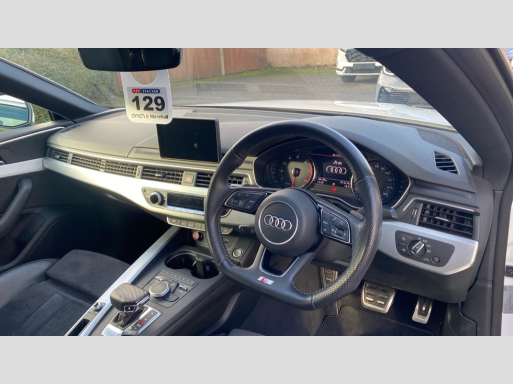 Audi A5 40 TFSI S Line 5dr S Tronic 7" Colour driver information system, Audi connect, Audi drive select, Audi parking system plus with front and rear sensors, Audi smartphone interface, Automatic start-stop system with coasting functionality and efficiency programme, Bluetooth interface, Electro-mechanical power steering, MMI Navigation, Power tailgate, Service interval indicator, Voice control system, 2 x USB charging port with aux input socket, CD player, DAB Digital radio, Two SDXC card slots, Air inlet in matt aluminium with horizontal inlay, Aluminium roof frame and window trim, Auto dimming rear view mirror, Black grained rear grille, Body colour bumpers, Body coloured door mirrors, Chrome plated exhaust pipe, Electric adjustable heated door mirrors, Electric front windows, Front fog lights, High beam assistant, High gloss black B pillar trims and triangular rear door trim, Honeycomb side air inlet in titan black, Rain and light sensors, Rear diffuser in Twilight grey matt with honeycomb grille, S line badges on front wings, S Line body styling, S Line front and rear bumpers, S Line side skirts in black, S line sill plates, Twilight grey matt radiator grille in matt aluminium inlay, Windscreen with acoustic glazing, 40/20/40 split folding 3 seater rear bench seat, Adjustable steering column, Black headlining, Black perforated leather gearknob, Centre console with cupholders, Contrast stitching on seats, steering wheel and gear lever gaiter, Deluxe 3 zone electronic climate control, Front centre armrest, Front head restraints, Front/rear floor mats, Gearshift paddles, Illuminated door sill trim with S logo, ISOFIX child seat mounting and top tether, Jack and tool kit, Luggage compartment mat, Rear headrests, S embossed logo on front sport seats, Stainless steel pedals and foot rest, Non Smokers pack, 3x3 point rear seatbelts, 6 airbags - Driver, front passenger, curtain and side airbags, Electromechanical parking brake, Electronic Stabilisation Control (ESC) including ABS, ASR and EDL, Front passenger airbag deactivation, Height adjustable front seatbelts, Hill hold function, Multi-Collision braking, Pop-up bonnet for pedestrian protection, Pre sense city, Seatbelt monitoring, Tyre pressure warning, Variable restraint system, Warning triangle and first aid kit, Anti theft alarm system, Anti theft wheel bolts, Immobiliser, Keyless Go, Remote central locking, Tyre repair kit