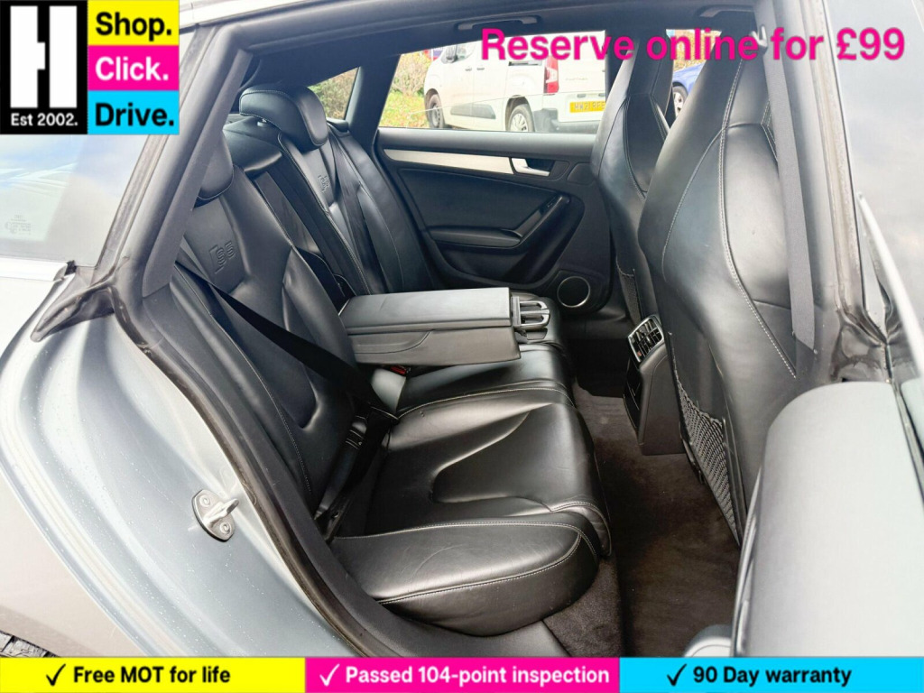 Audi Drive Select, Audi Parking System Plus, Bang & Olufsen advanced Sound System, Cruise Control, DAB Digital Radio, Door Mirrors - Electrically Folding with Auto-Dimming Function, Electric Tilt&Slide Sunroof, Privacy Glass, Heated Front Seats, Leather- Silk Nappa Leather, 10 Speakers, 12V Power Socket x2, 19in 5 parallel Spoke design Alloy Wheels, 19in Alloy Wheels - 20-Spoke Design, ABS - Anti-Lock Braking System, Acoustic Parking System - Rear, Airbags - Driver, Airbags - Front Passenger, Airbags - Front Side System, Alarm - Thatcham Category 1, Automatic Wipers with Rain Sensor, Bi-Xenon Headlights, Climate Control - Electronic 3-Zone, Cloth Headlining in Black, Concert Radio & CD player with MP3 SD card reader & Aux input socket, Concert Radio - MP3-CD Player, Delete engine designation at Rear, Deletion of model & engine designation at Rear, Door Mirrors - Electrically Adjustable and Heated, Drivers Information System - DIS, ESP - Electronic Stability Programme, Electric Windows - Front and Rear, Electrically Adjustable 4-Way Lumbar Support, First Aid Kit, Front Centre Armrest, Front Fog Lights, Front&Rear floor mats, Headlights - Automatic Adjustment, Headlights Washers, ISOFIX child seat preparation Front and Rear with passenger airbag deactivation switch, Inlays - Matt Brushed Aluminium, Intelligent Key, Interior Light Package, Light and Rain Sensor Package, Matt brushed Aluminium inlay, Piano Black finish inlay, Power Steering - Servotronic, S Sport Suspension, Seats - Front Electric Adjustment, Space Saver Spare Wheel, Split-Folding Rear Seats, Steering Column - Rake and Reach Adjustment, Steering Wheel - 3-Spoke Leather - Multi-function - Sports, Through-Load Facility with Ski-Snowboard Bag