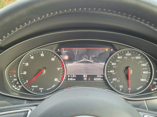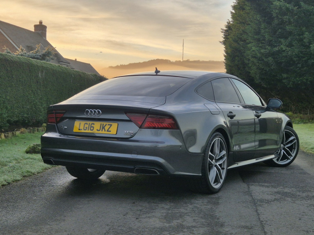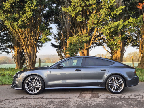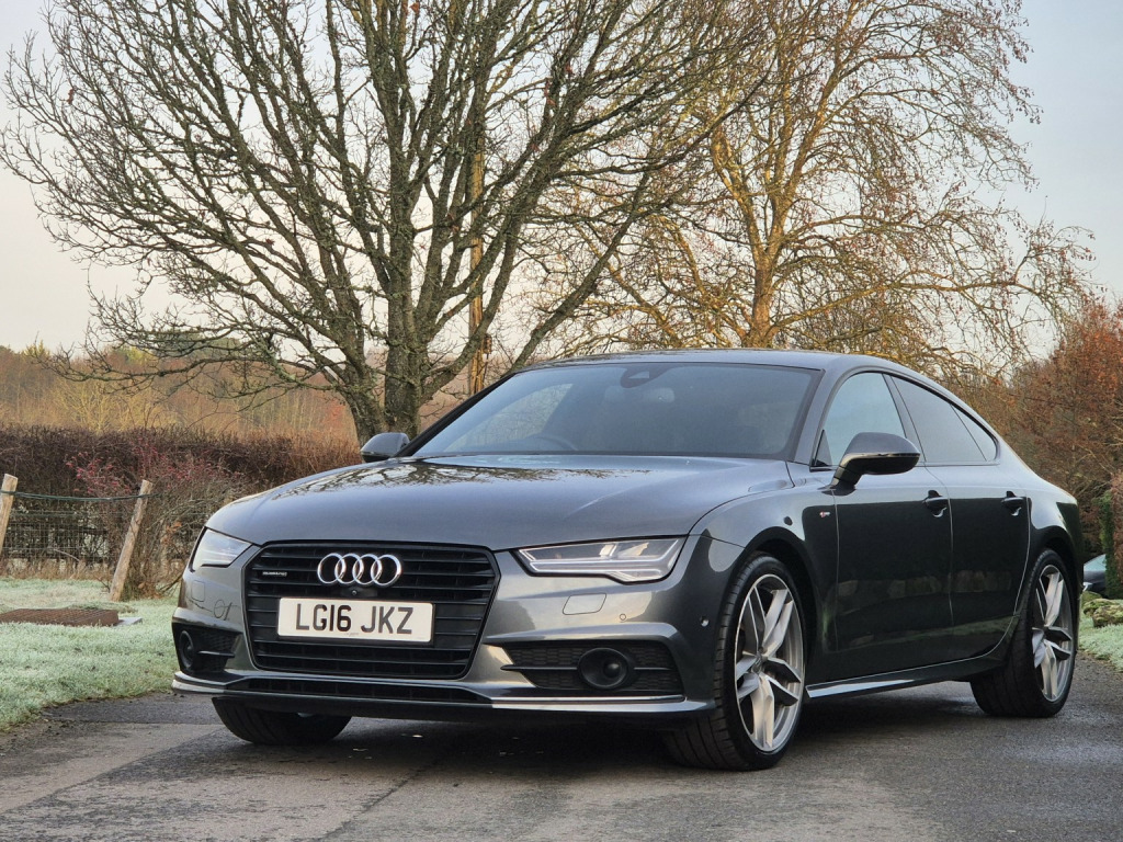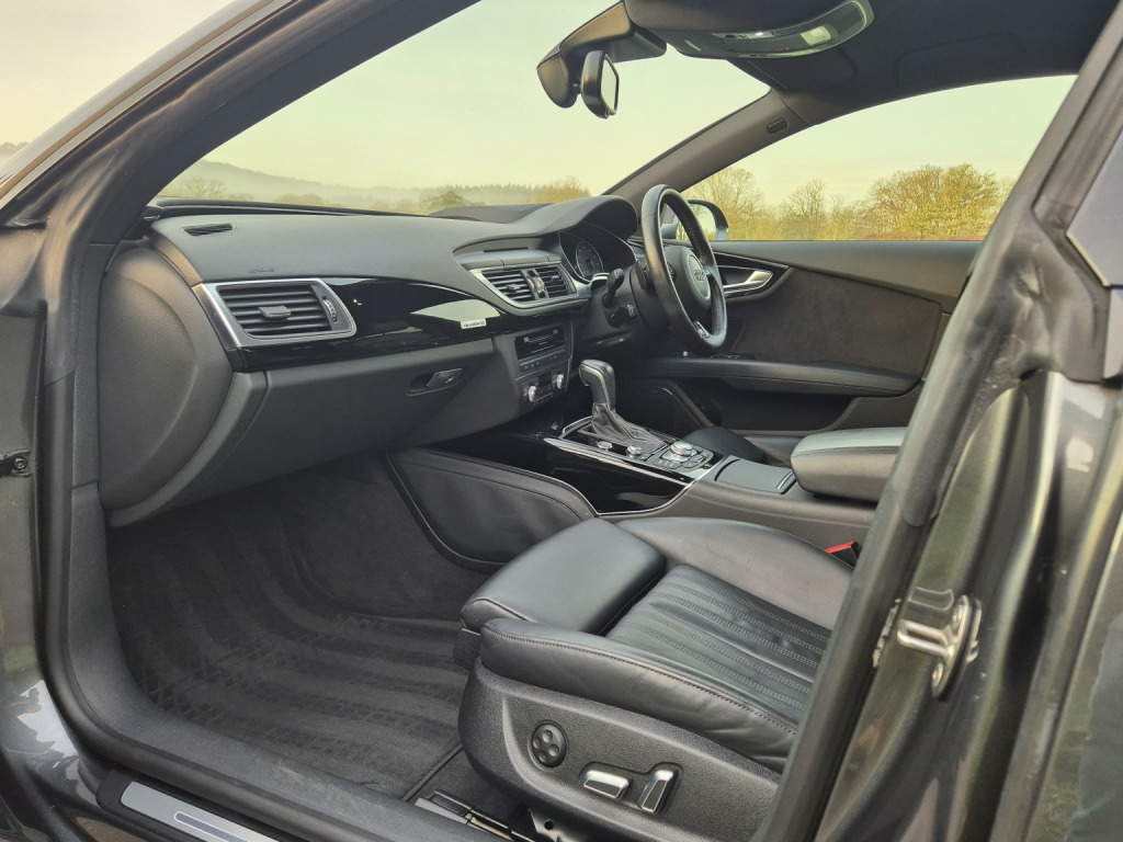 Extremely rare petrol 3.0 TFSI supercharged V6 Quattro 2016 Audi A7 Black Edition, producing 330 hp, finished in Daytona Grey metallic with black Fine Nappa leather interior and 42,000 miles. A seldom-seen specification and a genuine alternative to the more common diesel models. , Factory upgrades include electric memory seats, BOSE surround sound system, Night Vision Assist with pedestrian recognition, adaptive cruise control, head-up display, surround camera system, Parking System Advanced, Advanced Key (keyless entry and start), heated steering wheel, heated front seats, and 4-zone climate control. , Further features include 20 twin-spoke alloy wheels, electric tailgate, Audi Pre-Sense safety system, speed limit display, Black Edition exterior styling, and full LED headlights with dynamic indicators. , Supplied with full Audi main dealer service history, MOT through to December 2026, 2 keys, and presented in fantastic condition throughout.