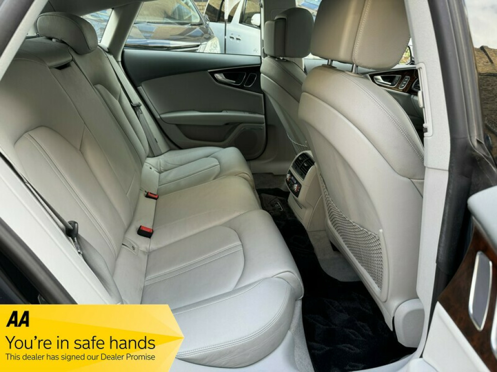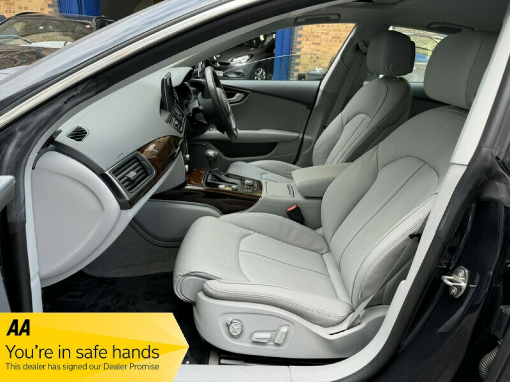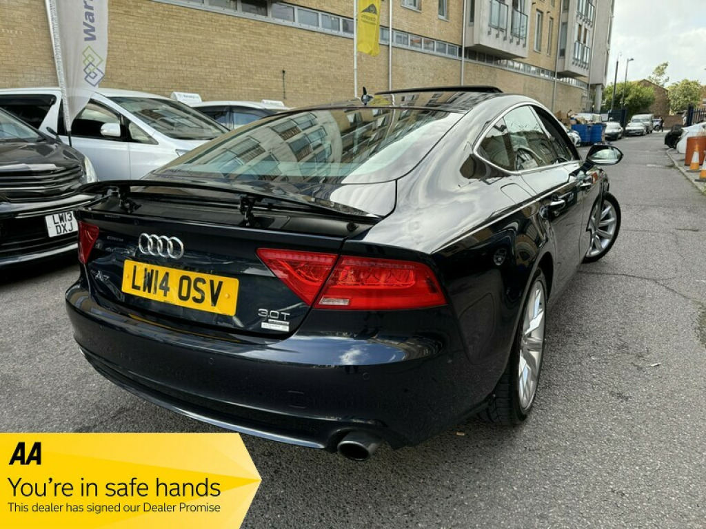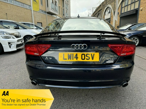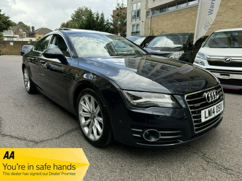 Audi A7 3.0 TFSI V6 SE Sportback S Tronic quattro Euro 5 (s/s) 5dr SUNROOF+LEATHER+360 CAMERA+AA+ Key facts Print summary Model year: 2014 (14) Fuel type: Petrol Mileage: 30,892 Transmission: Automatic Engine size: 3.0L Colour: Blue + FINANCE AVAILABLE+ ONLY COVERED 30000 MILES WARRANTED AND VERIFIED+3 SETS OF KEYS+1 YEAR COMPREHENSIVE WARRANTY INCLUDING PRICE FOR COMPLETE PEACE OF MIND,1 YEAR A A BREAK DOWN COVER+ MOT TILL 18/08/2026+1 YEAR A A BREAK DOWN COVER+FULL LEATHER TRIM+SUNROOF TILT AND SLIDE+KEY LESS ENTRY AND KEY LESS GO+MEMORY FRONT SEATS+XENON HEAD LIGHTS+360 CAMERA+ PARK ASSIST+FRONT AND REAR HEATED SEATS+KEY LESS ENTRY AND KEY LESS GO+4 ZONE CLIMATE CONTROL+This 2014 Audi A7 TFSI V6 SE boasts exceptionally low mileage for its age, having covered just 30,892 miles. Serviced recently on 2025-09-10 at 30,892 miles, this Four Wheel Drive model comes with an MOT valid until August 2026. The SE trim level includes a wealth of desirable features, such as the Advanced Key with Hands Free Boot Opening System for effortless access, and an Electric Sunroof for an open and airy cabin. For enhanced driving comfort and safety, it is equipped with Adaptive Cruise Control featuring Side Assist and Active Lane Assist, along with the Audi Parking System Advanced which incorporates a reversing camera and front sensors. Furthermore, the comfort seats are heated for both front and rear occupants, ensuring a pleasant journey in all conditions., , The performance of this Audi A7 is equally impressive, with a powerful 3.0 litre petrol engine enabling it to accelerate from 0 to 62mph in a swift 5.6 seconds. This acceleration figure highlights its dynamic capability, setting it apart from many other vehicles in its class. The generous boot space offers practicality for everyday use and longer trips, making it a versatile choice. The combination of its low mileage, comprehensive service history, and advanced features like the hands free boot opening and adaptive cruise control, demonstrate a level of care and specification that elevates this A7 above the ordinary
