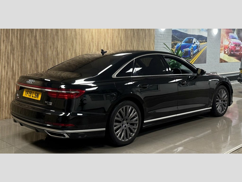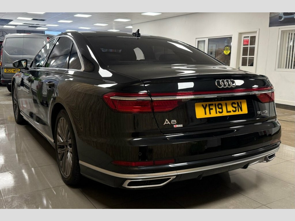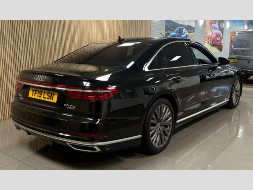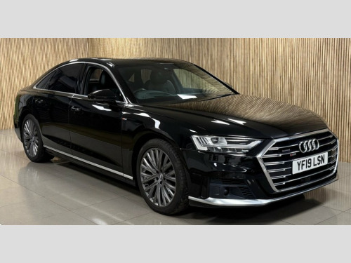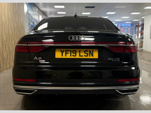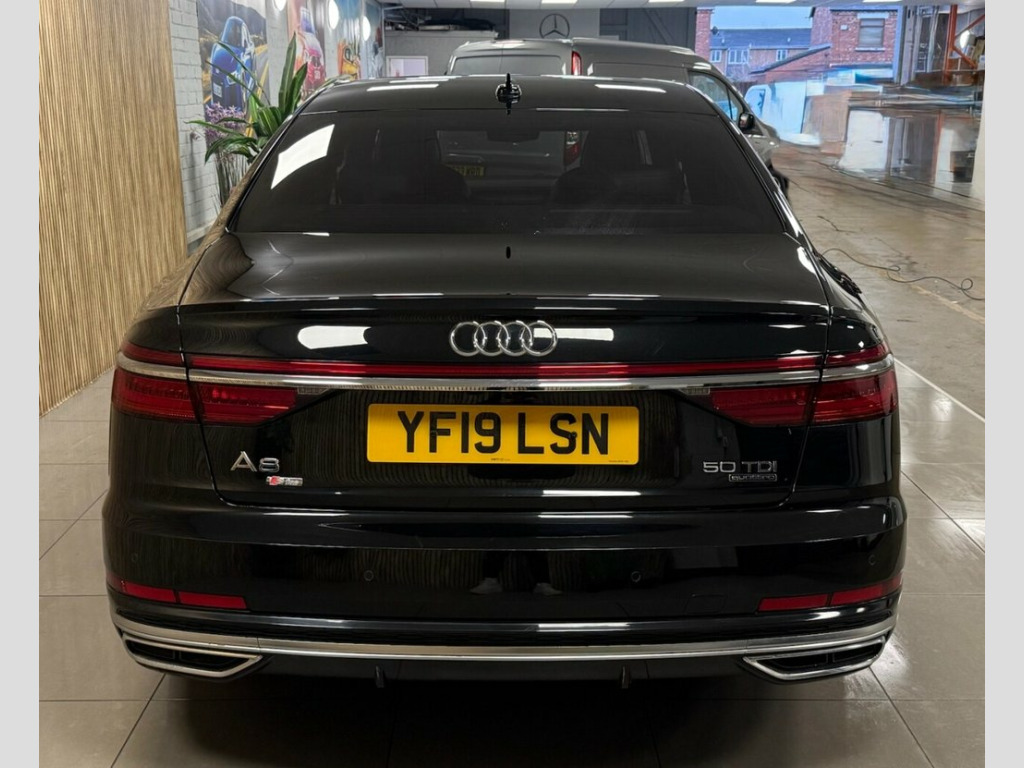 YF19LSN AUDI A8 3.0 TDI V6 50 S line Saloon 4dr Diesel Tiptronic quattro Euro 6 (s/s) (286 ps) 48,749 miles | Diesel | Automatic Tiptronic | quattro AWD | Euro 6 | Full Service History | Excellent Condition A superbly presented Audi A8 50 TDI S line, delivering flagship luxury, effortless performance and advanced technology in a refined executive saloon. With the powerful 286ps V6 diesel engine, smooth Tiptronic automatic gearbox and legendary quattro all-wheel drive, this A8 offers exceptional comfort and confidence in all conditions. Finished in Mythos Black with Valcona leather sports seats, it combines understated elegance with unmistakable presence, backed by a full service history and sensible mileage. The S line specification enhances the A8's already impressive cabin with a more dynamic look and feel, while retaining the serene ride quality and space expected of Audi's flagship. The interior is beautifully crafted, quiet and supremely comfortable, making it ideal for long-distance driving, executive use or those seeking a true luxury car experience. TECH & FEATURES S line specification Valcona leather sports seats Touchscreen MMI infotainment with HDD navigation Tiptronic automatic transmission quattro all-wheel drive Virtual cockpit digital display Front and rear parking sensors Reversing camera Cruise control Climate control Electric, heated front seats LED headlights Keyless start Alloy wheels High quality interior finishes throughout On the road 19in Alloy Wheels - 15-Spoke Design Cast, 2-Zone Automatic Air Conditioning, 22-Way Electrically Adjustment Seats wit, 230V Socket, 4-Way Electric Lumbar Support for Front , ABS - Anti-Lock Braking System, Acoustic Double Glazing, Adaptive Air Suspension, Adaptive Cruise Assist, Advanced Key, Airbags - Driver, Airbags - Front Passenger, AMI - Audi Music Interface, Anti Theft Locking Wheel Bolts and Wheel, Anti-Theft Alarm with Tow-Away Protectio, Audi Connect Infotainment Services (36 M, Audi Connect Safety and Service - e-call, Audi Drive Select, Audi Parking System Plus, Audi Phone Box with Wireless Charging, Audi Pre-Sense Front, Audi Smartphone Interface, Audi Sound System, Audi Virtual