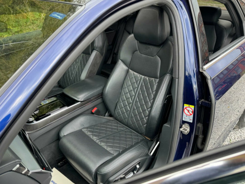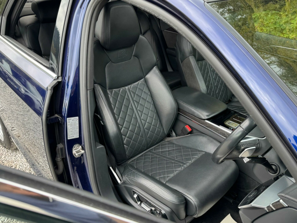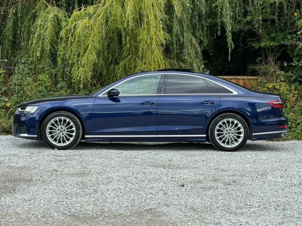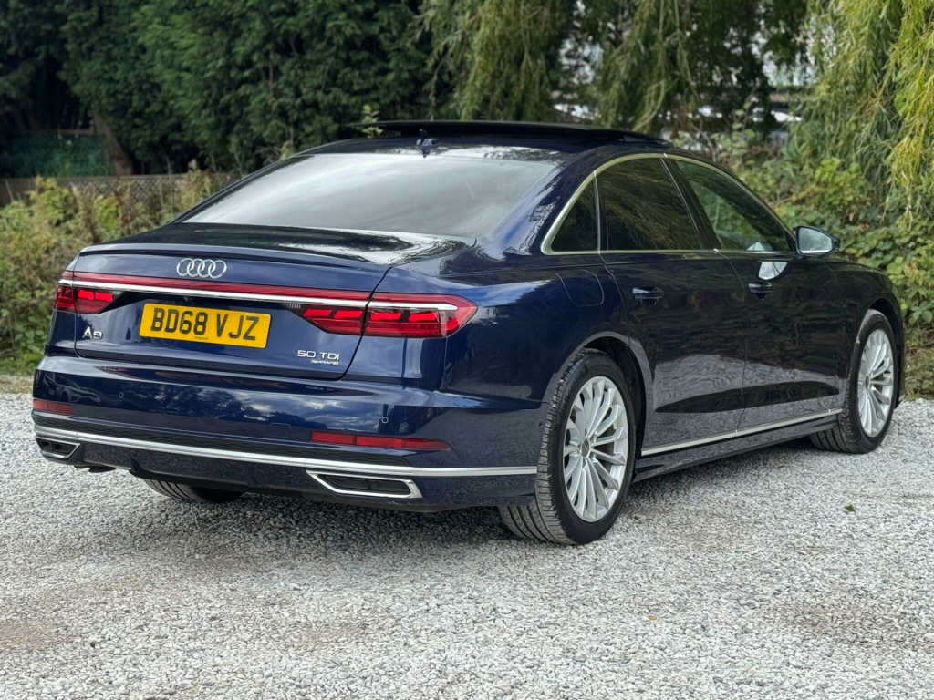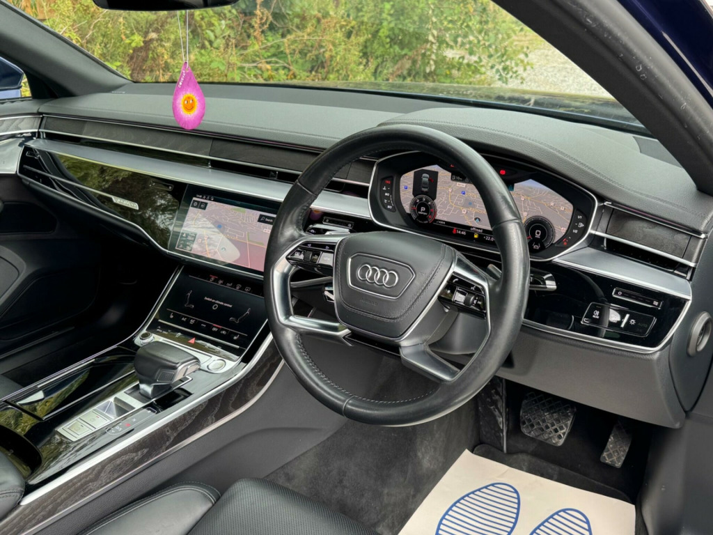 1 OWNER FROM NEWSERVICE HISTORYEURO 6ULEZ COMPLIANT£4,975 WORTH OF EXTRASOptional Equipment when new£4,975inc. VATComfort & Sound pack£2,125Panoramic glass sunroof£1,650Acoustic double glazing£700Privacy glass£500Black Valcona leather (Individual comfort contour)-Total price when new£90,950inc. VATBang and Olufsen 3D Advanced Sound SystemVery rareValuableHD Matrix LED Headlights with Audi Laser Light and OLED Rear LightsRareValuablePanoramic Glass SunroofRareValuableDigital TV ReceptionVery rareOLED Rear LightsVery rareExtended LED Interior Lighting Package - Multi-ColouredVery rareValcona Leather - Sport Seats - BlackEquipment:Navigation SystemNavigation HDDParking Sensor(s)Climate ControlLeather Trim19'' Alloy WheelsPrivacy GlassSunroofThis 2018 Audi A8 TDI V6 S line is a remarkable example, having had only one owner since new. Finished in a sophisticated style, this Euro 6 compliant model boasts a powerful 3.0 litre diesel engine paired with Audi's renowned Four Wheel Drive system for exceptional performance and control. Inside, you'll find a host of premium features designed for comfort and convenience, including 22 way electrically adjustable front seats with a memory function, heated front seats, and a 2 zone automatic air conditioning system. The advanced HD Matrix LED headlights with dynamic front and rear indicators ensure excellent visibility, while the Head Up Display keeps essential information within your line of sight. Furthermore, the A8 offers generous boot space, making it practical for all your needs.The driving experience of this Audi A8 is further enhanced by its impressive acceleration, reaching 0 to 62 miles per hour in just 5.9 seconds, demonstrating its dynamic capabilities. These highlights, such as the advanced lighting system, the comprehensive seat adjustments, and the swift acceleration, set this particular A8 apart from other vehicles in its class, offering a superior blend of luxury, technology, and performance for the discerning driver. ng and olufsen 3d advanced sound system, hd matrix led headlights with audi laser light and oled rear lights, panoramic glass sunroof, digital tv reception, oled rear lights, extended led interior lighting package - multi-coloured, valcona leather - sport seats - black, 19in alloy wheels - 15-spoke design cast aluminium, 2-zone automatic air conditioning, 22-way electrically adjustment seats with memory function, 4-way electric lumbar support for front seats, abs - anti-lock braking system, ami - audi music interface, acoustic double glazing, adaptive air suspension, adaptive cruise assist, advanced key, airbags - driver, airbags - front passenger, anti theft locking wheel bolts and wheel loosening detection, anti-theft alarm with tow-away protection, audi connect infotainment services (36 month subscription from new), audi connect safety and service - e-call, audi drive select, audi parking system plus, audi phone box with wireless charging, audi pre-sense front, audi smartphone interface, audi sound system, audi virtual cockpit - 12.3in high resolution lcd display, automatic air recirculation, brake calipers - black, camera-based traffic sign recognition, chrome exterior pack, cloth headlining in black, dab digital radio, dvd player, door mirrors - electrically adjustable - heated - folding - automatically dimming with memory function and integrated led indicator, electric auxiliary air heater, electric windows - front and rear, extended pedestrian protection, exterior mirror housings in body colour, first aid kit and warning triangle, folding 3-seat rear bench with centre armrest, front centre armrest, front reading lights, front sun visors with illuminated vanity mirrors, front and rear floor mats, front and rear side airbag, glove compartment cooling, hd matrix led headlights and dynamic front and rear indicators, head-up display, headlight washers, headlights - high-beam assist, heat-insulating glass - side and rear windows, isofix child seat mounting for outer rear seats, led interior lighting pack, led rear lights, lane departure warning, leather gear lever, lower inlays in dark matt brushed aluminium, mmi navigation plus including mmi touch, mmi radio plus, operating buttons - black, power operated tailgate, power steering, pre-sense basic, privacy glass, quattro with self-locking centre differential, rear-view camera, seat belt reminder, seats - heated front, space saver spare wheel, sport exterior styling, tool kit and car jack, twin-spoke leather multi-function steering wheel with shift paddles, tyre pressure warning light, upper inlays - fine grain ash - natural grey brown, windscreen with acoustic glazing
