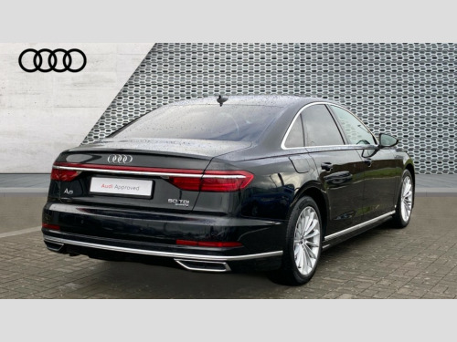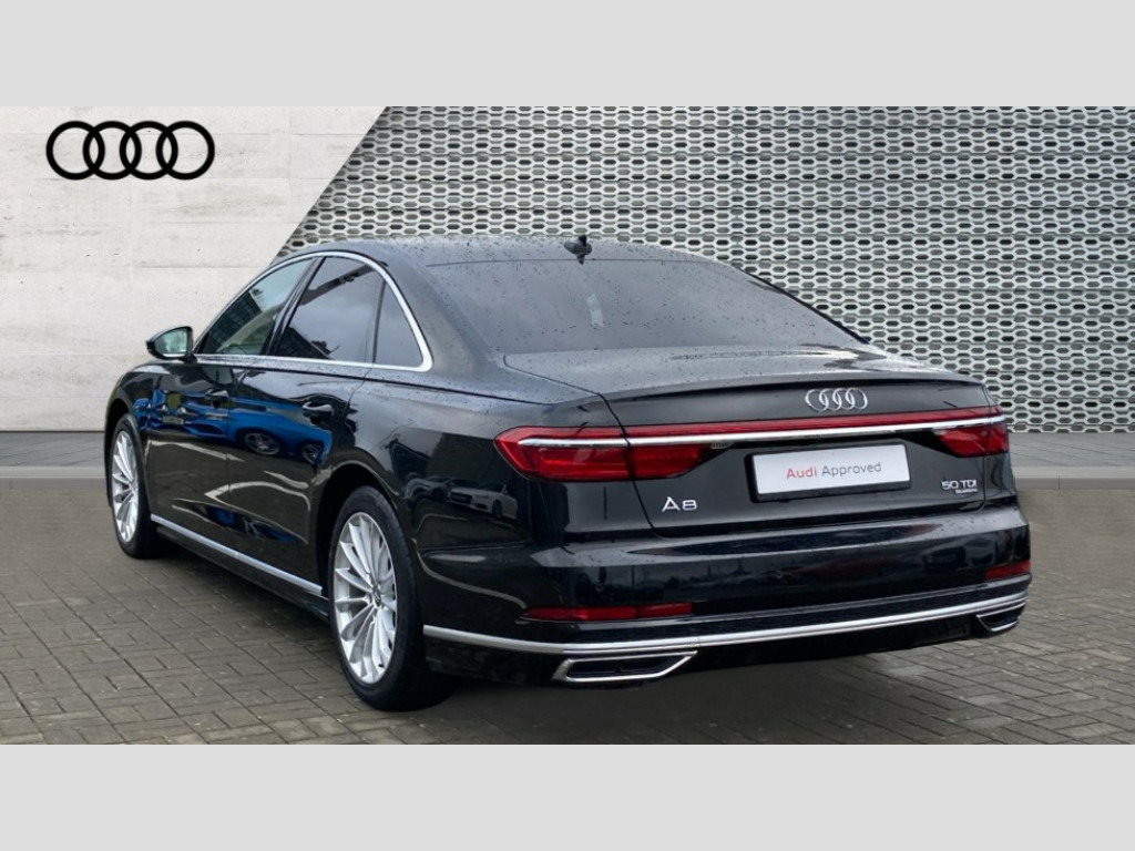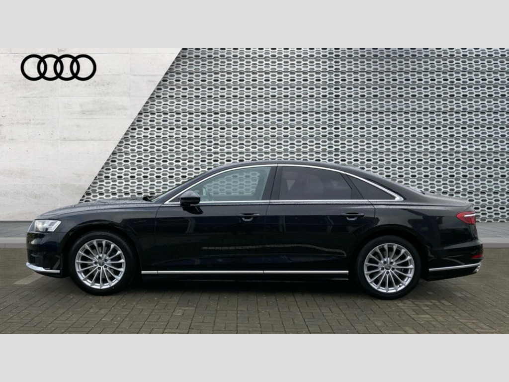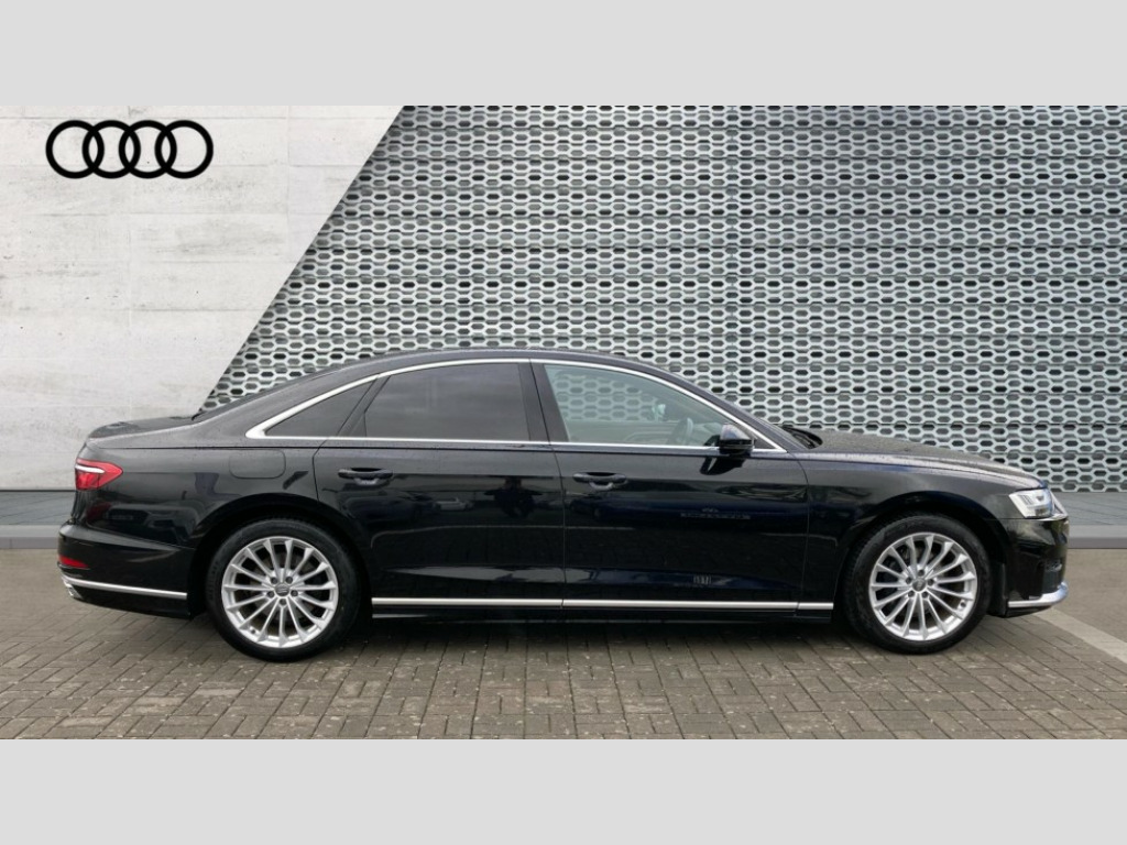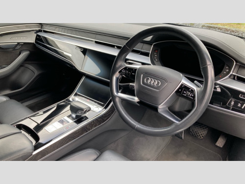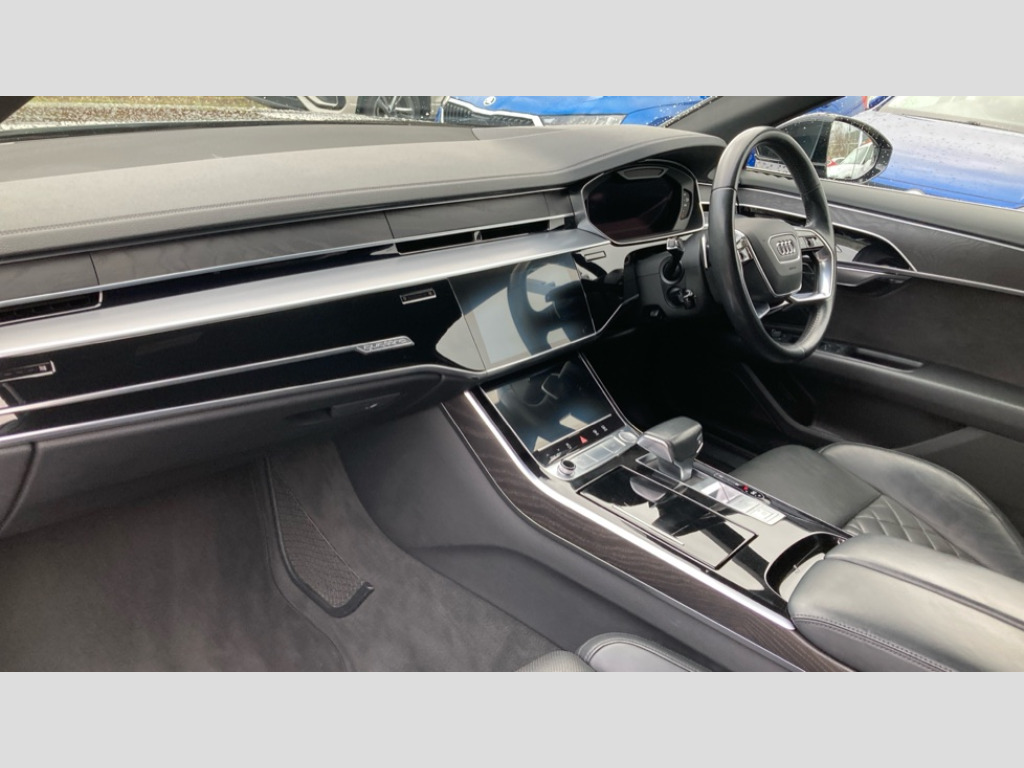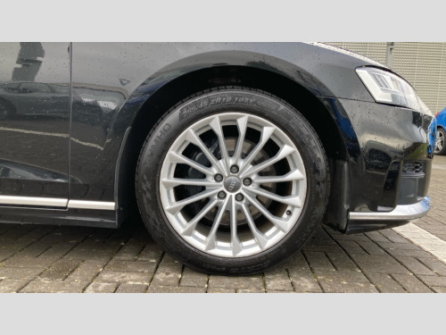 Audi A8 50 TDI Quattro S Line 4dr Tiptronic 'Lights On' Reminder warning buzzer, Adaptive cruise assist with Stop and Go, Audi connect safety and service (e-call), Audi drive select, Audi phone box with wireless charging, Audi virtual cockpit, Audi wireless smartphone interface, Camera based traffic sign recognition, Colour driver's information system display, Electro - mechanical power assisted steering, Head up Display, Lane departure warning including emergency assist, MMI navigation plus with MMI touch, Operating buttons in black, glass with extended aluminium, Parking system plus - front + rear sensors, Power door closure, Power operated tailgate, Rear view camera, Remote fuel filler release, Service interval indicator, 24 litre AdBlue tank, 8 speed transmission with hill hold assist, Adaptive air suspension, Diesel particulate filter, Quattro all wheel drive with self locking centre differential, Audi music interface, Audi sound system, DAB digital radio module, DVD System, MMI radio plus, USB connection, Acoustic double glazing, Audi space frame, Auto dimming rear view mirror, Automatic headlight control system, Body colour bumpers, Body colour door handles, Body colour exterior mirror housings, Body colour side protection with aluminium trim strips, Electric front windows, Electric rear windows with isolation switch, Electrically adjustable heated folding + automatically dimming exterior mirrors with memory function and integrated LED indicators, HD matrix healights with LED rear lights + dynamic rear indicators, Heat insulating darkened glass in side and rear windows, Heated rear window, Heated windscreen washer jets, High beam assist, LED brake lights, LED daytime running lights, Privacy glass, Reverse activated kerb-view adjustment on passenger's door mirror, Side skirts, Sport exterior styling, Sports bumpers, Windscreen with acoustic glazing, 2 zone automatic air conditioning, 230V socket, 3 seater rear seat system, 4 way electric lumbar support for driver and front passenger, Centre console with cupholders, Climate controlled seats, Comfort centre armrest front, Door armrest with storage, Door pockets with bottle holder, Driver and front passenger side sunvisors with illuminated vanity mirrors, Dust/pollen filters, Electric adj front seatbelt height + memory, Electric auxiliary air heater, Electric front seats with memory function, Front centre armrest, Front/rear floor mats, Glove compartment cooling, Heated front seats, Height/reach electric steering column with easy exit function, Isofix child seat mounting points on outer rear seats, Jack and tool kit, Leather gearknob, Passenger footwell storage net, Reading lights, Rear centre armrest, Rear headrests, Roof mounted sunglasses holder, Twin spoke leather multifunction steering wheel with gearshift paddles, Valcona leather upholstery with front sports seats in diamond quilted with S embossed logo, LED ambient interior lighting pack - A8, 3 point seatbelts on all rear seats, ABS/EBD, Active front headrest system, ASR traction control, Audi pre sense basic, Audi pre sense front, EDL traction control, Electromechanical parking brake, ESP, Extended pedestrian protection measures, Front and rear side airbags with head airbag system, Front passenger airbag deactivation, Rear child proof door locks, Seatbelt reminder + electric contact in buckle + advanced safety equipment, Tyre pressure warning light, Warning triangle and first aid kit, Advanced key, Anti theft alarm tow away protection, Anti-theft wheel bolts and wheel loosening detection, Locking wheel bolts, Remote central locking, Dark matt brushed aluminium lower inlays, 19" 15 spoke design cast alloy wheels