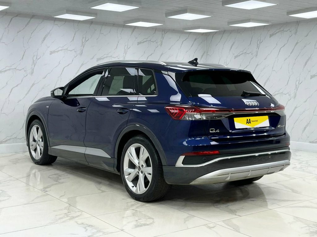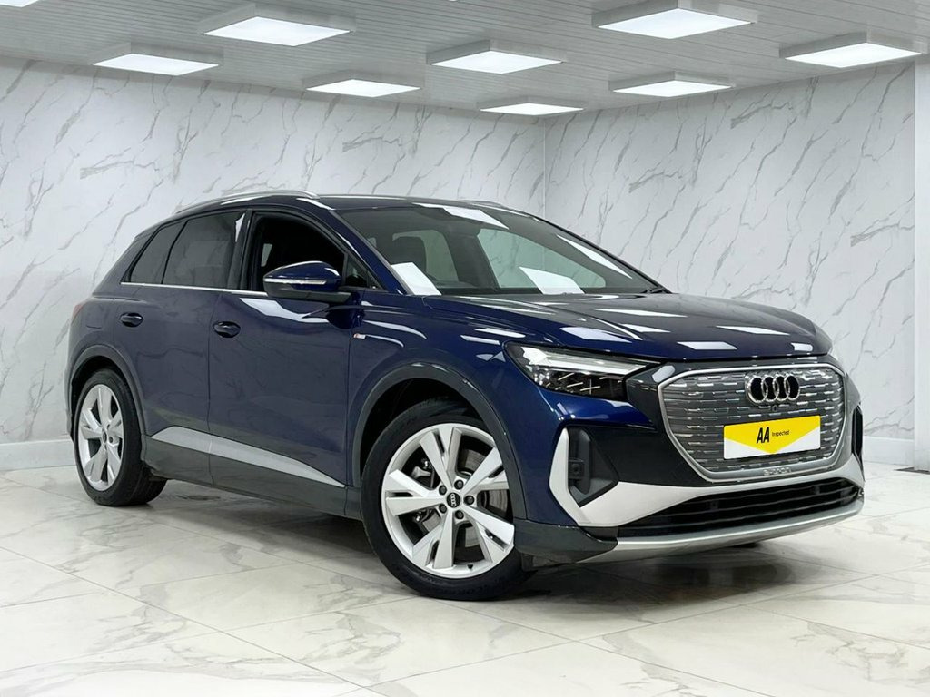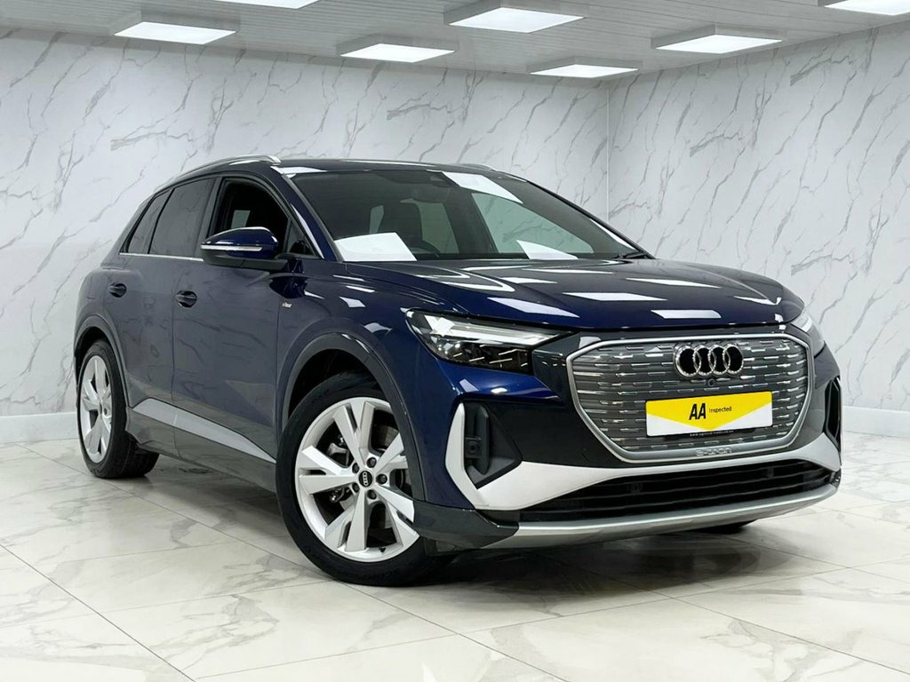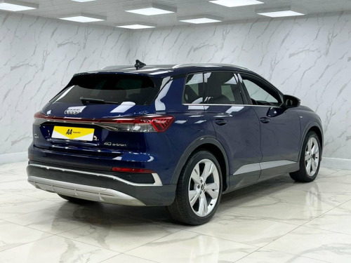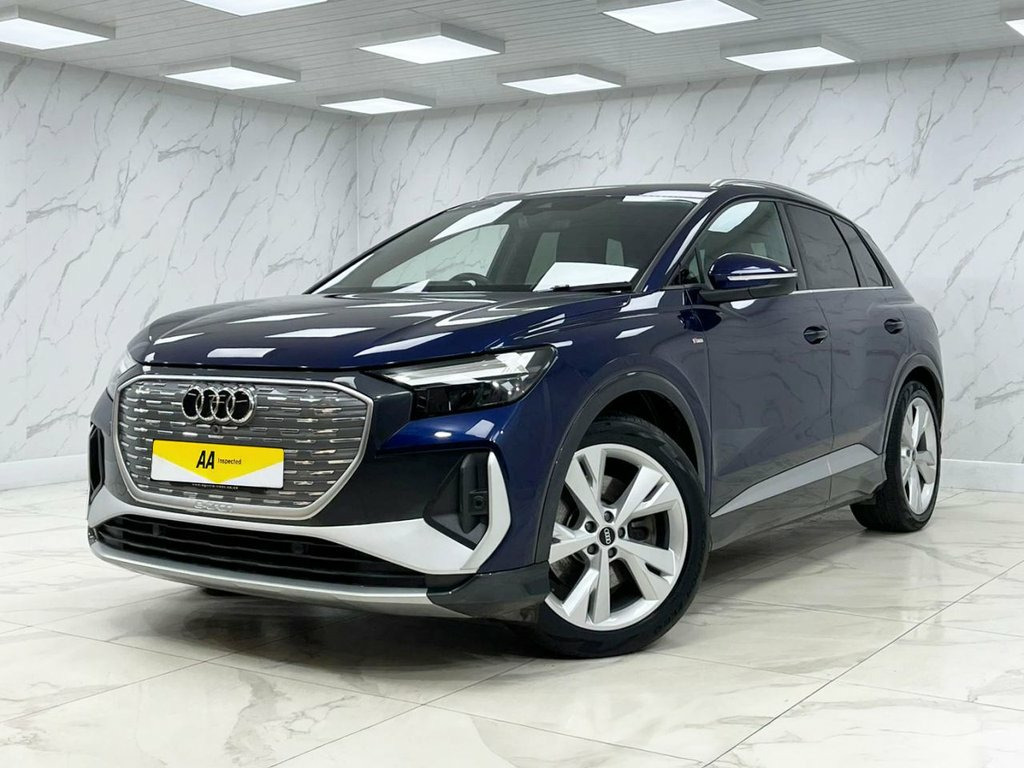 This 2022 Audi Q4 e-tron S line is a superb example, having had only one owner since new. This electric SUV combines sophisticated styling with advanced technology, featuring 20in Alloy Wheels in a Graphite Grey gloss turned finish. Inside, you'll find comfort and convenience with 3-Zone Electronic Climate Control and heated front seats. The Audi Smartphone Interface ensures seamless connectivity, offering both Android Auto and Apple CarPlay, while LED headlights with daytime running lights provide excellent visibility. With a substantial 82 kWh battery, this Q4 e-tron offers a maximum range of 312 miles when new, making it a practical choice for both daily commutes and longer journeys. Charging is efficient, with a full charge at home taking approximately 11 hours and 30 minutes on a 7kW charger, and a rapid charge to 80% possible in just 30 minutes at a public charging station. This vehicle will be supplied with a 12-month MOT, offering peace of mind for its next owner. 20in Alloy Wheels - 5-Y-Spoke Graphite G, Navarra Blue, Pulse Cloth-Leather - Sport Seats with S, 11 kW Onboard Charger, 135kW DC Charging Capability, 2 USB-C Ports with Charge and Data Funct, 20in Alloy Wheels - 5-Y-Spoke, 3-Zone Electronic Climate Control, 4-Way Electric Lumbar Support for Front , ABS - Anti-Lock Braking System, AC and DC Charging access Point on the R, Active Vehicle Alerting System - AVAS, Aluminium Look Interior Elements, Aluminium Roof Rails, Ambient Lighting Pack, Anti Theft Locking Wheel Bolts, Anti-Theft Alarm, Audi Connect Navigation and Infotainment, Audi Connect Safety and Service - e-call, Audi Drive Select, Audi Pre-Sense Front with Pedestrian and, Audi Smartph