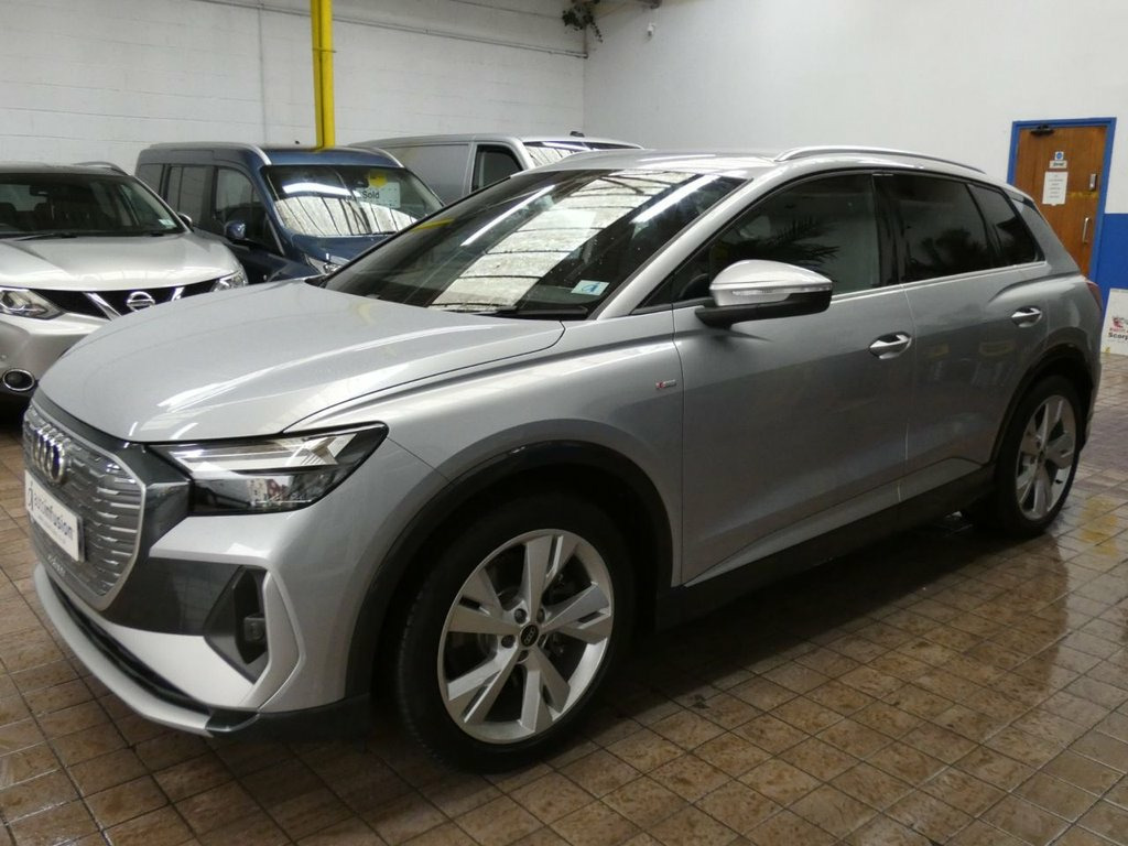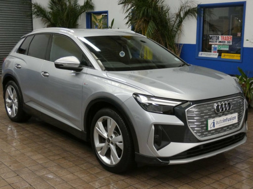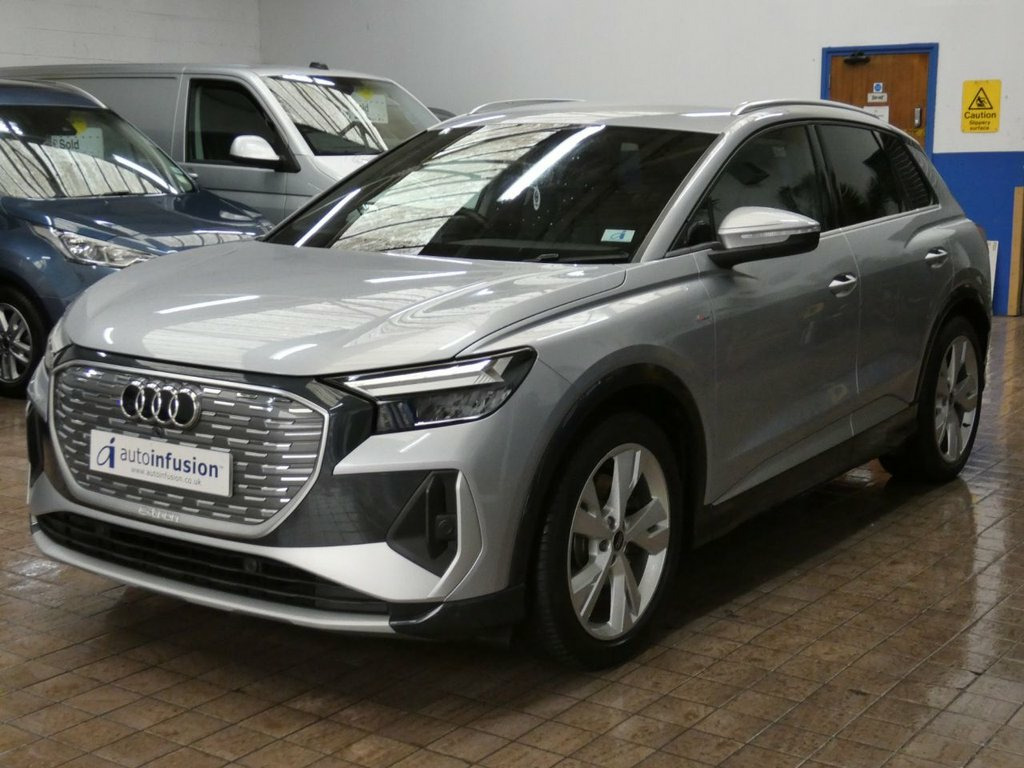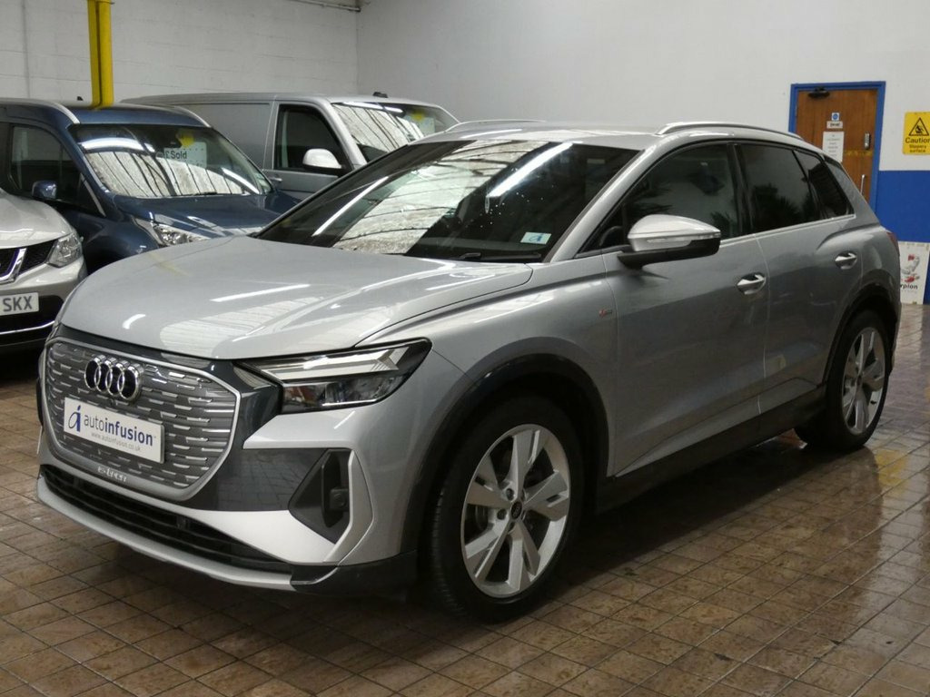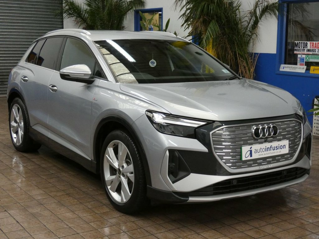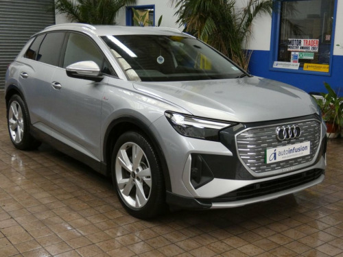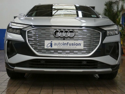 WE ARE DELIGHTED TO BE ABLE TO OFFER THIS AUDI Q4 -TRON 45 S LINE, IT IS IN GREAT CONDITION AS YOU WOULD EXPECT FROM A CHERISHED LOW MILEAGE EXAMPLE THAT HAS COVERED JUST 10, 425 MILES FROM NEW, OUR AUDI HAS HAD JUST 1 OWNER FROM NEW, FIRST MOT TILL MARCH 2027, AUDI WARRANTY TILL MARCH 2027, AS A EURO 6 VEHICLE IT IS ULEZ AND CAZ COMPLIANT MEANING THERE WILL BE NO PENALTIES FOR DRIVING INTO MAJOR CITIES, THIS AUDI IS WELL EQUIPPED, IT COMES WITH SAT NAV, BLUETOOTH, DAB RADIO, LEATHER INTERIOR, HEATED SEATS, REAR VIEW CAMERA, CRUISE CONTROL, PARKING SENSORS, IT WILL BE SUPPLIED WITH 2 KEYS, ALL OF OUR SOURCED VEHICLES COME COSMETICALLY PREPARED TO A VERY HIGH STANDARD, WE ALSO OFFER A UK WIDE DELIVERY SERVICE ALONG WITH TAILOR MADE BESPOKE FINANCE PACKAGES, WE PRIDE OURSELVES ON OUR 5 STAR REVIEWS AND ALWAYS AIM TO PROVIDE OUR CUSTOMERS WITH THE BEST POSSIBLE EXPERIENCE, PLEASE GIVE US A CALL FOR MORE INFORMATION ABOUT ANY OF OUR CARS, OUR FRIENDLY STAFF WILL BE MORE THAN HAPPY TO ASSIST YOU This electric vehicle boasts an impressive battery total capacity of 82 kWh, offering a maximum range of 342 miles when new. For your convenience, a full charge at home using a 7kW charger takes approximately 13 hours, while rapid public charging can replenish the battery from empty to 80% in just 28 minutes. The performance of this Audi Q4 e-tron S line is further enhanced by its rapid acceleration, reaching 0-60mph in a swift 6.7 seconds, demonstrating its capability. Autoinfusion Ltd 11 kW Onboard Charger, 135kW DC Charging Capability, 2 USB-C Ports with Charge and Data Funct, 20in Alloy Wheels - 8.0J Front - 9.0J Re, 3-Zone Electronic Climate Control, 4-Way Electric Lumbar Support for Front , ABS - Anti-Lock Braking System, AC and DC Charging access Point on Drive, Active Vehicle Alerting System - AVAS, Adaptive Cruise Control with Speed Limit, Advanced Driver Attention and Drowsiness, Aluminium Look Interior Elements, Aluminium Roof Rails, Ambient Lighting Package Plus, Anti Theft Locking Wheel Bolts, Anti-Theft Alarm, Audi Connect Navigation and Infotainment, Audi Connect Safety and Service - e-call, Audi Drive Select, Audi Pre-Sense Front with Pedestrian and, Audi Sm