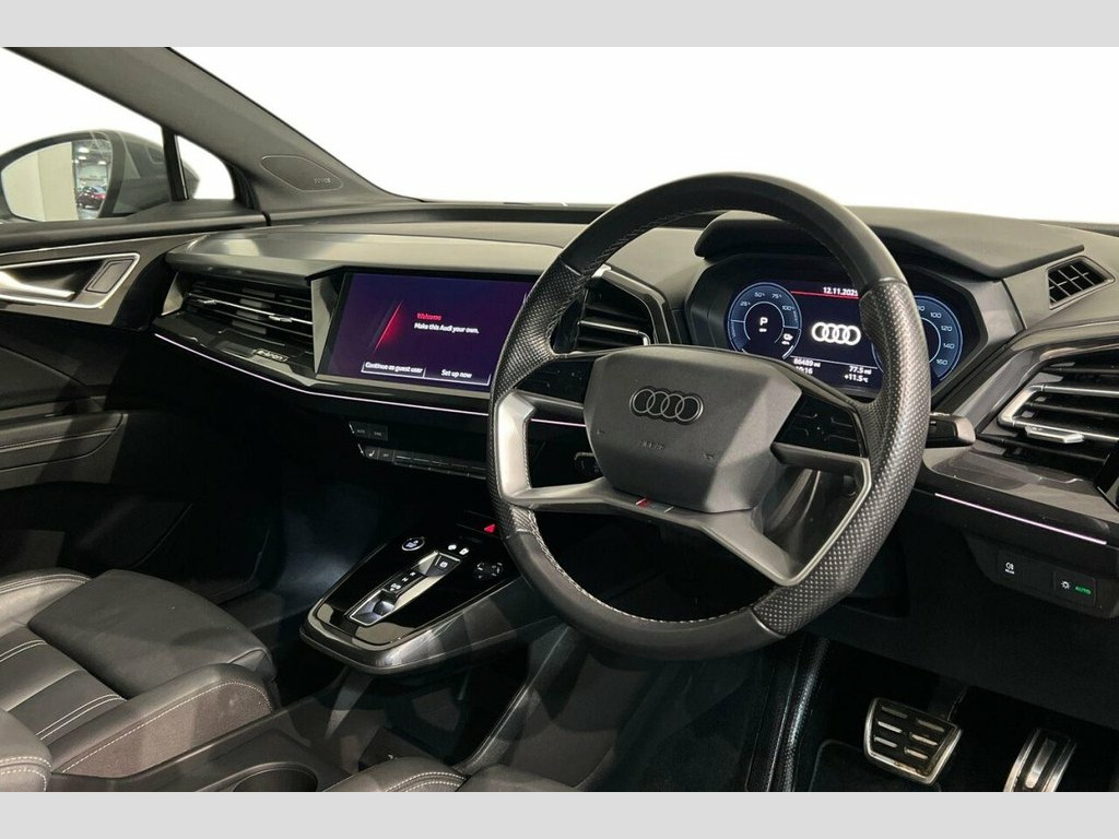 This 2022 Audi Q4 e-tron S line boasts a single owner from new, offering a pristine example of electric motoring. As a Four Wheel Drive model, it combines the advanced technology of an electric powertrain with the assured grip and stability expected from Audi. With a substantial 82 kWh battery, this Q4 e-tron is capable of achieving an impressive 312 miles on a full charge, making it ideal for both daily commutes and longer journeys. Charging is convenient, taking approximately 11 hours and 30 minutes at home using a 7kW charger, while rapid public charging can replenish the battery from empty to 80% in as little as 38 minutes. The vehicle is also in excellent condition, with its MOT valid until September 2026. The S line trim enhances the already sophisticated Q4 e-tron with a range of desirable features. You'll appreciate the clear visibility provided by the LED headlights with LED daytime running lights, and staying connected is effortless with the integrated Bluetooth interface. For comfort, the vehicle includes comfort auxiliary air conditioning, ensuring a pleasant cabin temperature in all conditions, and heated front seats for those colder mornings. Parking is made simpler with rear parking sensors. Performance is also a strong point, with an acceleration of 0-60mph in just 6.2 seconds, demonstrating its dynamic capability. Furthermore, the Q4 e-tron offers generous boot space, providing ample room for luggage or shopping, setting it apart from many other electri 11 kW Onboard Charger, 135kW DC Charging Capability, 2 USB-C Ports with Charge and Data Funct, 20in Alloy Wheels - 5-Y-Spoke, 3-Zone Electronic Climate Control, 4-Way Electric Lumbar Support for Front , ABS - Anti-Lock Braking System, AC and DC Charging access Point on the R, Active Vehicle Alerting System - AVAS, Aluminium Look Interior Elements, Ambient Lighting Pack, Anti Theft Locking Wheel Bolts, Anti-Theft Alarm, Audi Connect Navigation and Infotainment, Audi Connect Safety and Service - e-call, Audi Drive Select, Audi Pre-Sense Front with Pedestrian and, Audi Smartphone Interface, Audi Sound System, Audi Virtual Cockpit - 10.25in Display, Auto Dimming and Frameless Rear View Mir, Blue