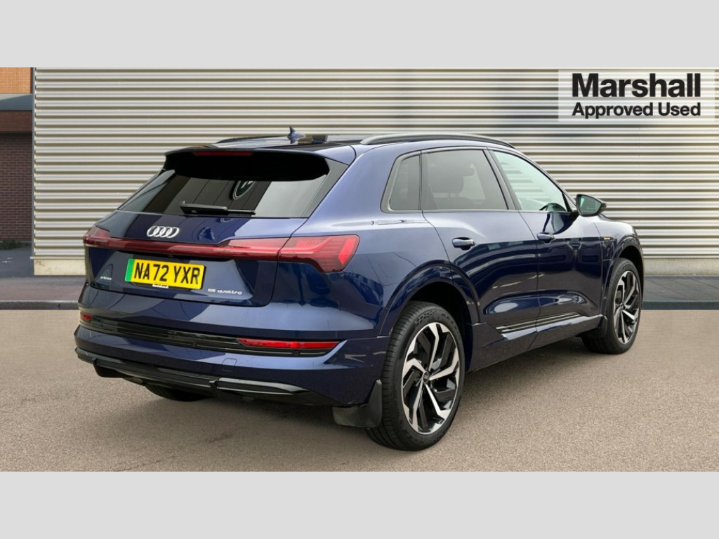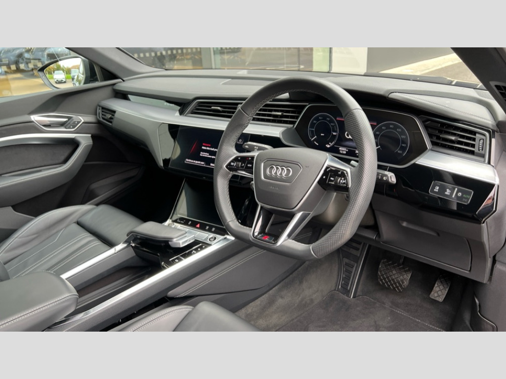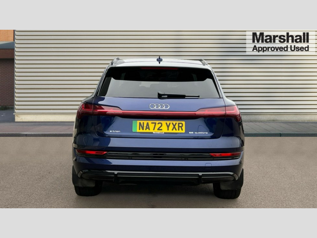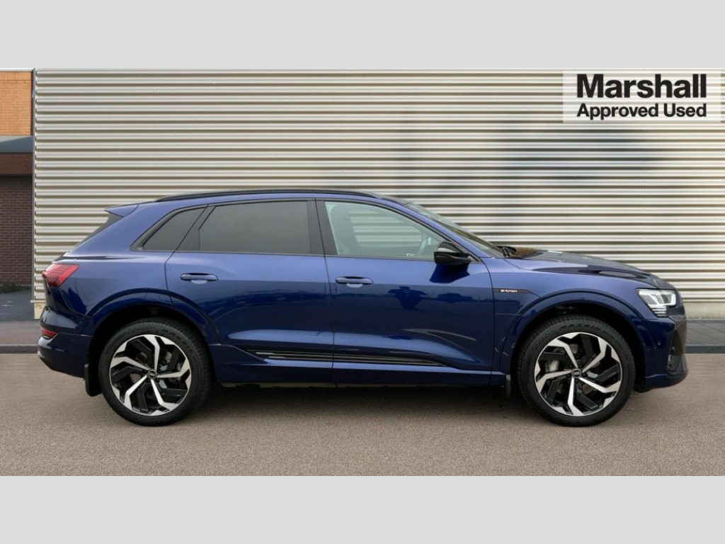 Audi E-Tron 300kW 55 Quattro 95kWh Black Edition 5dr Auto Audi connect safety and service (e-call), Audi drive select, Audi Smartphone Interface with wireless functionality, Audi virtual cockpit, Bluetooth interface, MMI navigation plus with MMI touch + Twin touch screens with haptic feedback, Parking system plus with 360 degree sensors and function on demand preparation, Power operated tailgate, Progressive steering, Rear view camera, 11KW onboard charger, AC and DC charging access point on drivers side and second AC charging access point on passenger side, Adaptive sport air suspension, Compact e-tron charging system, Household plug type G (GB), Industry plug CEE 32 A/230 V/6 h/long + straight, Mode 3 AC charging cable 22 kW, Quattro all wheel drive, 2 USB-C ports with charging functionality in the rear, Audi sound system with 6 channel amplifier, 180 watt amplifying capacity and 10 loudspeakers including subwoofer, DAB Digital radio, 3rd brake light, Audi matrix LED headlights and dynamic front and rear indicators with coming and leaving home animations, Black roof rails, Body colour bumpers, Daytime running lights, Frameless auto dimming interior rear view mirror, Front and rear illuminated door sill trims with aluminium inlays and S logo in front, LED rear lights, Rear side wing doors, Rear wiper, Side and rear window privacy glass, Windscreen with acoustic glazing, 3 bench rear seats in 2nd row, 3 rear head restraints, 4-way lumbar support for front seats, 40:20:40 split folding rear bench seat, Black cloth headlining, Comfort front centre armrest, Electrically adjustable front seats - driver seat with memory, Front head restraints, Front passenger seat, Front/rear floor mats, Heated front seats, ISOFIX child seat mounting for front passenger seat with airbag deactivation, Isofix child seat mounting points on outer rear seats, Luggage compartment cover, Luggage compartment floor, Manually adjustable steering column, Operating buttons in black + glass look with haptic feedback, Removable net partition, Sunvisors with illuminated vanity mirrors, Vehicle inlet Combo 2, Black styling pack - E-tron, Extended twin leather pack - E-tron, Gloss styling pack - E-tron, LED interior lighting pack - E-tron, 3x3 point rear seatbelts, Active vehicle alerting system (AVAS), Audi pre sense front and basic, Child locks on rear doors, Seatbelt reminder + electric contact in buckle + advanced safety equipment, Side, front and head airbag system, Tyre pressure warning light, Warning triangle and first aid kit, Anti theft alarm, Anti-theft wheel bolts and wheel loosening detection, Keyless Go, Tool kit