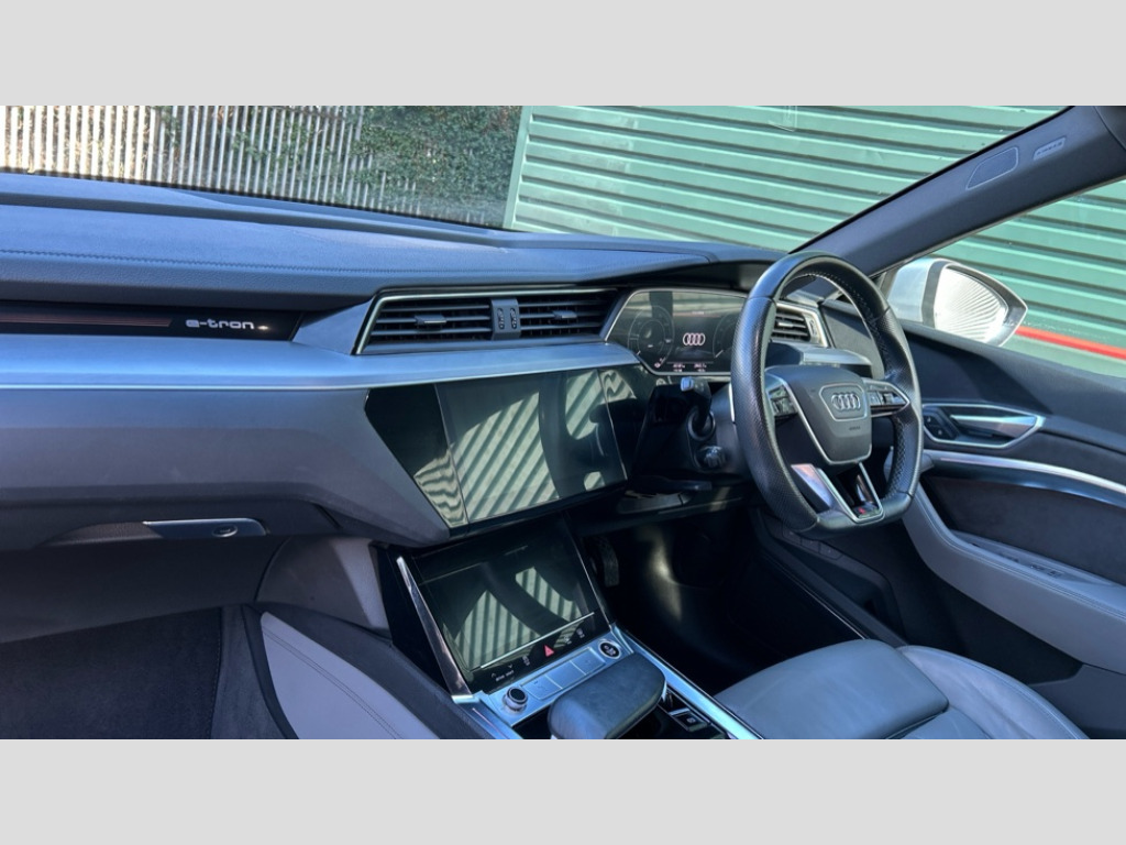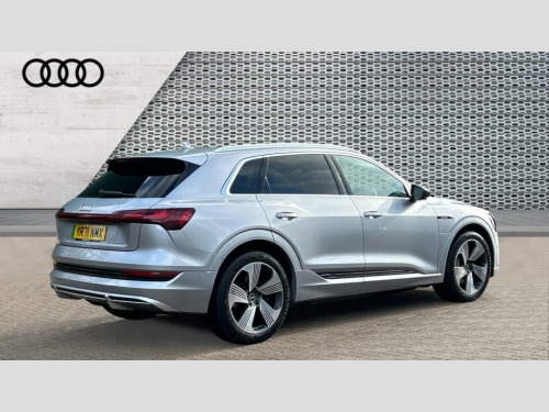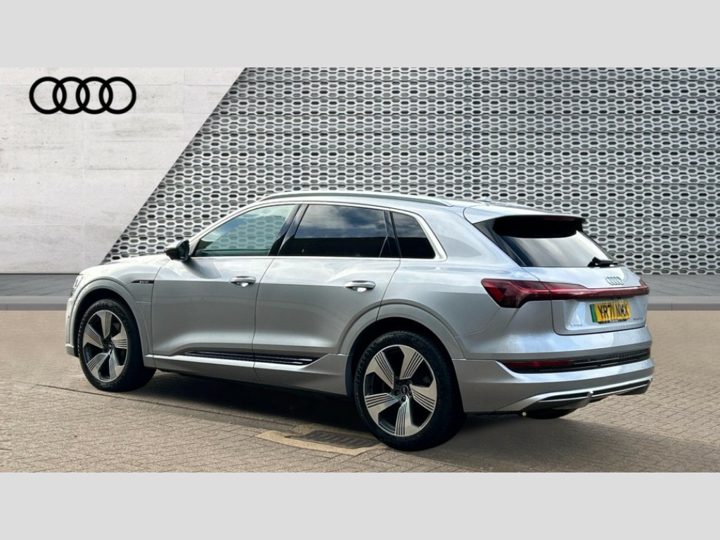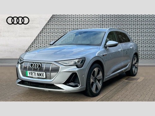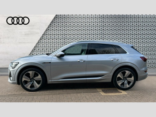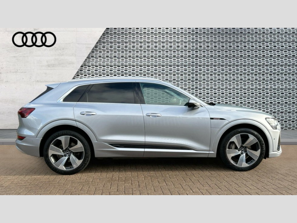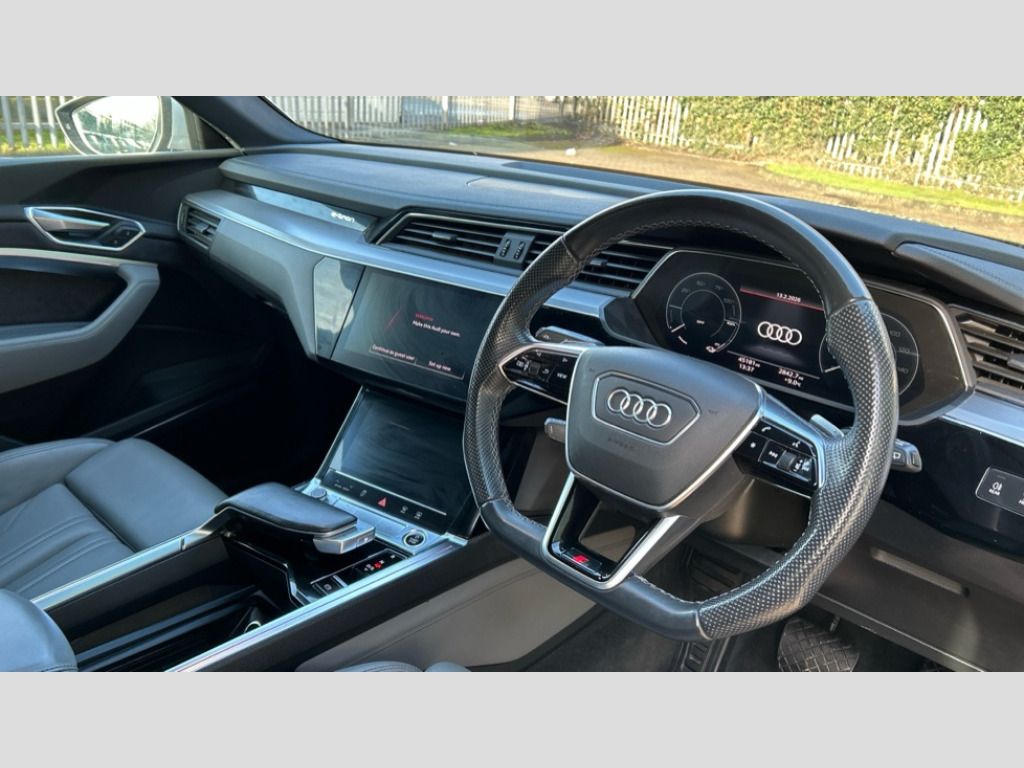 Audi E-Tron 300kW 55 Quattro 95kWh S Line 5dr Auto Audi connect safety and service (e-call), Audi drive select, Audi Smartphone Interface with wireless functionality, Audi virtual cockpit, Bluetooth interface, MMI navigation plus with MMI touch + Twin touch screens with haptic feedback, Parking system plus with 360 degree sensors and function on demand preparation, Power operated tailgate, Progressive steering, Rear view camera, 11KW onboard charger, AC and DC charging access point on drivers side and second AC charging access point on passenger side, Adaptive sport air suspension, Compact e-tron charging system, Household plug type G (GB), Industry plug CEE 32 A/230 V/6 h/long + straight, Mode 3 AC charging cable 22 kW, Quattro all wheel drive, 2 USB-C ports with charging functionality in the rear, Audi sound system with 6 channel amplifier, 180 watt amplifying capacity and 10 loudspeakers including subwoofer, DAB Digital radio, 3rd brake light, Audi matrix LED headlights and dynamic front and rear indicators with coming and leaving home animations, Body colour bumpers, Body coloured door mirrors, Daytime running lights, Frameless auto dimming interior rear view mirror, Front and rear illuminated door sill trims with aluminium inlays and S logo in front, LED rear lights, Rear side wing doors, Rear wiper, S Line badges on the front grille, S Line front and rear bumpers, S Line rear diffuser, Side and rear window privacy glass, Windscreen with acoustic glazing, 3 rear head restraints, 4-way lumbar support for front seats, 40:20:40 split folding rear bench seat, Black cloth headlining, Comfort front centre armrest, Electrically adjustable front seats - driver seat with memory, Front head restraints, Front passenger seat, Front/rear floor mats, Heated front seats, ISOFIX child seat mounting for front passenger seat with airbag deactivation, Isofix child seat mounting points on outer rear seats, Luggage compartment cover, Luggage compartment floor, Manually adjustable steering column, Operating buttons in black + glass look with haptic feedback, Removable net partition, Sunvisors with illuminated vanity mirrors, Vehicle inlet Combo 2, Gloss styling pack - E-tron, LED interior lighting pack - E-tron, Twin leather pack - E-tron, 3x3 point rear seatbelts, Active vehicle alerting system (AVAS), Audi pre sense front and basic, Child locks on rear doors, Seatbelt reminder + electric contact in buckle + advanced safety equipment, Side, front and head airbag system, Tyre pressure warning light, Warning triangle and first aid kit, Anti theft alarm, Anti-theft wheel bolts and wheel loosening detection, Keyless Go, Tool kit