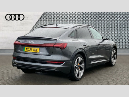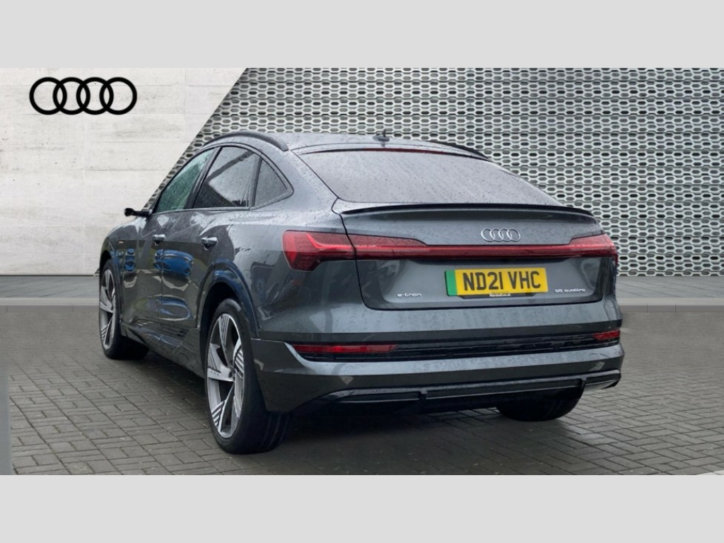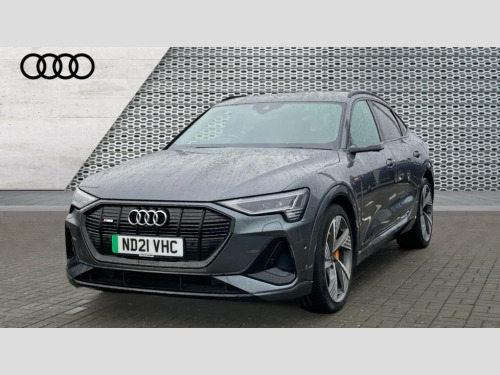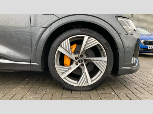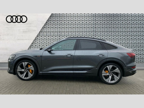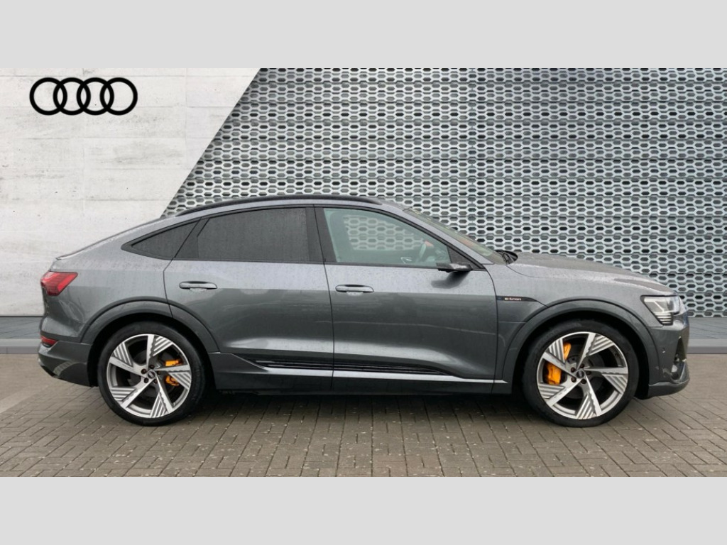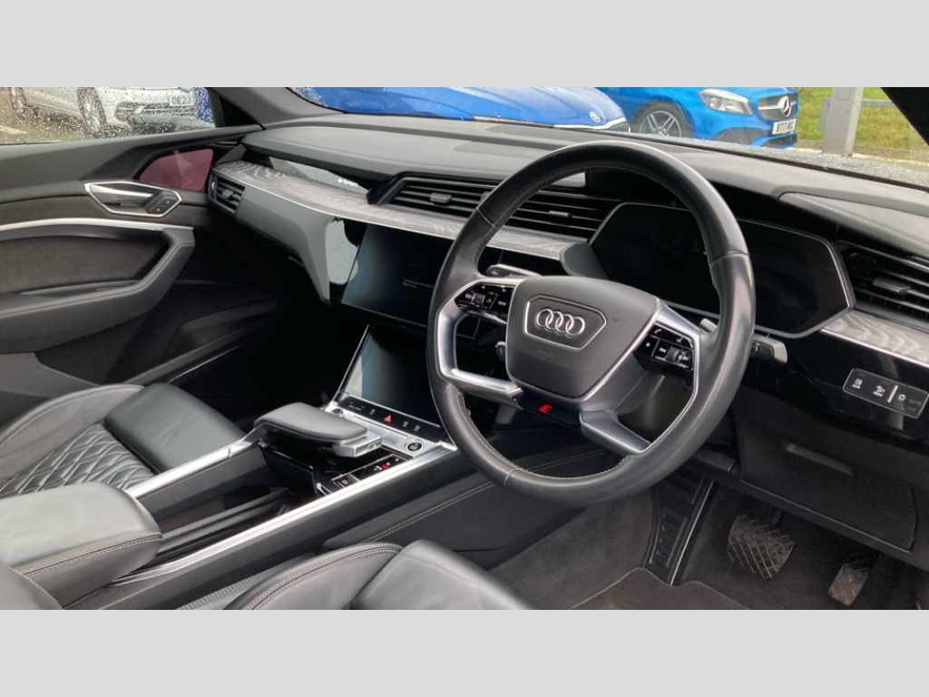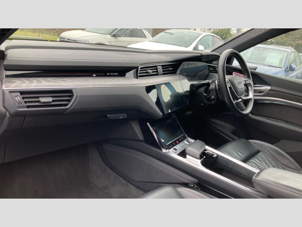 Audi E-Tron 300kW 55 Quattro 95kWh Vorsprung 5dr Auto 360 degree view camera, Adaptive cruise assist, Audi connect safety and service (e-call), Audi drive select, Audi phone box with wireless charging, Audi side assist including audi pre sense rear, rear cross traffic alert and exit warning, Audi Smartphone Interface with wireless functionality, Audi virtual cockpit plus, Camera based traffic sign recognition, Collision avoidance assist, Head up Display, Lane departure warning with emergency assist, MMI navigation plus with MMI touch + Twin touch screens with haptic feedback, Parking system plus with 360 degree sensors and function on demand preparation, Power door closure, Power operated tailgate, Predictive efficiency assistant, Progressive steering, Turn Assist, 11KW onboard charger, AC and DC charging access point on drivers side and second AC charging access point on passenger side, Adaptive sport air suspension, Compact e-tron charging system, Household plug type G (GB), Industry plug CEE 32 A/230 V/6 h/long + straight, Mode 3 AC charging cable 22 kW, Quattro all wheel drive, Bang & Olufsen premium sound system, DAB Digital radio, Front and rear audi music interface - 2USB-C ports with charge and rear data function in addition to 2 front ports to play music from portable storage, Audi beam with e-tron logo, Black roof rails, Body colour bumpers, Digital Matrix lights with dynamic front & rear indicators and coming/leaving home customisable animations, Fixed panoramic glass roof, Frameless auto dimming interior rear view mirror, Front and rear illuminated door sill trims with aluminium inlays and S logo in front, LED rear lights, Rear boot lip spoiler, Side and rear window privacy glass, 3 rear head restraints, 4 zone deluxe automatic climate control, 4-way lumbar support for front seats, Black cloth headlining, Comfort front centre armrest, Comfort remote pre conditioning, Electric steering wheel adjustment, Electrically adjustable front seats - driver seat with memory, Front head restraints, Front/rear floor mats, Heated 4-spoke leather multi-function steering wheel with paddles for recuperation, Heated front and rear seats, ISOFIX child seat mounting for front passenger seat with airbag deactivation, Isofix child seat mounting points on outer rear seats, Luggage compartment cover, Operating buttons in black + glass look with haptic feedback, Sunvisors with illuminated vanity mirrors, Valcona leather upholstery with diamond pattern contrast stitching front S sports seats S embossed logo, Vehicle inlet Combo 2, Black styling pack - E-tron Sportback, City assist pack - E-tron, Comfort and Sound pack - E-tron, Extended twin leather pack - E-tron, Multi-coloured extended LED interior lighting pack - E-tron, Tour pack - E-tron, 3x3 point rear seatbelts, Active vehicle alerting system (AVAS), Audi pre sense front and basic, Orange painted E-tron brake calipers, Rear side airbags with illuminated seat buckles, Side, front and head airbag system, Warning triangle and first aid kit, Advanced key, Anti theft alarm, Anti-theft wheel bolts and wheel loosening detection, Keyless Go, Black dashboard, 22" 5 spoke structured matt titanium finish diamond cut audi sport alloy wheels, Tool kit