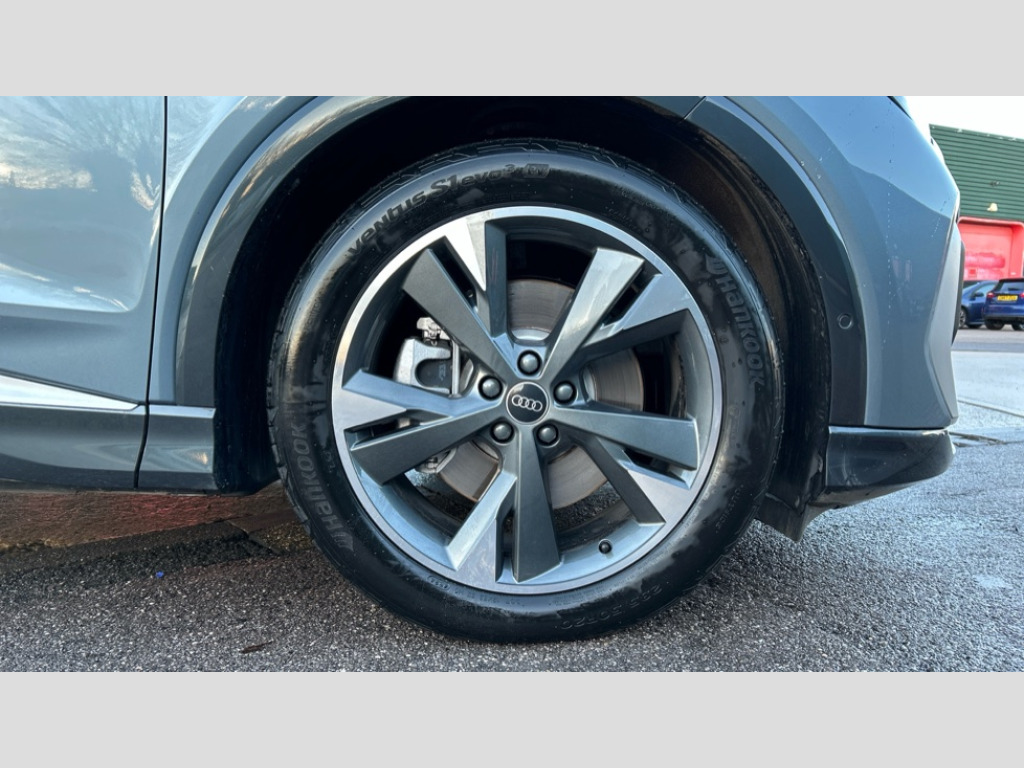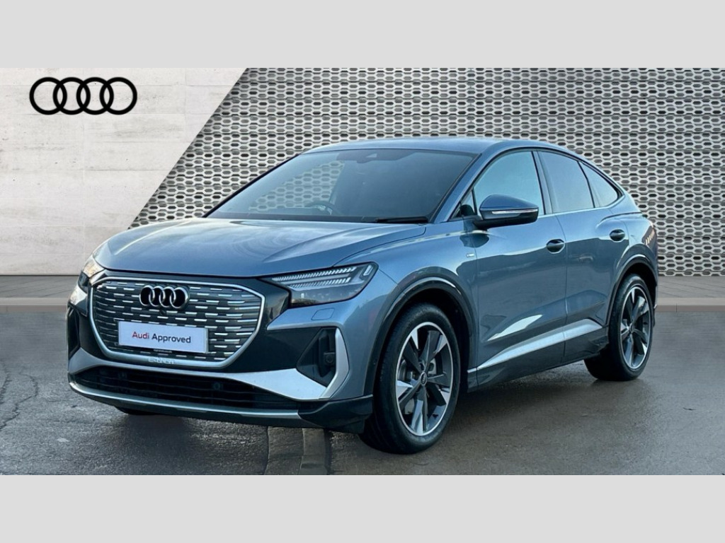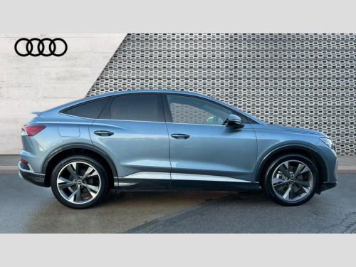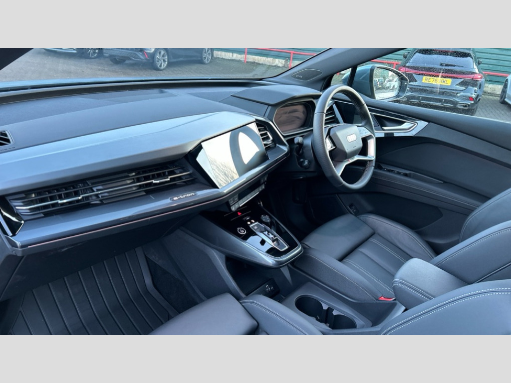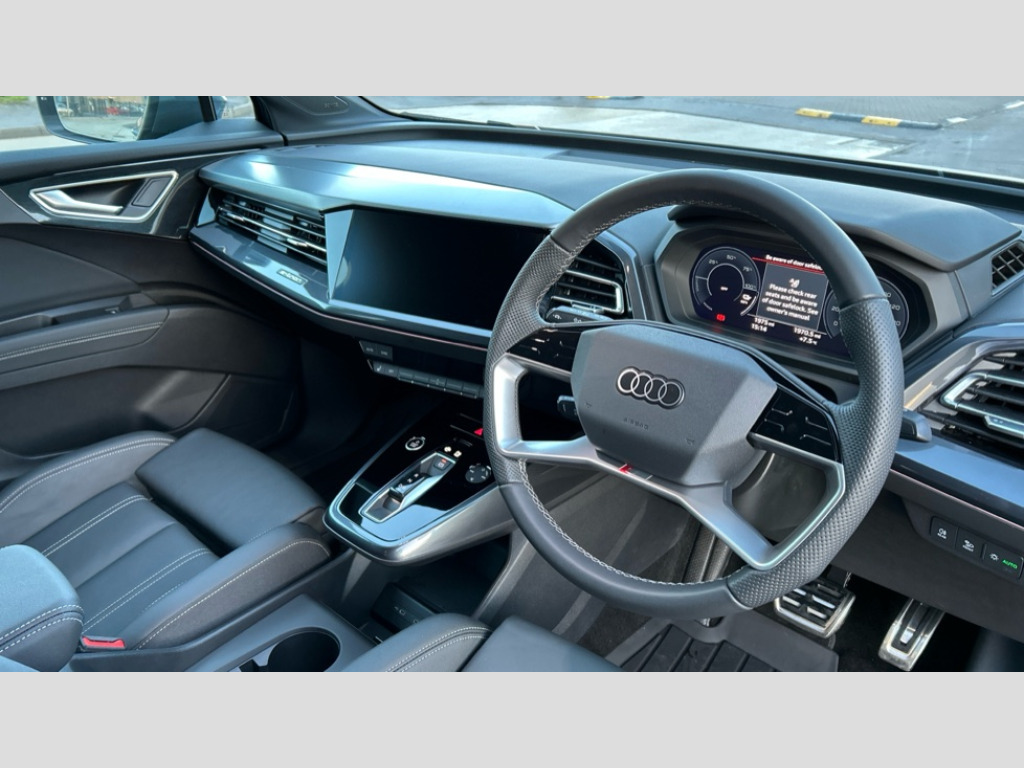 Audi Q4 210kW 45 82kWh S Line 5dr Auto [Leather] Adaptive cruise control with speed limiter, Advanced driver attention and drowsiness monitor, Audi application store, Audi connect safety and service (e-call), Audi drive select, Audi side assist with exit warning and rear cross traffic assist, Audi smartphone interface, Audi Virtual Cockpit - 10.25" display, Bluetooth interface, Camera based traffic sign recognition, Lane departure warning including emergency assist, MMI Navigation Plus with high resolution 11.6 inch touchscreen colour display, Power operated tailgate with sensor controlled release, Progressive steering, Rear view camera, Swerve assist and turn assist, 11KW onboard charger, 175kW DC charging capability, AC and DC charging access point positioned on driver's side rear, Control unit with household plug and charging cable, Mode 2, Type 2 / G (10A), Mode 3 type 2 AC charging cable 22kW, Sport suspension, 2 USB-C ports with charge and data functions, Audi sound system with 8 loudspeakers incl. centre speaker, subwoofer and 6-channel amplifier with total output of 180 watts, DAB Digital radio, Body coloured door mirrors, Contrast bumpers in Manhattan grey, Electrically adjustable/heated/folding/auto dimming door mirrors with integrated LED indications + kerb view function for passenger side, Frameless auto dimming interior rear view mirror, Heat insulating glass windscreen, Heated rear window, LED 3rd brake light, LED daytime running lights, LED Headlights, LED rear lights, Privacy glass - dark-tinted rear window, rear door windows and rear side windows, Projection light in the exterior mirrors, e-tron logo projected from the underside of the exterior mirror onto the ground, Rear side wing doors, Rear wiper, S Line badges on the front wings, S line exterior styling, Single frame grille with a structured, closed surface within an octagonal shape, 3 seat bench in 2nd row, 3 zone automatic air conditioning, 4 way electric lumbar support for driver and front passenger, 40/20/40 split folding rear seat bench, Accent surfaces in gloss black - centre console control panel, switch panel and trim on front doors in gloss black, Black carpets, Black cloth headlining, Comfort auxiliary air conditioning, Door armrests in leatherette, Front centre armrest, Front door sill trims with aluminium inlay, illuminated with S logo, Front sport seats with integrated head restraints, Front/rear floor mats, Heated front seats, Pedals in stainless steel, Rear centre armrest with cupholders, Rear head restraints, Single front passenger seat, Ambient lighting plus pack - Q4 E-tron, Gloss styling pack - Q4 E-tron, Non smoking pack - Q4 E-tron, 3x3 point rear seatbelts, Acoustic vehicle alerting system, Audi pre sense basic and rear, Convenience key with safelock, Driver and front passenger airbag with passenger airbag deactivation, Electric child locks, First aid kit with warning triangle and vests, Front side airbags with head airbag system and front interaction airbag, i - Size child seat mounting on the front passenger side and i - Size and top tether on the outer rear seats, Pre-sense front with pedestrian and cyclist detection, Rear seat occupant reminder for child presence detection, Seat belt monitoring, Tyre pressure loss indicator, Anti theft alarm, Anti-theft wheel bolts, Keyless Go, Aluminium look interior elements, Black dashboard, Vehicle tool kit with tyre repair kit
