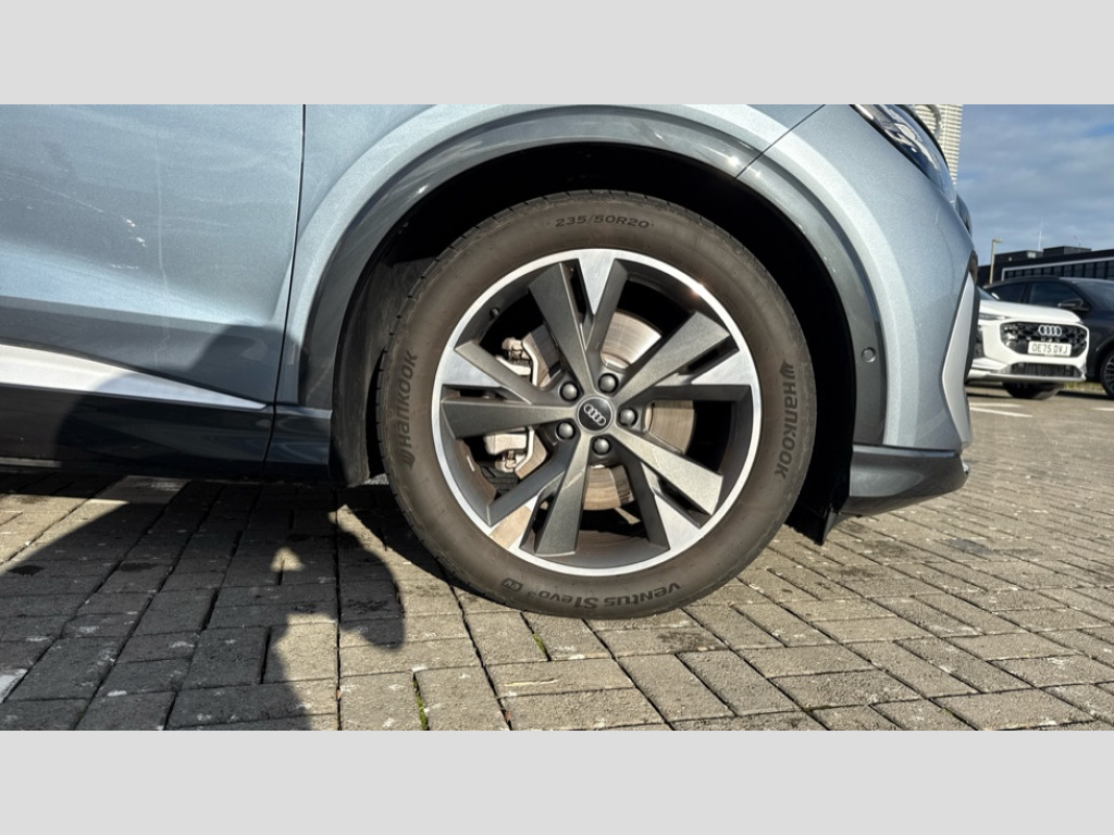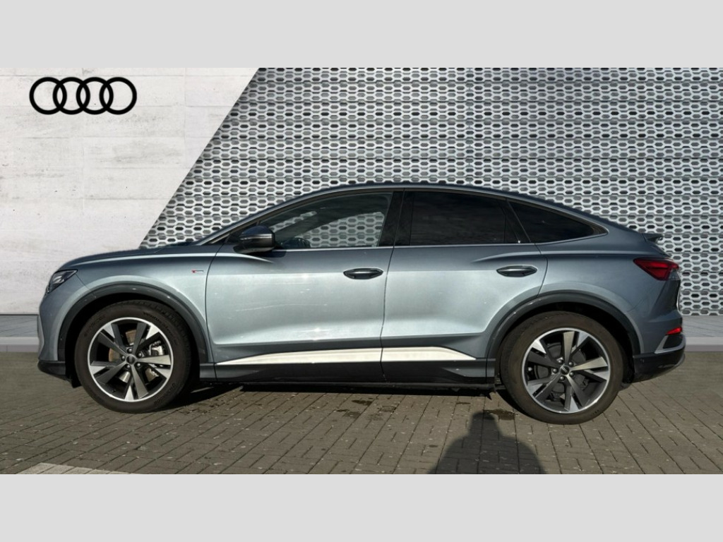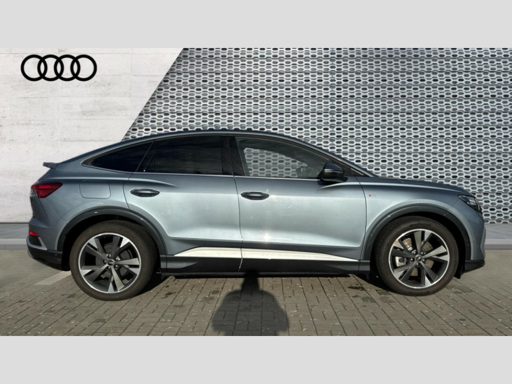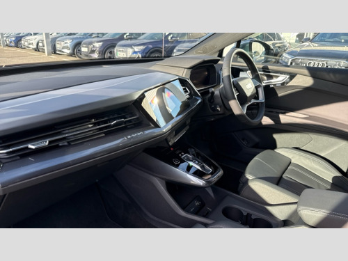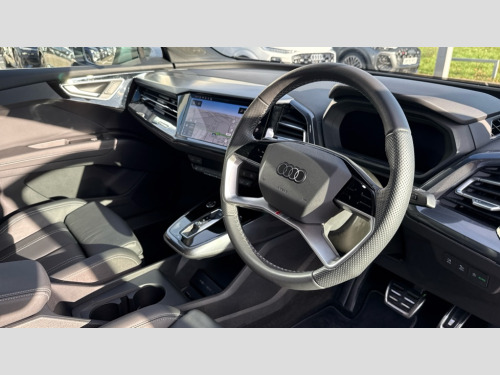 Audi Q4 210kW 45 82kWh S Line 5dr Auto [Leather] Adaptive cruise control with speed limiter, Advanced driver attention and drowsiness monitor, Audi application store, Audi connect safety and service (e-call), Audi drive select, Audi side assist with exit warning and rear cross traffic assist, Audi smartphone interface, Audi Virtual Cockpit - 10.25" display, Bluetooth interface, Camera based traffic sign recognition, Lane departure warning including emergency assist, MMI Navigation Plus with high resolution 11.6 inch touchscreen colour display, Power operated tailgate with sensor controlled release, Progressive steering, Rear view camera, Swerve assist and turn assist, 11KW onboard charger, 175kW DC charging capability, AC and DC charging access point positioned on driver's side rear, Control unit with household plug and charging cable, Mode 2, Type 2 / G (10A), Mode 3 type 2 AC charging cable 22kW, Sport suspension, 2 USB-C ports with charge and data functions, Audi sound system with 8 loudspeakers incl. centre speaker, subwoofer and 6-channel amplifier with total output of 180 watts, DAB Digital radio, Body coloured door mirrors, Contrast bumpers in Manhattan grey, Electrically adjustable/heated/folding/auto dimming door mirrors with integrated LED indications + kerb view function for passenger side, Frameless auto dimming interior rear view mirror, Heat insulating glass windscreen, Heated rear window, LED 3rd brake light, LED daytime running lights, LED Headlights, LED rear lights, Privacy glass - dark-tinted rear window, rear door windows and rear side windows, Projection light in the exterior mirrors, e-tron logo projected from the underside of the exterior mirror onto the ground, Rear side wing doors, Rear wiper, S Line badges on the front wings, S line exterior styling, Single frame grille with a structured, closed surface within an octagonal shape, 3 seat bench in 2nd row, 3 zone automatic air conditioning, 4 way electric lumbar support for driver and front passenger, 40/20/40 split folding rear seat bench, Accent surfaces in gloss black - centre console control panel, switch panel and trim on front doors in gloss black, Black carpets, Black cloth headlining, Comfort auxiliary air conditioning, Door armrests in leatherette, Front centre armrest, Front door sill trims with aluminium inlay, illuminated with S logo, Front sport seats with integrated head restraints, Front/rear floor mats, Heated front seats, Pedals in stainless steel, Rear centre armrest with cupholders, Rear head restraints, Single front passenger seat, Ambient lighting plus pack - Q4 E-tron, Gloss styling pack - Q4 E-tron, Non smoking pack - Q4 E-tron, 3x3 point rear seatbelts, Acoustic vehicle alerting system, Audi pre sense basic and rear, Convenience key with safelock, Driver and front passenger airbag with passenger airbag deactivation, Electric child locks, First aid kit with warning triangle and vests, Front side airbags with head airbag system and front interaction airbag, i - Size child seat mounting on the front passenger side and i - Size and top tether on the outer rear seats, Pre-sense front with pedestrian and cyclist detection, Rear seat occupant reminder for child presence detection, Seat belt monitoring, Tyre pressure loss indicator, Anti theft alarm, Anti-theft wheel bolts, Keyless Go, Aluminium look interior elements, Black dashboard, Vehicle tool kit with tyre repair kit