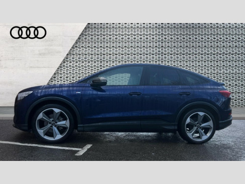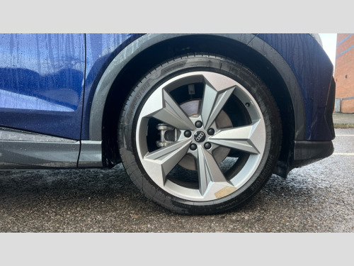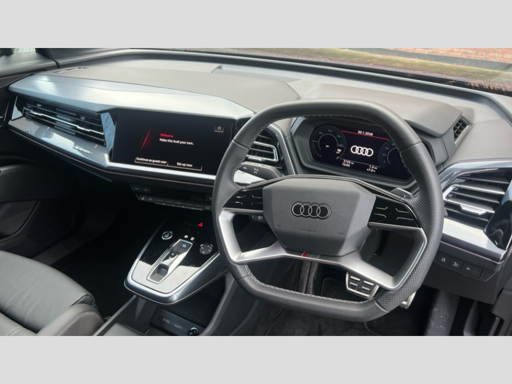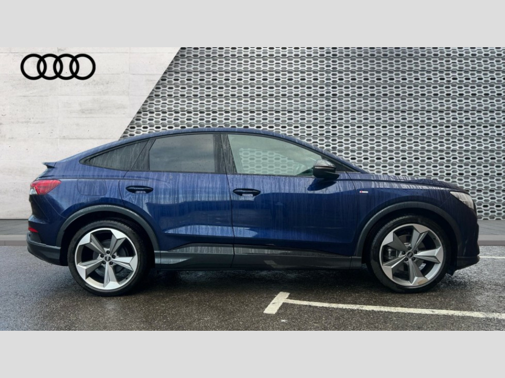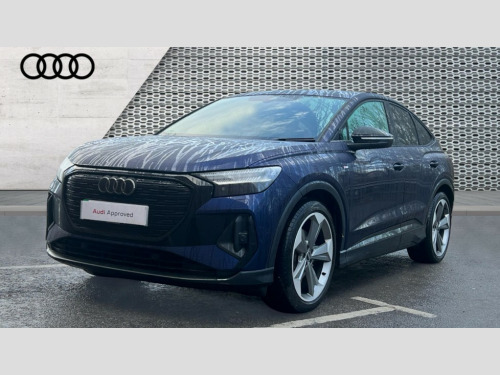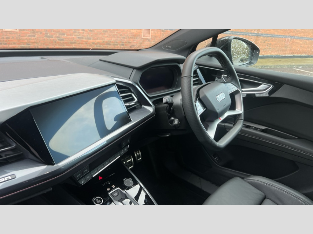 Audi Q4 125kW 35 55kWh Black Edition 5dr Auto Adaptive cruise control with speed limiter, Advanced driver attention and drowsiness monitor, Audi application store, Audi connect safety and service (e-call), Audi drive select, Audi smartphone interface, Audi Virtual Cockpit - 10.25" display, Bluetooth interface, Camera based traffic sign recognition, Lane departure warning including emergency assist, MMI Navigation Plus with high resolution 11.6 inch touchscreen colour display, Power operated tailgate with sensor controlled release, Progressive steering, Rear view camera, Swerve assist and turn assist, 145kW DC charging capability, AC and DC charging access point positioned on driver's side rear, Control unit with household plug and charging cable, Mode 2, Type 2 / G (10A), Mode 3 type 2 AC charging cable 22kW, Sport suspension, 2 USB-C ports with charge and data functions, Audi sound system with 8 loudspeakers incl. centre speaker, subwoofer and 6-channel amplifier with total output of 180 watts, DAB Digital radio, Audi rings and model badging in black (with powertrain designation removed), Contrast bumpers in Manhattan grey, Electrically adjustable/heated/folding/auto dimming door mirrors with integrated LED indications + kerb view function for passenger side, Frameless auto dimming interior rear view mirror, Heat insulating glass windscreen, Heated rear window, LED 3rd brake light, LED daytime running lights, LED Headlights, LED rear lights, Privacy glass - dark-tinted rear window, rear door windows and rear side windows, Projection light in the exterior mirrors, e-tron logo projected from the underside of the exterior mirror onto the ground, Rear side wing doors, Rear wiper, S Line badges on the front wings, S line exterior styling, Single frame grille with a structured, closed surface within an octagonal shape, 3 seat bench in 2nd row, 3 zone automatic air conditioning, 4 way electric lumbar support for driver and front passenger, 40/20/40 split folding rear seat bench, Accent surfaces in gloss black - centre console control panel, switch panel and trim on front doors in gloss black, Black carpets, Black cloth headlining, Comfort auxiliary air conditioning, Door armrests in leatherette, Flat top and bottomed twin-spoke leather multifunction sport steering wheel with shift paddles for recuperation, Front centre armrest, Front door sill trims with aluminium inlay, illuminated with S logo, Front sport seats with integrated head restraints, Front/rear floor mats, Heated front seats, Manual seat adjustment for driver and front passenger seats, Pedals in stainless steel, Rear centre armrest with cupholders, Rear head restraints, Single front passenger seat, Ambient lighting plus pack - Q4 E-tron, Black styling pack plus - Q4 E-tron, Non smoking pack - Q4 E-tron, 3x3 point rear seatbelts, Acoustic vehicle alerting system, Convenience key with safelock, Driver and front passenger airbag with passenger airbag deactivation, Electric child locks, First aid kit with warning triangle and vests, Front side airbags with head airbag system and front interaction airbag, i - Size child seat mounting on the front passenger side and i - Size and top tether on the outer rear seats, Pre-sense front with pedestrian and cyclist detection, Rear seat occupant reminder for child presence detection, Seat belt monitoring, Tyre pressure loss indicator, Anti theft alarm, Anti-theft wheel bolts, Keyless Go, Aluminium look interior elements, Black dashboard, 21" 5 arm rotor evo Audi Sport alloy wheels in matt grey, gloss turned finish and tyre seal technology, Vehicle tool kit