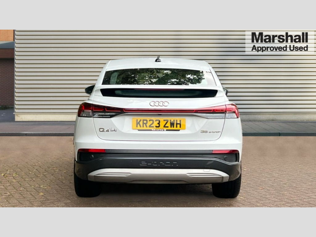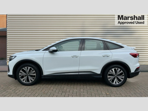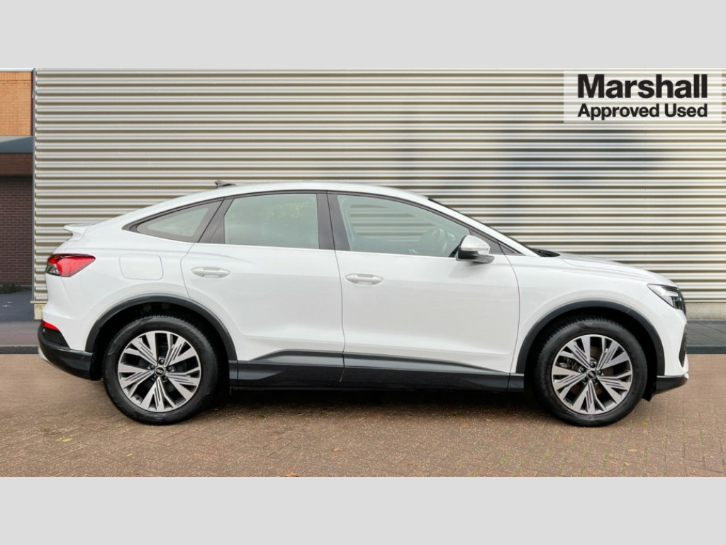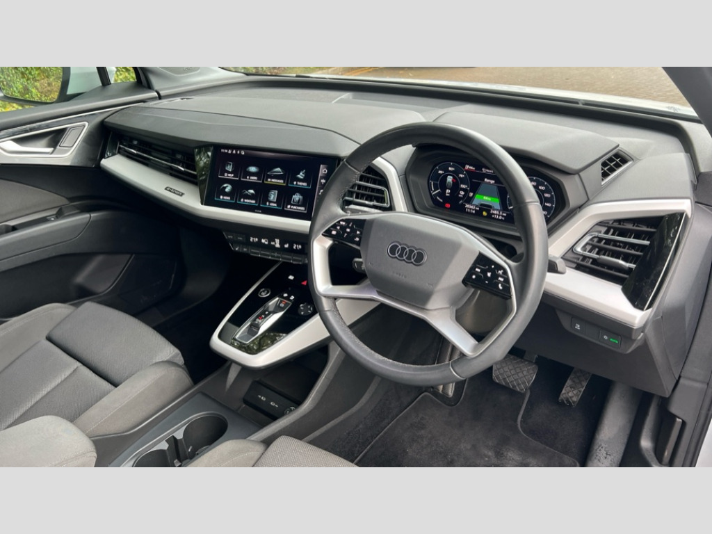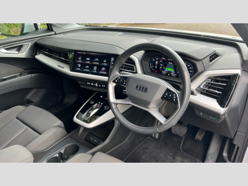 Audi Q4 125kW 35 55kWh Sport 5dr Auto Audi connect safety and service (e-call), Audi drive select, Audi Smartphone Interface with wireless functionality, Audi Virtual Cockpit - 10.25" display, Bluetooth interface, Camera based traffic sign recognition, Lane departure warning system, MMI Navigation Plus with high resolution 11.6 inch touchscreen colour display, Power operated tailgate, Progressive steering, Swerve assist and turn assist, 100kW DC charging capability, 7.2 kw On board Charger, AC and DC charging access point positioned on the rear right, Compact e-tron charging system, Household plug type G (GB), Industry plug CEE 32 A/230 V/6 h/long + straight, Mode 3 AC charging cable 22 kW, 2 USB-C ports with charge and data functions, Audi sound system with 8 speakers, DAB Digital radio, 3rd brake light, Acoustic glass windscreen, Body coloured door mirrors, Contrast bumpers in Manhattan grey, Electrically adjustable/heated/folding/auto dimming door mirrors with integrated LED indications + kerb view function for passenger side, Frameless auto dimming interior rear view mirror, LED daytime running lights, Projection light in the exterior mirrors, e-tron logo projected from the underside of the exterior mirror onto the ground, Rear side wing doors, Rear wiper, Single frame grille with a structured, closed surface within an octagonal shape, 3 seat bench in 2nd row, 3 zone automatic air conditioning, 4 way electric lumbar support for driver and front passenger, Accent surfaces in gloss black - centre console control panel, switch panel and trim on front doors in gloss black, Auxiliary air conditioning, Comfort front centre armrest, Door sill trims with aluminium inlay, Driver/passenger manual seat height adjustment, Front and rear head restraints, Front/rear floor mats, Heated front seats, ISOFIX child seat mounting for front passenger and outer rear seats including top tether attachment point of outer rear seats, Single front passenger seat, Steel grey cloth headlining, Gloss styling pack - Q4 E-tron, Non smoking pack - Q4 E-tron, White interior light pack - Q4 E-tron, 3x3 point rear seatbelts, Active vehicle alerting system (AVAS), Driver and front passenger airbag with passenger airbag deactivation, Electric child locks, Front side airbags with head airbags and interaction airbag, Pre-sense front with pedestrian and cyclist detection, Seatbelt warning, Tyre pressure loss indicator, Warning triangle and first aid kit, Anti theft alarm, Anti-theft wheel bolts, Keyless Go, Aluminium look interior elements, Inlay in black paint finish, accent surfaces on the instrument panel and centre console in silver paint effect finish, 19" 5 W spoke aero alloy wheels with graphite grey gloss finish, Tool kit, Tyre repair kit