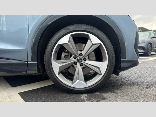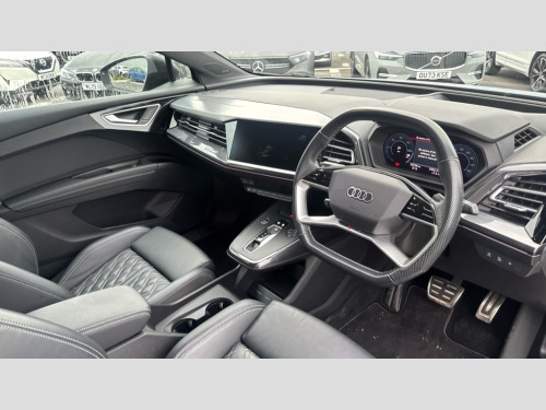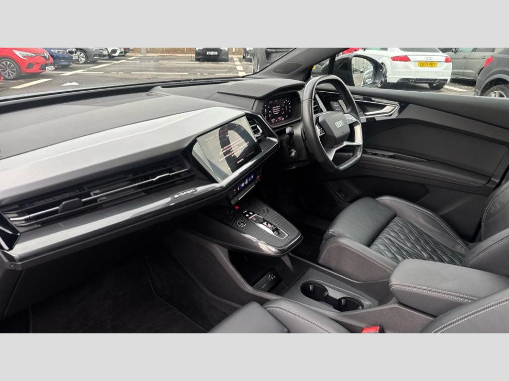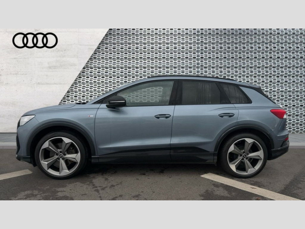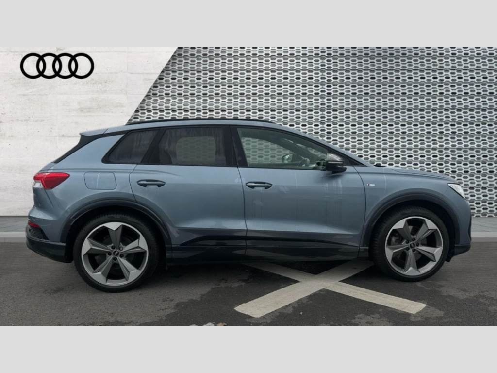 Audi Q4 150kW 40 82.77kWh Vorsprung 5dr Auto Audi connect safety and service (e-call), Audi drive select, Camera based traffic sign recognition, Emergency assist, Lane departure warning system, MMI Navigation Plus with high resolution 10.1 inch touchscreen colour display, Power operated tailgate, Progressive steering, Swerve assist and turn assist, 11KW onboard charger, 125kW DC charging capability, AC and DC charging access point positioned on the rear right, Compact e-tron charging system, Household plug type G (GB), Industry plug CEE 32 A/230 V/6 h/long + straight, Mode 3 AC charging cable 22 kW, Suspension with damping control, 2 USB-C ports with charge and data functions, DAB Digital radio, SONOS premium sound system with 10 speakers, Acoustic glass windscreen, Black roof rails, Contrast bumpers in Manhattan grey, Driver's door mirror memory, Electrically adjustable/heated/folding/auto dimming door mirrors with integrated LED indications + kerb view function for passenger side, Frameless auto dimming interior rear view mirror, Headlight washers, LED daytime running lights, Matrix LED headlights, digital light signatures, dynamic light sequencing and indicators + LED rear lights and illuminated light strip, Panoramic glass sunroof, Projection light in the exterior mirrors, e-tron logo projected from the underside of the exterior mirror onto the ground, Side and rear window privacy glass, Single frame grille with a structured, closed surface within an octagonal shape, 3 zone automatic air conditioning, 4 way electric lumbar support for driver and front passenger, 40:20:40 split folding rear seat and rear centre armrest with two cupholders, Accent surfaces in gloss black - centre console control panel, switch panel and trim on front doors in gloss black, Auxiliary air conditioning, Black cloth headlining, Comfort front centre armrest, Door armrests in leatherette, Electrically adjustable front seats - driver seat with memory, Flat bottom twin spoke leather multifunction sport steering wheel with shift paddles for recuperation, Front and rear head restraints, Front door sill trims with aluminium inlay, illuminated with S logo, Front/rear floor mats, Heated front seats, Stainless steel pedals, Ambient lighting plus pack - Q4 E-tron, Assistance Package Advanced - Q4 E-tron, Black styling pack - Q4 E-tron, Comfort and sound pack - Q4 E-tron, Non smoking pack - Q4 E-tron, Safety plus pack - Q4 E-tron, Technology pack without Audi phone box - Q4 E-tron, 3x3 point rear seatbelts, Active vehicle alerting system (AVAS), Driver and front passenger airbag with passenger airbag deactivation, Electric child locks, Front side airbags with head airbags and interaction airbag, Seatbelt warning, Tyre pressure loss indicator, Warning triangle and first aid kit, Advanced key, Anti theft alarm, Anti-theft wheel bolts, Aluminium look interior elements, Inlay in dark matt brushed aluminium, accent surfaces on instrument panel and centre console trim in chrome paint finish, slate grey, Tool kit, Tyre repair kit