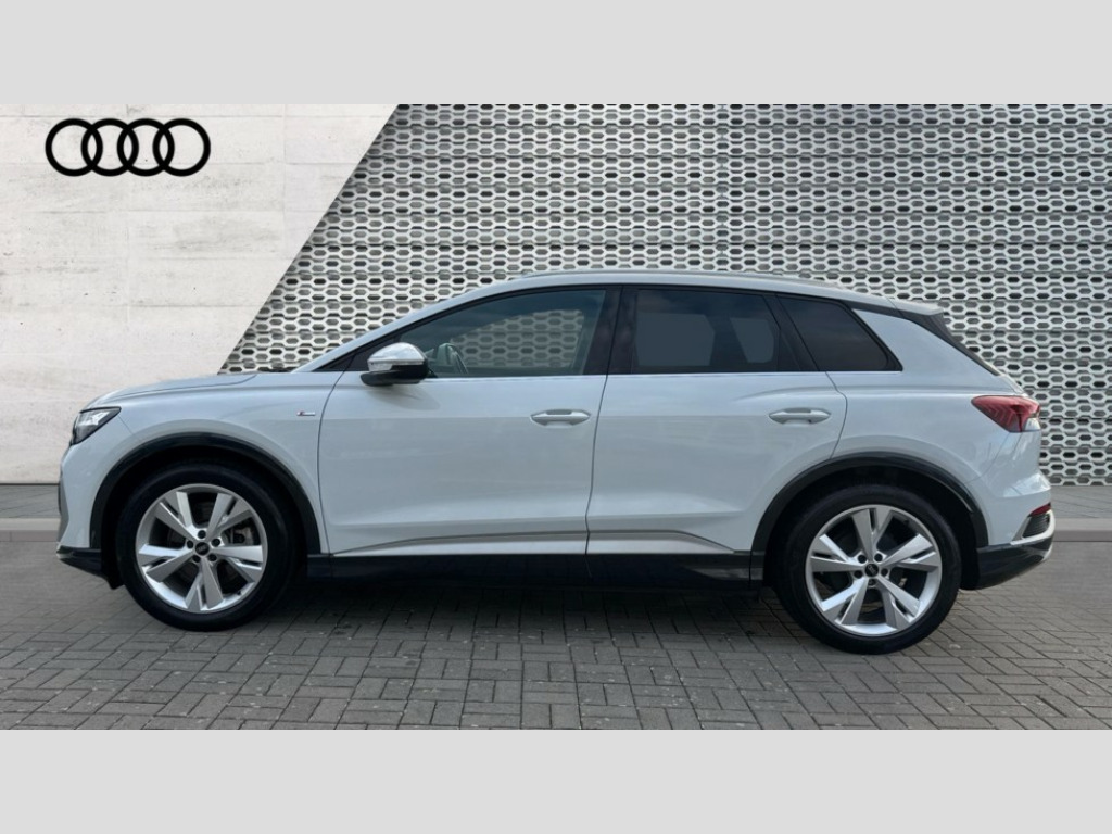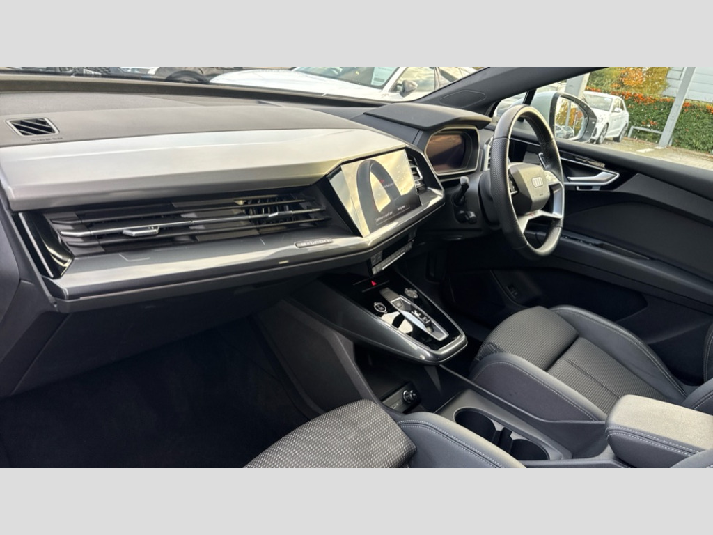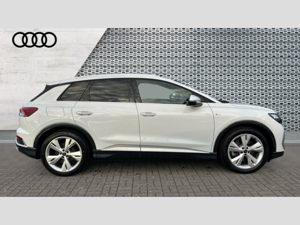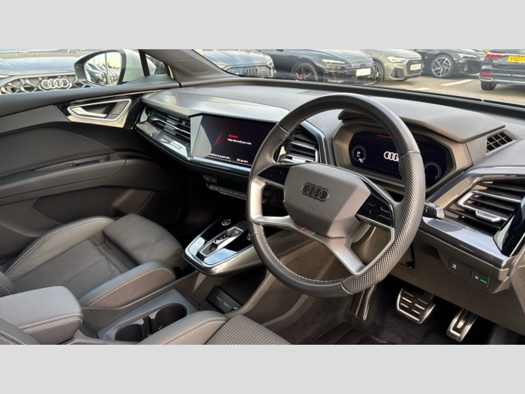 Audi Q4 150kW 40 82kWh S Line 5dr Auto Audi connect safety and service (e-call), Audi drive select, Audi Smartphone Interface with wireless functionality, Audi Virtual Cockpit - 10.25" display, Bluetooth interface, Camera based traffic sign recognition, Lane departure warning system, MMI Navigation Plus with high resolution 11.6 inch touchscreen colour display, Power operated tailgate, Progressive steering, Swerve assist and turn assist, 11KW onboard charger, 135kW DC charging capability, AC and DC charging access point positioned on the rear right, Compact e-tron charging system, Household plug type G (GB), Industry plug CEE 32 A/230 V/6 h/long + straight, Mode 3 AC charging cable 22 kW, Sports suspension with 15mm lower, 2 USB-C ports with charge and data functions, Audi sound system with 8 speakers, DAB Digital radio, 3rd brake light, Acoustic glass windscreen, Aluminium roof rails, Body coloured door mirrors, Contrast bumpers in Manhattan grey, Electrically adjustable/heated/folding/auto dimming door mirrors with integrated LED indications + kerb view function for passenger side, Frameless auto dimming interior rear view mirror, LED daytime running lights, Projection light in the exterior mirrors, e-tron logo projected from the underside of the exterior mirror onto the ground, Rear side wing doors, Rear wiper, S line badges on front wings, S line exterior styling, Side and rear window privacy glass, Single frame grille with a structured, closed surface within an octagonal shape, 3 seat bench in 2nd row, 3 zone automatic air conditioning, 4 way electric lumbar support for driver and front passenger, Accent surfaces in gloss black - centre console control panel, switch panel and trim on front doors in gloss black, Auxiliary air conditioning, Black cloth headlining, Comfort front centre armrest, Driver/passenger manual seat height adjustment, Front and rear head restraints, Front door sill trims with aluminium inlay, illuminated with S logo, Front/rear floor mats, Heated front seats, ISOFIX child seat mounting for front passenger and outer rear seats including top tether attachment point of outer rear seats, Single front passenger seat, Stainless steel pedals, Gloss styling pack - Q4 E-tron, Non smoking pack - Q4 E-tron, 3x3 point rear seatbelts, Active vehicle alerting system (AVAS), Driver and front passenger airbag with passenger airbag deactivation, Electric child locks, Front side airbags with head airbags and interaction airbag, Pre-sense front with pedestrian and cyclist detection, Seatbelt warning, Tyre pressure loss indicator, Warning triangle and first aid kit, Anti theft alarm, Anti-theft wheel bolts, Keyless Go, Aluminium look interior elements, Inlay in dark matt brushed aluminium, accent surfaces on instrument panel and centre console trim in chrome paint finish, slate grey, Tool kit
