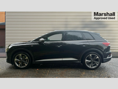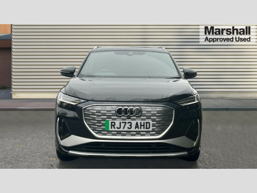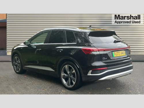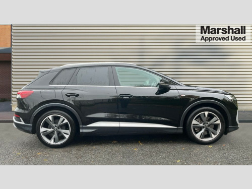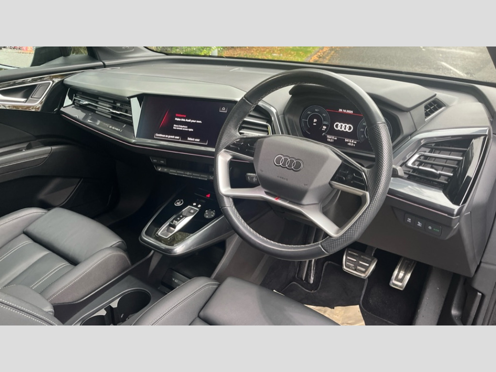 Audi Q4 150kW 40 82kWh S Line 5dr Auto Audi connect safety and service (e-call), Audi drive select, Audi Smartphone Interface with wireless functionality, Audi Virtual Cockpit - 10.25" display, Bluetooth interface, Camera based traffic sign recognition, Lane departure warning system, MMI Navigation Plus with high resolution 11.6 inch touchscreen colour display, Power operated tailgate, Progressive steering, Swerve assist and turn assist, 11KW onboard charger, 135kW DC charging capability, AC and DC charging access point positioned on the rear right, Compact e-tron charging system, Household plug type G (GB), Industry plug CEE 32 A/230 V/6 h/long + straight, Mode 3 AC charging cable 22 kW, Sports suspension with 15mm lower, 2 USB-C ports with charge and data functions, Audi sound system with 8 speakers, DAB Digital radio, 3rd brake light, Acoustic glass windscreen, Aluminium roof rails, Body coloured door mirrors, Contrast bumpers in Manhattan grey, Electrically adjustable/heated/folding/auto dimming door mirrors with integrated LED indications + kerb view function for passenger side, Frameless auto dimming interior rear view mirror, LED daytime running lights, Projection light in the exterior mirrors, e-tron logo projected from the underside of the exterior mirror onto the ground, Rear side wing doors, Rear wiper, S line badges on front wings, S line exterior styling, Side and rear window privacy glass, Single frame grille with a structured, closed surface within an octagonal shape, 3 seat bench in 2nd row, 3 zone automatic air conditioning, 4 way electric lumbar support for driver and front passenger, Accent surfaces in gloss black - centre console control panel, switch panel and trim on front doors in gloss black, Auxiliary air conditioning, Black cloth headlining, Comfort front centre armrest, Driver/passenger manual seat height adjustment, Front and rear head restraints, Front door sill trims with aluminium inlay, illuminated with S logo, Front/rear floor mats, Heated front seats, ISOFIX child seat mounting for front passenger and outer rear seats including top tether attachment point of outer rear seats, Single front passenger seat, Stainless steel pedals, Gloss styling pack - Q4 E-tron, Non smoking pack - Q4 E-tron, 3x3 point rear seatbelts, Active vehicle alerting system (AVAS), Driver and front passenger airbag with passenger airbag deactivation, Electric child locks, Front side airbags with head airbags and interaction airbag, Pre-sense front with pedestrian and cyclist detection, Seatbelt warning, Tyre pressure loss indicator, Warning triangle and first aid kit, Anti theft alarm, Anti-theft wheel bolts, Keyless Go, Aluminium look interior elements, Inlay in dark matt brushed aluminium, accent surfaces on instrument panel and centre console trim in chrome paint finish, slate grey, Tool kit