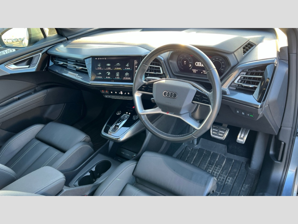 Audi Q4 150kW 40 82kWh S Line 5dr Auto Audi connect safety and service (e-call), Audi drive select, Audi Smartphone Interface with wireless functionality, Audi Virtual Cockpit - 10.25" display, Bluetooth interface, Camera based traffic sign recognition, Lane departure warning system, MMI Navigation Plus with high resolution 11.6 inch touchscreen colour display, Power operated tailgate, Progressive steering, Swerve assist and turn assist, 11KW onboard charger, 135kW DC charging capability, AC and DC charging access point positioned on the rear right, Compact e-tron charging system, Household plug type G (GB), Industry plug CEE 32 A/230 V/6 h/long + straight, Mode 3 AC charging cable 22 kW, Sports suspension with 15mm lower, 2 USB-C ports with charge and data functions, Audi sound system with 8 speakers, DAB Digital radio, 3rd brake light, Acoustic glass windscreen, Body coloured door mirrors, Contrast bumpers in Manhattan grey, Electrically adjustable/heated/folding/auto dimming door mirrors with integrated LED indications + kerb view function for passenger side, Frameless auto dimming interior rear view mirror, LED daytime running lights, Projection light in the exterior mirrors, e-tron logo projected from the underside of the exterior mirror onto the ground, Rear side wing doors, Rear wiper, S line badges on front wings, S line exterior styling, Side and rear window privacy glass, Single frame grille with a structured, closed surface within an octagonal shape, 3 seat bench in 2nd row, 3 zone automatic air conditioning, 4 way electric lumbar support for driver and front passenger, Accent surfaces in gloss black - centre console control panel, switch panel and trim on front doors in gloss black, Auxiliary air conditioning, Black cloth headlining, Comfort front centre armrest, Driver/passenger manual seat height adjustment, Front and rear head restraints, Front door sill trims with aluminium inlay, illuminated with S logo, Front/rear floor mats, Heated front seats, ISOFIX child seat mounting for front passenger and outer rear seats including top tether attachment point of outer rear seats, Single front passenger seat, Stainless steel pedals, Gloss styling pack - Q4 E-tron, Non smoking pack - Q4 E-tron, 3x3 point rear seatbelts, Active vehicle alerting system (AVAS), Driver and front passenger airbag with passenger airbag deactivation, Electric child locks, Front side airbags with head airbags and interaction airbag, Pre-sense front with pedestrian and cyclist detection, Seatbelt warning, Tyre pressure loss indicator, Warning triangle and first aid kit, Anti theft alarm, Anti-theft wheel bolts, Keyless Go, Aluminium look interior elements, Inlay in dark matt brushed aluminium, accent surfaces on instrument panel and centre console trim in chrome paint finish, slate grey, Tool kit